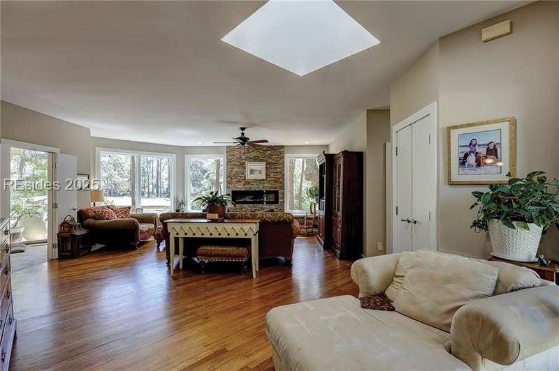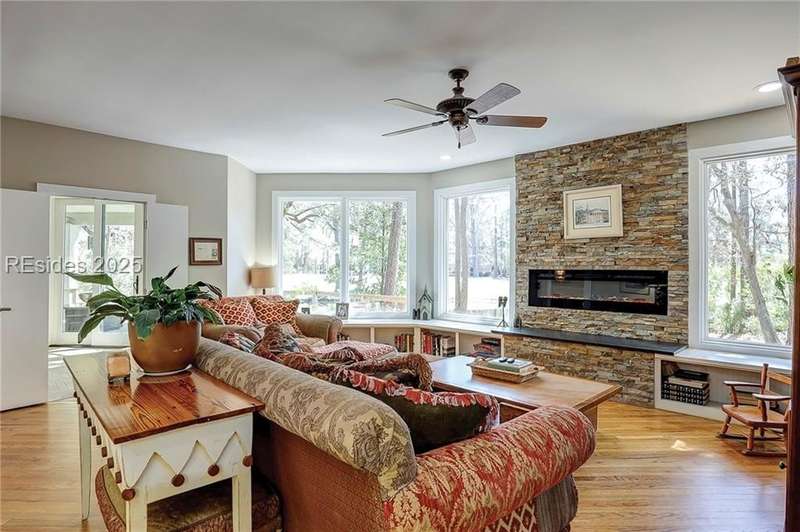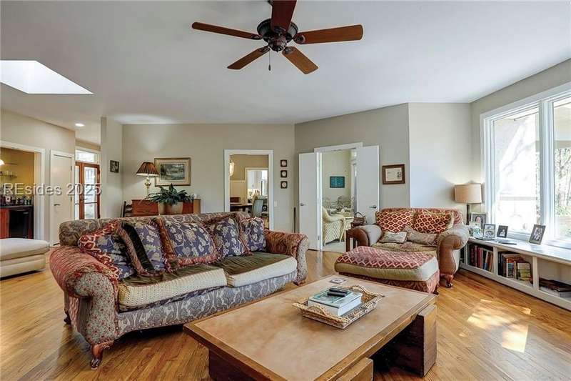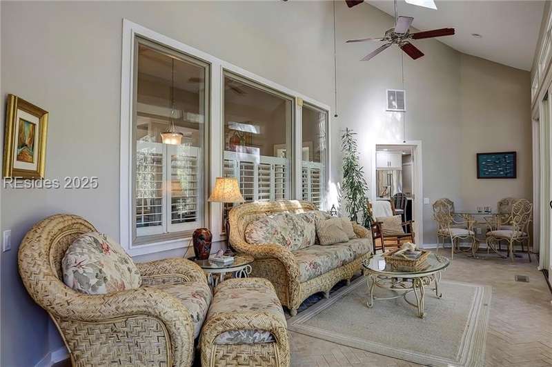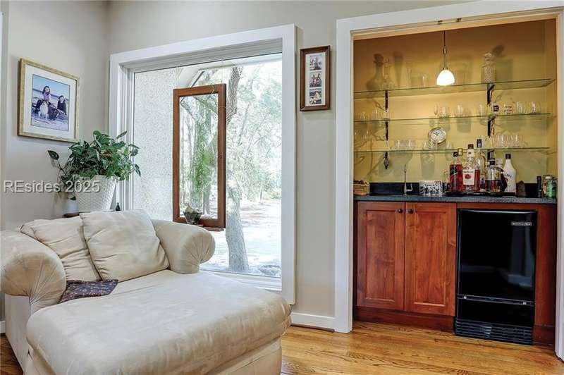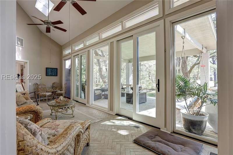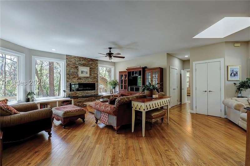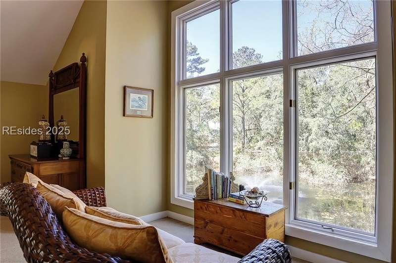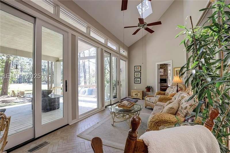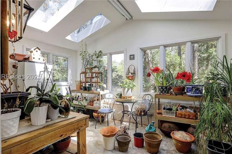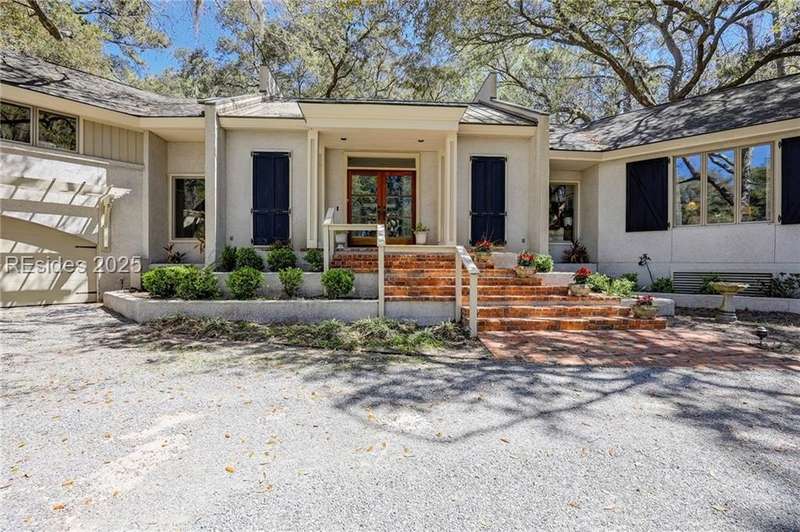 Nestled within the secluded, private Spanish Wells Plantation, this exceptional remodeled four-bedroom home offers a tranquil retreat on a sprawling, approximately 1.21 acre lot. The property is a nature lover's dream, with its unique position bordered by serene lagoons on two sides and a lush, manicured golf course on the third. The home itself sits majestically on a tree-covered lot, where beautiful oaks draped in Spanish moss create a picturesque and timeless setting. The design of the house takes full advantage of its surroundings, with brand new Kitchen and Master Bath complete. Additional features include attached greenhouse, separate entry for bedroom suite, walk-in attic, large covered porch, private fountain overlooking aviary at side elevation. Expansive windows and covered porch provide stunning views of the water and the fairways. Inside, the four bedrooms provide ample space for family and guests, each offering comfort and privacy. The common areas of the house are designed for both relaxation and entertaining, seamlessly blending with the natural beauty outside. This unique property offers a rare combination of privacy, natural elegance, and convenient access to a world-class golf course, making it a true sanctuary. Easy stroll to Spanish Wells Club with golf/tennis/swimming pool/dining, etc... available with optional membership.