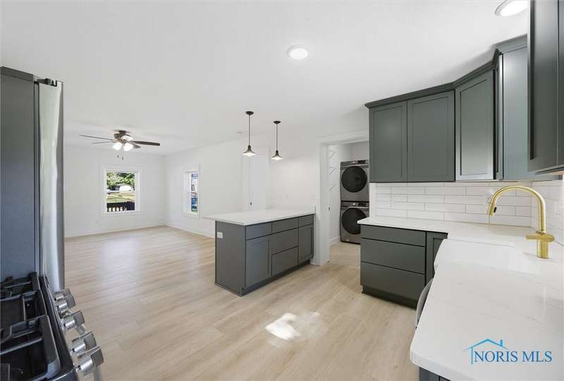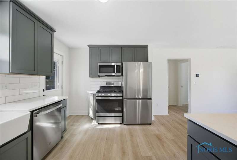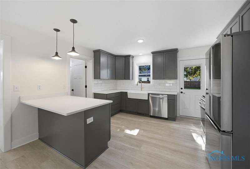 Newly renovated builder-grade home with one-of-a-kind features! This 3 bed, 2 FULL BATH home offers a private primary suite, brand-new flooring, cabinets, countertops, electrical service, furnace and updated tiled glass enclosed shower bathroom. Enjoy modern conveniences with a farmhouse kitchen sink, soft-close cabinets, tiled backsplash, quartz counters, tankless hot water tank, new kitchen appliances, and washer/dryer included. The fully fenced backyard provides peace and privacy, while being just a short walk to charming downtown Sylvania. Nothing to do but MOVE-IN!! Immediate Possession!