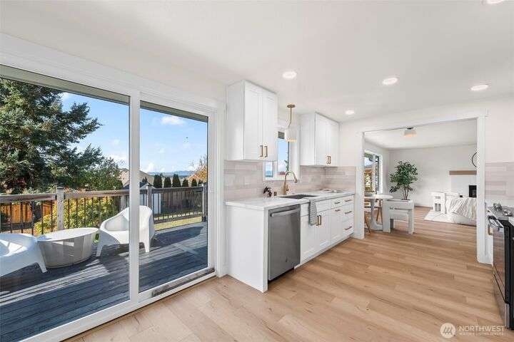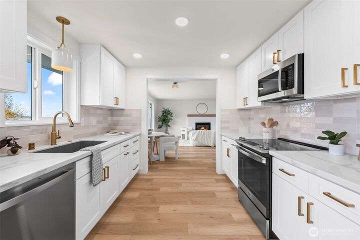 Freshly renovated spotless gem offering modern style & comfort! The stunning kitchen features quartz counters, custom cabinetry & a full stainless appliance package. The home has a new electrical panel, furnace, and all new ducting for peace of mind. The bright main living area showcases large windows with abundant natural light, a custom-tiled fireplace w/ mantle, plus new millwork, doors & high end LVP flooring throughout. The serene en-suite offers upscale finishes & a walk-in shower, while the lower level provides a 2nd fireplace for cozy gatherings. Outdoor living shines with a deck off the kitchen, patio below, storage shed, apple tree, & a fully fenced backyard. Attached garage completes this move-in ready home!