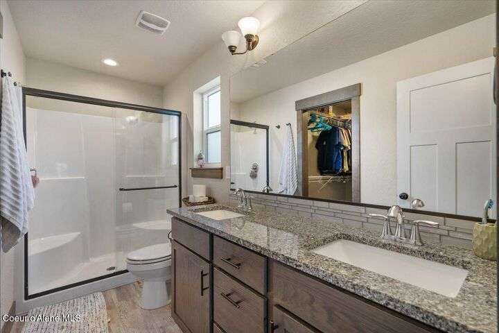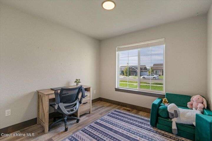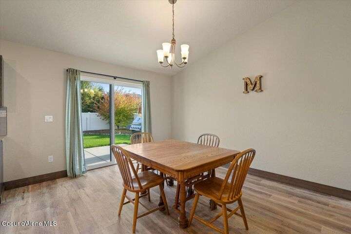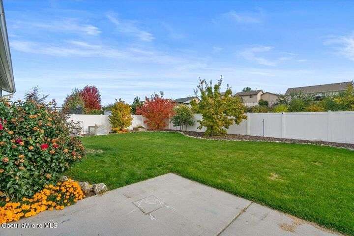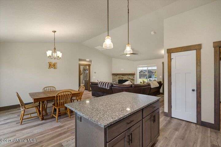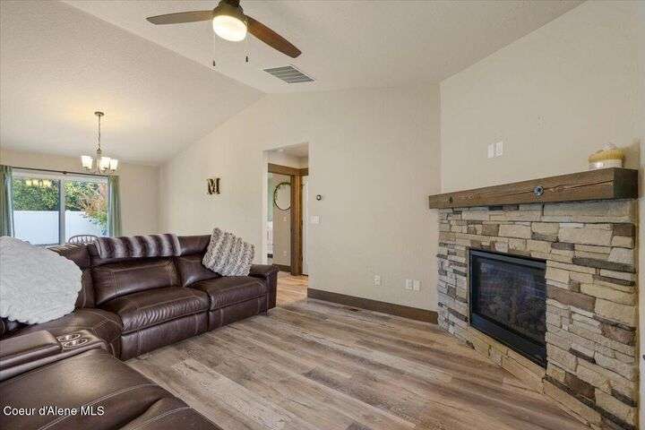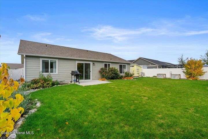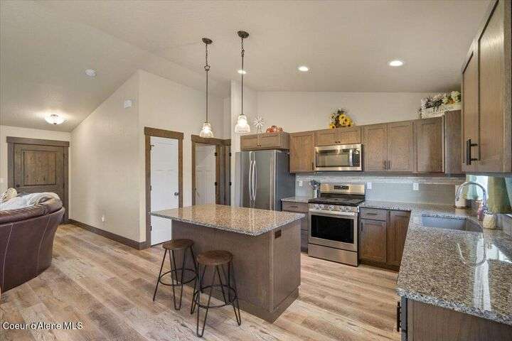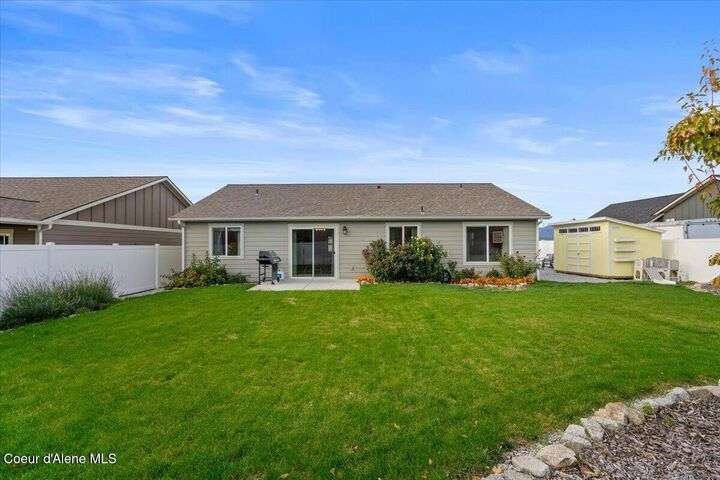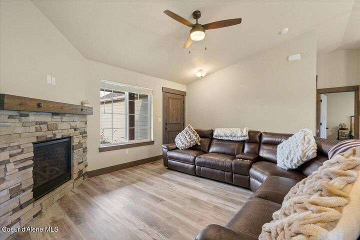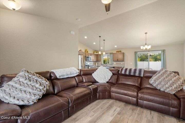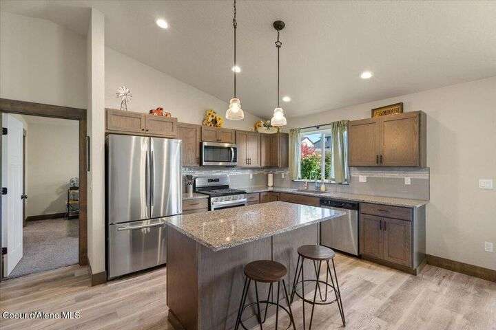 Single-level home featuring 3 bedrooms and 2 bathrooms, offering 1,336 sq ft of comfortable living space. Step inside to discover vaulted ceilings in the great room and easy-care LVP flooring throughout the main areas. The bright, open floor plan is perfect for entertaining guests. The kitchen is a standout with shaker-style Huntwood cabinets, a spacious island, and Moen plumbing fixtures, combining functionality and style. Quality construction sets this home apart, with fiber cement siding adorned with wainscot and gable accents, insulated garage doors with windows, and a highly efficient gas furnace. Curb appeal is enhanced by well-maintained landscaping and sprinklers in both the front and back of the fully fenced yard. Conveniently located near schools, parks, and shopping, this home offers modern living in a prime Post Falls location. Built by Monogram Homes in 2020.