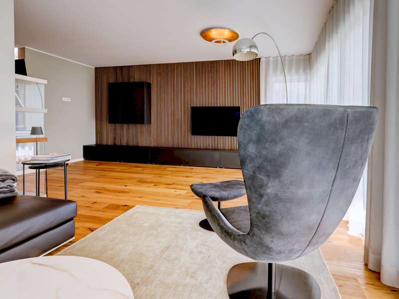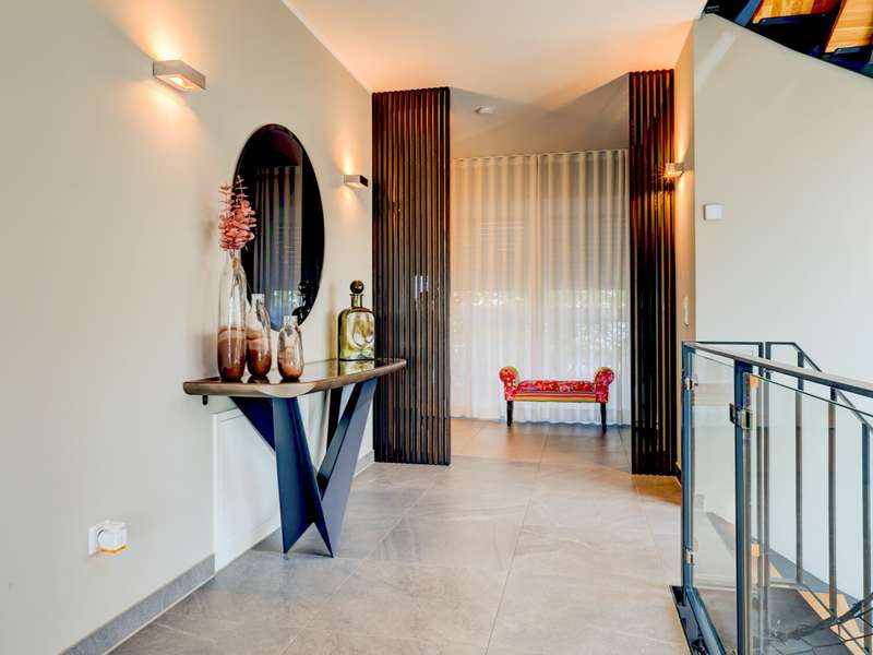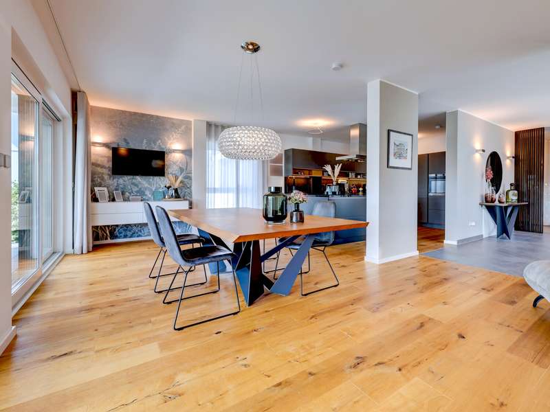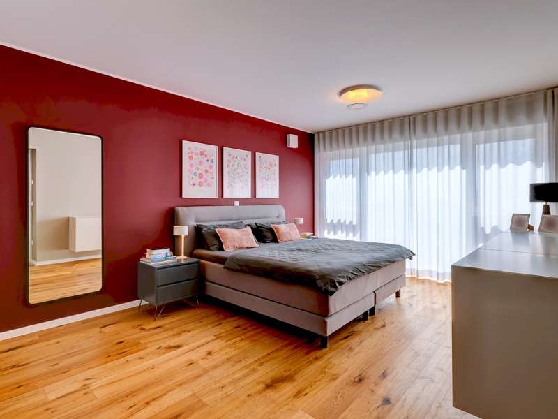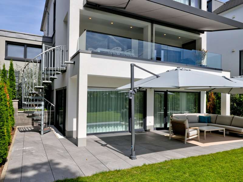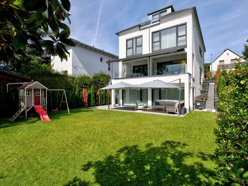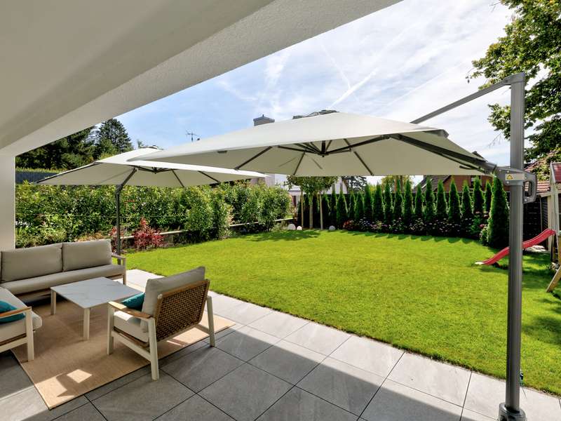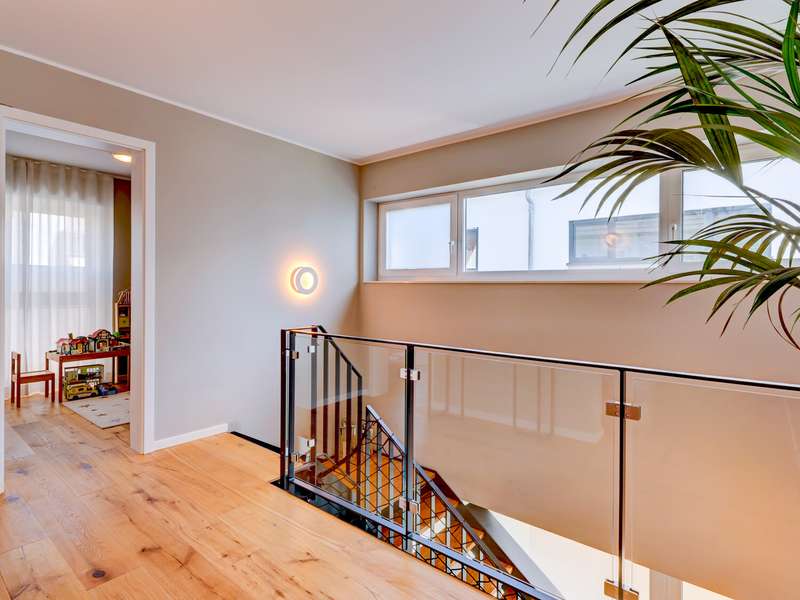 This modern detached house built in 2020 combines contemporary architecture, high-quality fittings and energy-efficient living on a generous living space of approx. 257 m². The house is situated on a plot of approx. 474 m² in a sought-after location characterized by a family-friendly environment. The property has a total of seven rooms, including five bedrooms and three bathrooms, offering larger families plenty of space for individual development. The well thought-out floor plan ensures a pleasant living atmosphere. All living areas are fitted with high-quality wooden floorboards and create a natural, cozy look. The large living area on the garden floor can also be converted into 2 bedrooms with little effort. At the heart of the house is the open-plan living and dining area, which is flooded with natural light thanks to numerous floor-to-ceiling windows. From here, there is direct access to the large terrace, which extends the living space with an attractive open area for relaxing hours or social gatherings. The adjoining open-plan fitted kitchen is equipped with modern appliances and allows for communicative cooking and enjoyment with the family. The house offers a total of three full bathrooms, which are tastefully designed and offer a high level of comfort. The underfloor heating provides all rooms with even, pleasant warmth, while the installed air-to-water heat pump and triple-glazed windows contribute to the A+ energy efficiency rating. Another highlight is the versatile attic studio. This spacious room on the upper floor is ideal as a study, hobby room or guest room and offers access to two balconies. These provide an unobstructed view of the surroundings and offer additional space in the private area. The property includes two terraces and a well-kept, south-facing garden at ground level - ideal conditions for relaxing hours outdoors. A garage and two additional parking spaces are available for your vehicles. Other features include modern sanitary facilities, practical storage areas and a well thought-out lighting concept. The solid construction and efficient building services ensure sustainable, low energy consumption and a high level of living comfort. Overall, this property presents itself as an attractive offer for discerning buyers who value modern living comfort, generous space and high-quality fittings. See the many advantages of this house for yourself during a viewing and arrange a personal appointment.