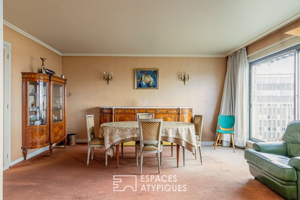Located on the 8th floor of a well-maintained 1970s condominium with elevator, this 88.5 sqm Carrez law dual-aspect apartment seduces with its brightness, its spaciousness, and its exceptional view of Paris's monuments.