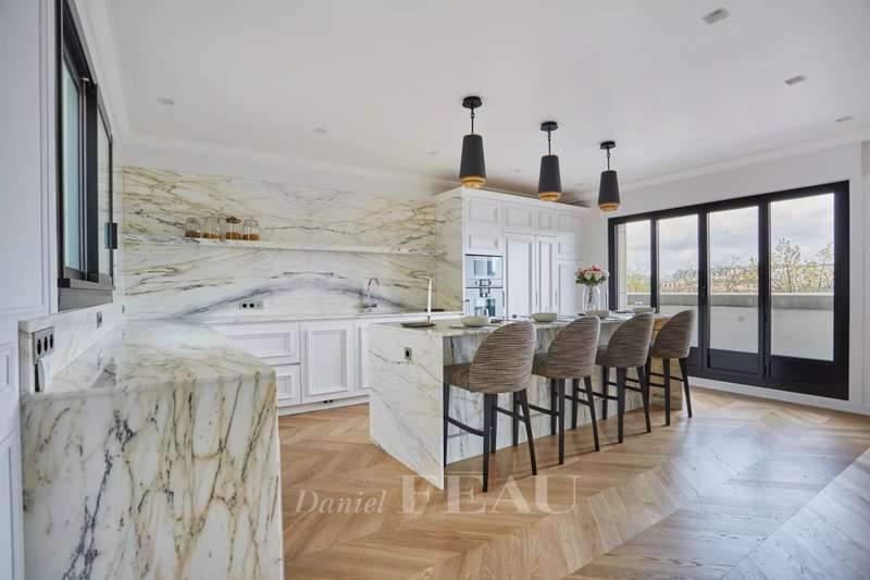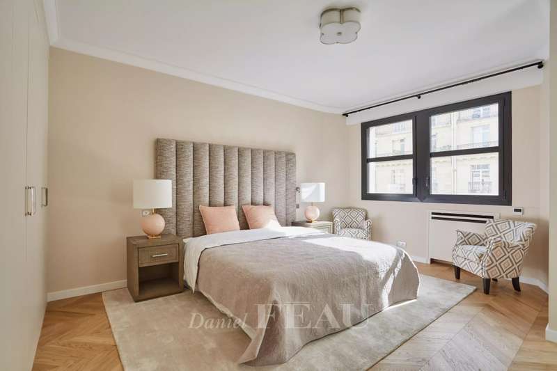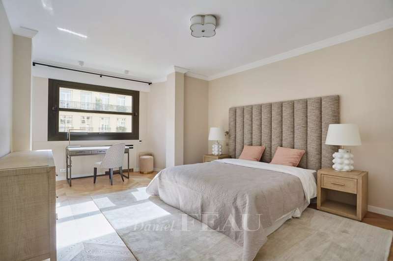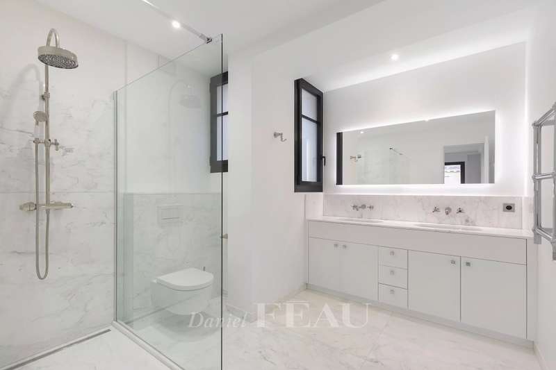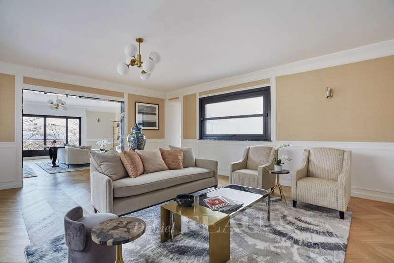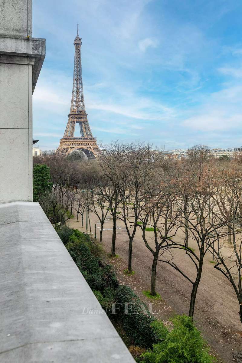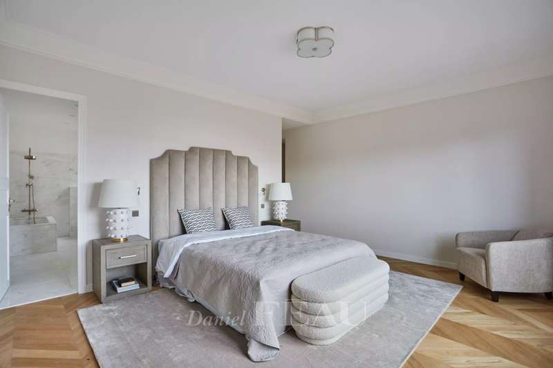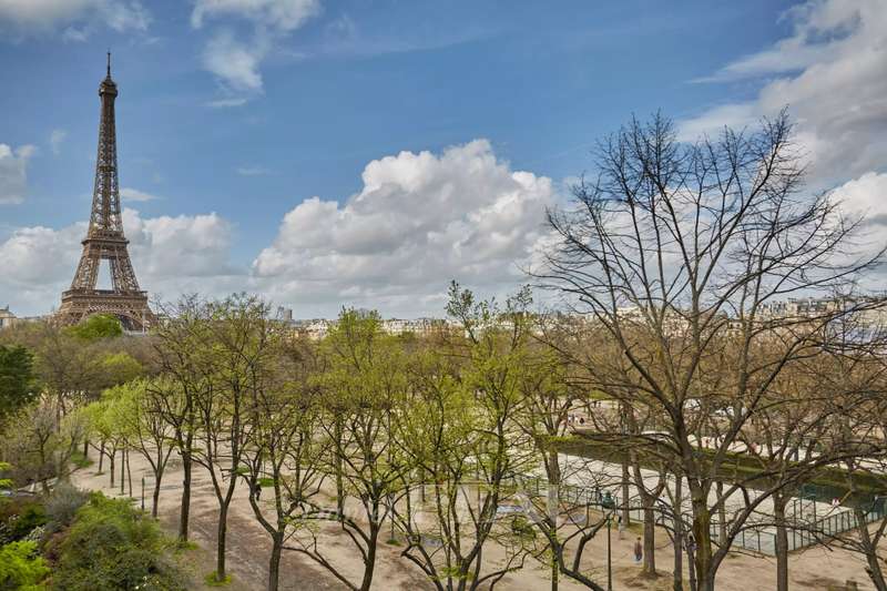 This near 263 sqm apartment on the 3rd floor of a luxurious 1930’s building directly overlooking the Champ de Mars enjoys a view of the Eiffel Tower and the Invalides Dome. Renovated throughout and air-conditioned, it includes a living/reception room, a dining room, a spacious kitchen, four bedrooms each with a shower room and wc, and a guest wc. Three cellars and a parking space in the building. With a near 26 sqm studio apartment for a further 450 000€.