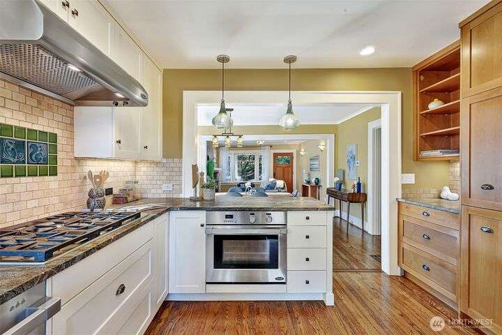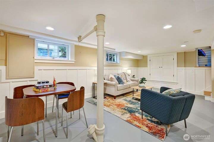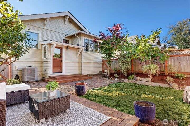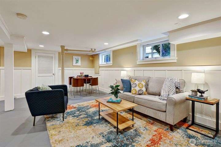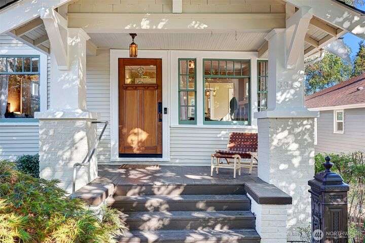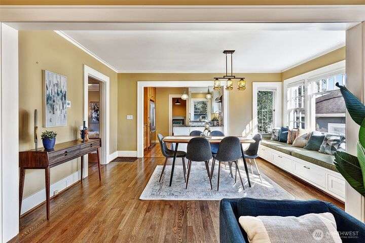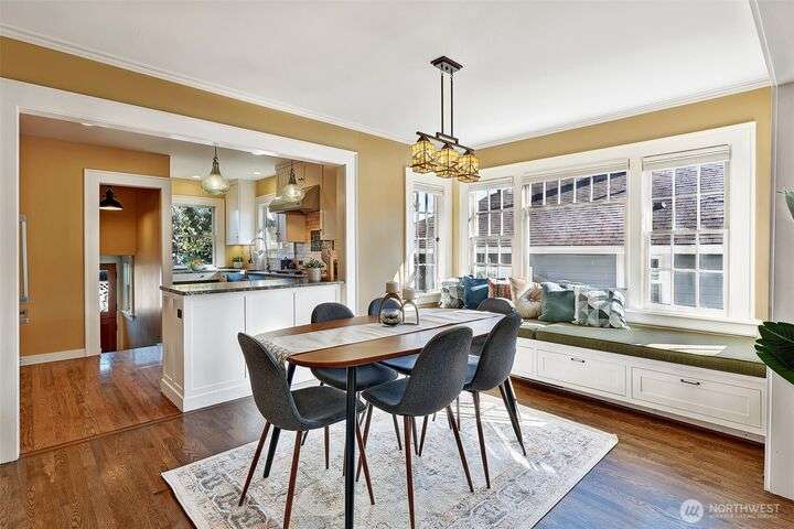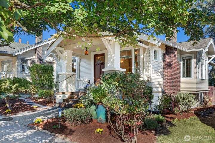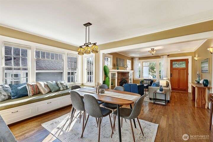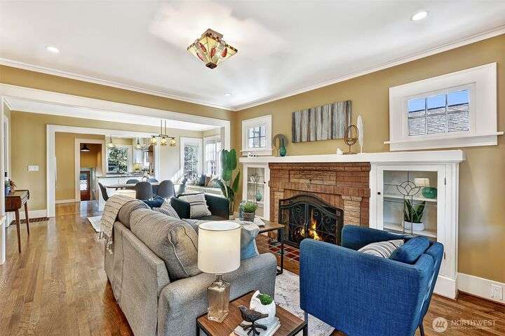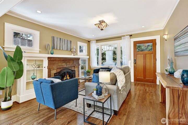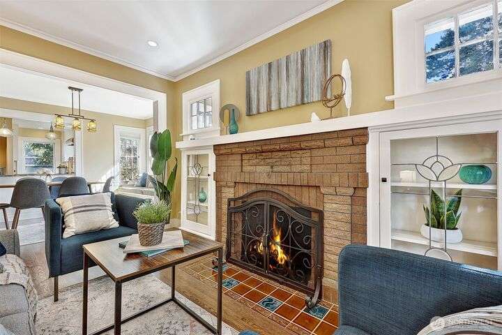 Enchanting 1921 charm meets modern updates in this delightful Wallingford bungalow. Enjoy a newer chef’s kitchen (Fisher-Paykel), original glass-front built-ins, oak floors & remodeled baths. Original brick fireplace flanked by shelving invites you to cozy up with friends or books, while open dining room with window seat is ready for gatherings. Wonderful layout with three bedrooms on the main together, plus great room style living-dining-kitchen flow. Discover flex space on the stylish lower level with rec room, bathroom, and storage galore. Backyard sanctuary with patio, plus a private parking space complete this just-right home. SMART home lights & water monitors are installed--Lutron & Yolink apps. Stroll, bike, or bus to everything!