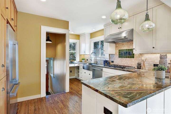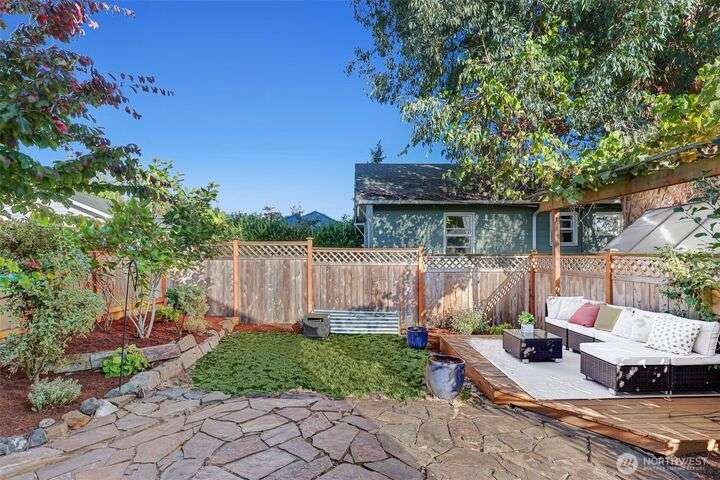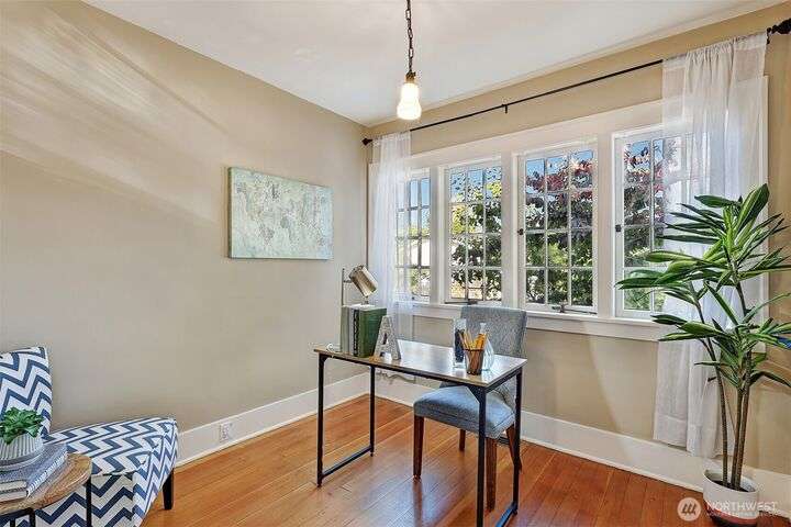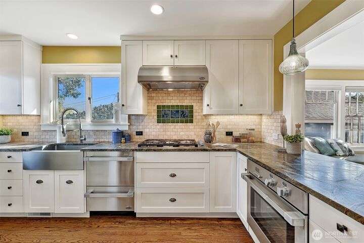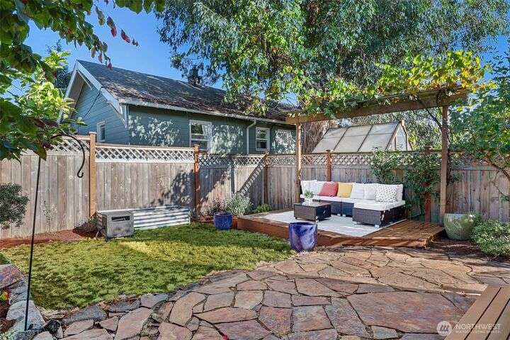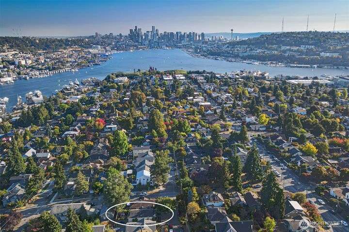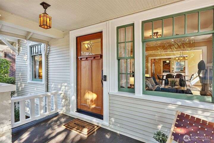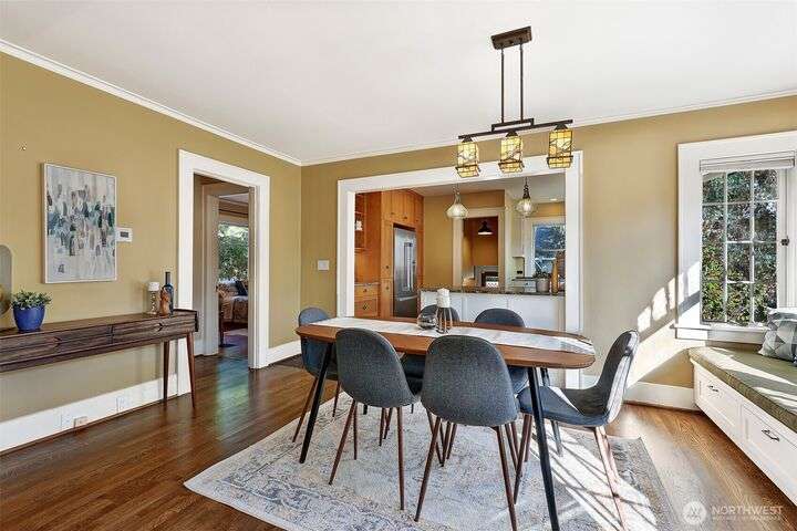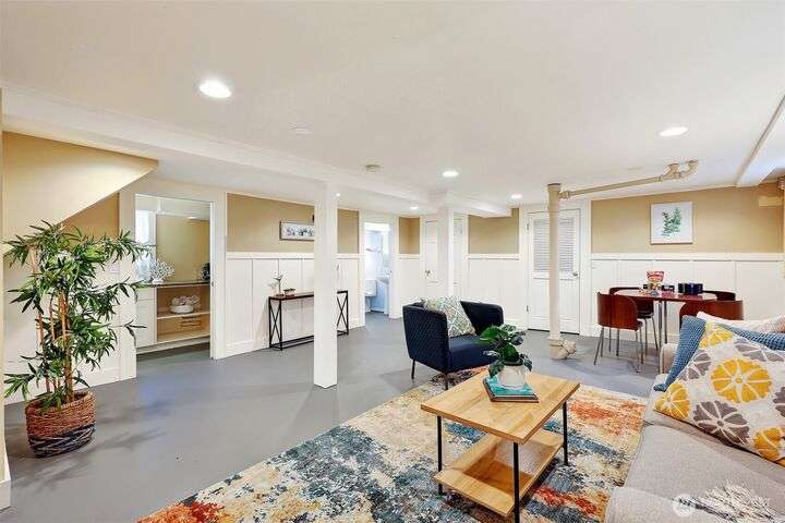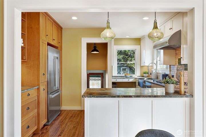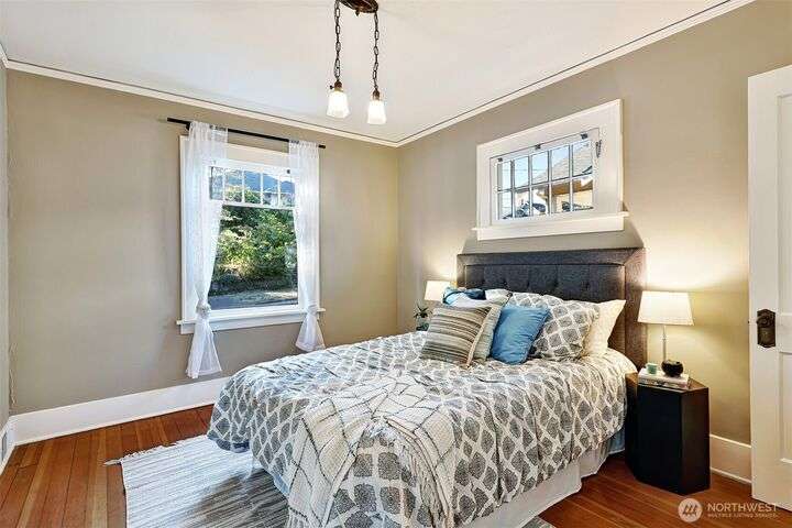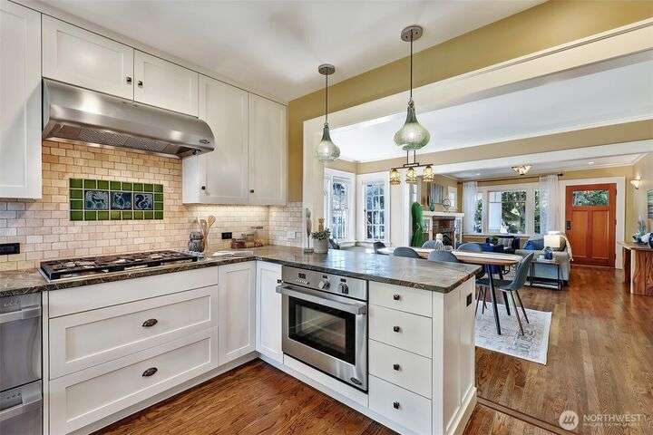 Enchanting 1921 charm meets modern updates in this delightful Wallingford bungalow. Enjoy a newer chef’s kitchen (Fisher-Paykel), original glass-front built-ins, oak floors & remodeled baths. Original brick fireplace flanked by shelving invites you to cozy up with friends or books, while open dining room with window seat is ready for gatherings. Wonderful layout with three bedrooms on the main together, plus great room style living-dining-kitchen flow. Discover flex space on the stylish lower level with rec room, bathroom, and storage galore. Backyard sanctuary with patio, plus a private parking space complete this just-right home. SMART home lights & water monitors are installed--Lutron & Yolink apps. Stroll, bike, or bus to everything!