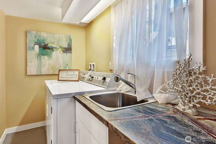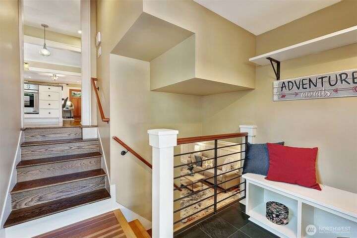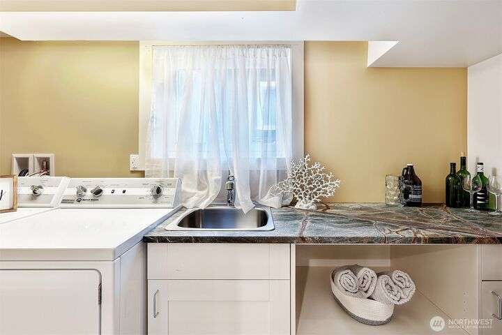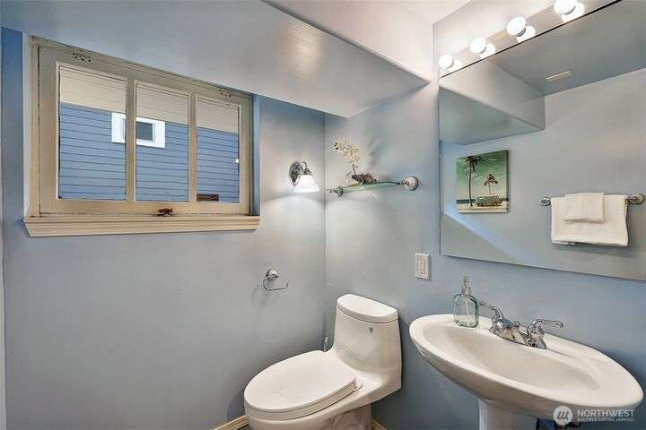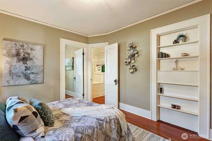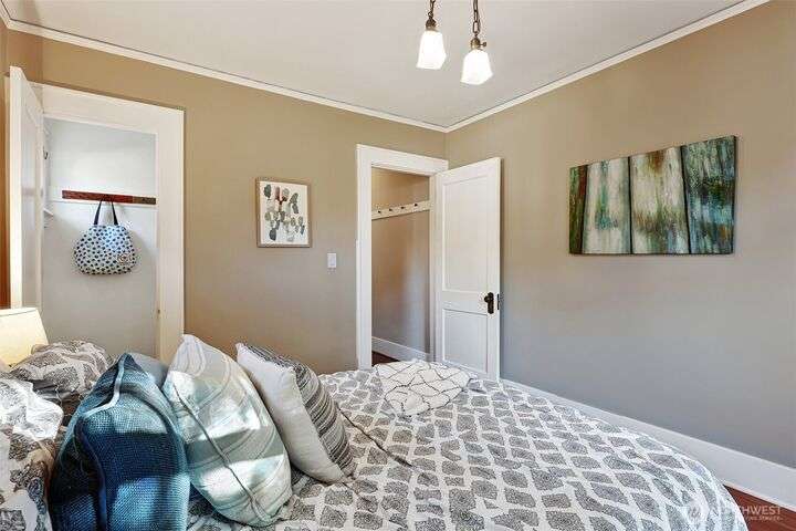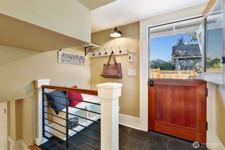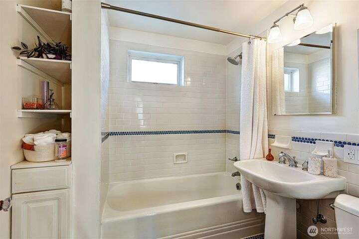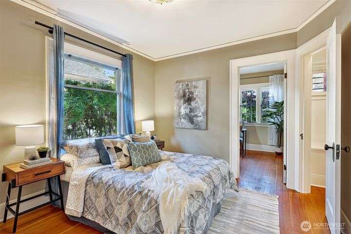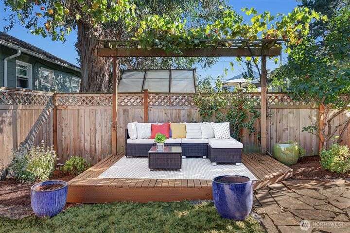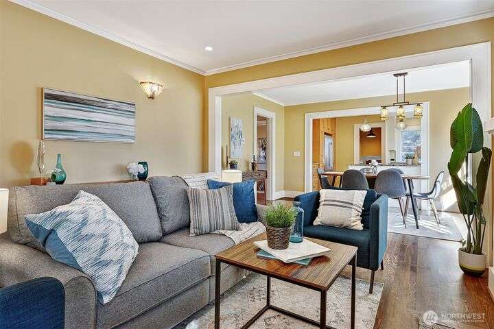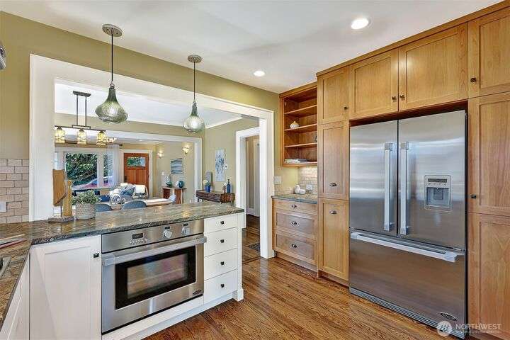 Enchanting 1921 charm meets modern updates in this delightful Wallingford bungalow. Enjoy a newer chef’s kitchen (Fisher-Paykel), original glass-front built-ins, oak floors & remodeled baths. Original brick fireplace flanked by shelving invites you to cozy up with friends or books, while open dining room with window seat is ready for gatherings. Wonderful layout with three bedrooms on the main together, plus great room style living-dining-kitchen flow. Discover flex space on the stylish lower level with rec room, bathroom, and storage galore. Backyard sanctuary with patio, plus a private parking space complete this just-right home. SMART home lights & water monitors are installed--Lutron & Yolink apps. Stroll, bike, or bus to everything!