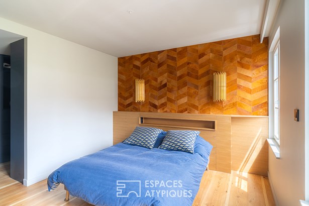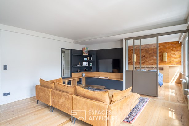 Upon entering, the spacious rooms reveal an elegant atmosphere thanks to restored original parquet flooring and numerous custom-made storage units made of fine wood, punctuated by decorative niches and built-in benches. The living area consists of a large living room and a dining room, offering a convivial space bathed in light. The adjoining master suite is separated by an industrial-style metal door with a glass panel and is complemented by a large custom-made dressing room.
