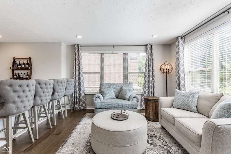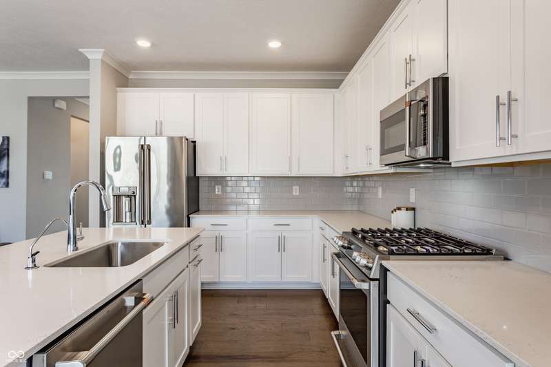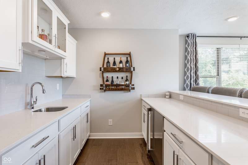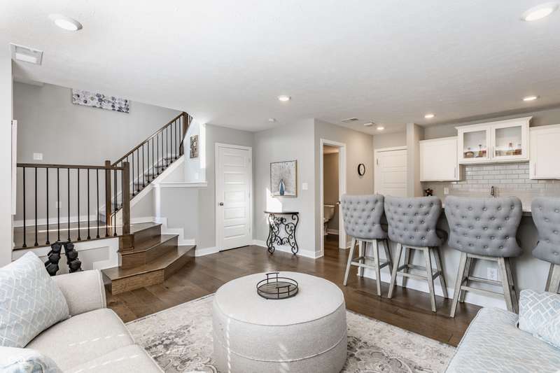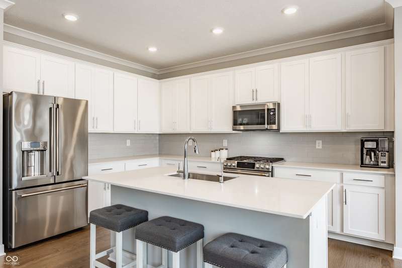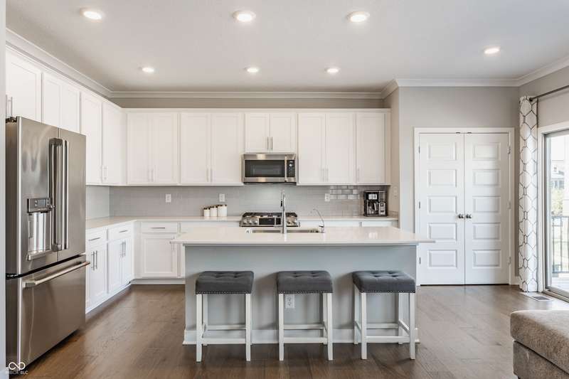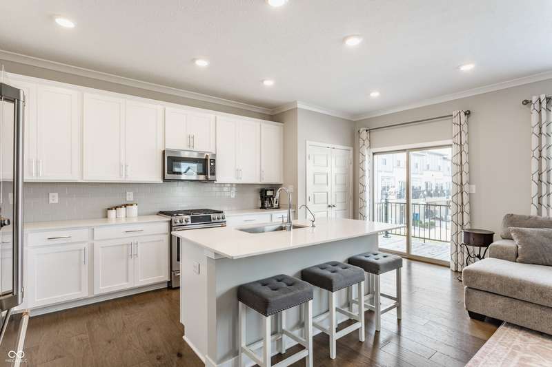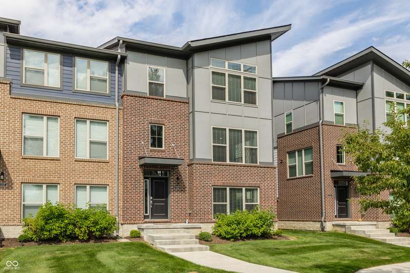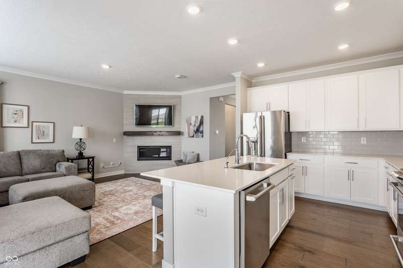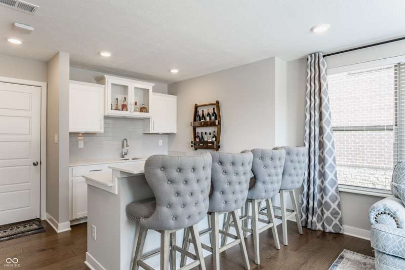 This light-filled END UNIT townhome, overlooking the park, has been meticulously maintained and is move-in ready. The gourmet kitchen features GE Cafe stainless steel appliances, quartz counters, and a spacious island. Enjoy engineered hardwood floors on the lower and main levels, a finished lower level with a wet bar and half bath, and smart home technology built-in throughout. Lawn care and snow removal included! Saxony is one of Fishers' most sought-after communities, offering parks, playgrounds, scenic trails, and even Saxony Lake & Beach. Just minutes from I-69 and Hamilton Town Center's shopping, dining, and nightlife. Experience luxury living at Saxony with this stunning Lennar townhome - welcome home!