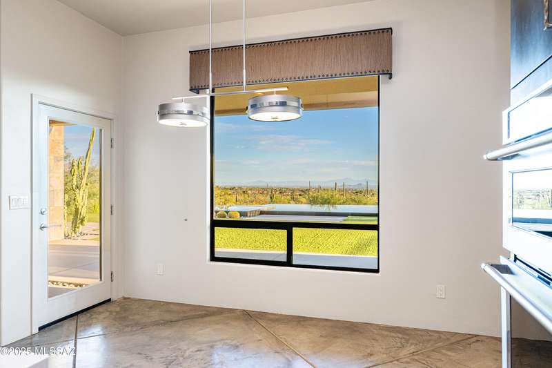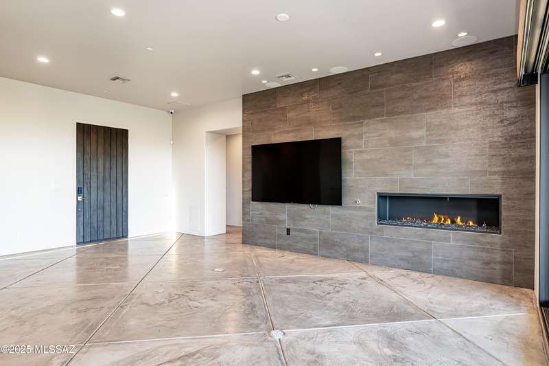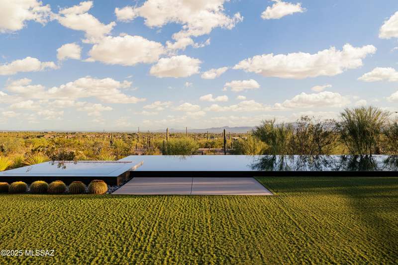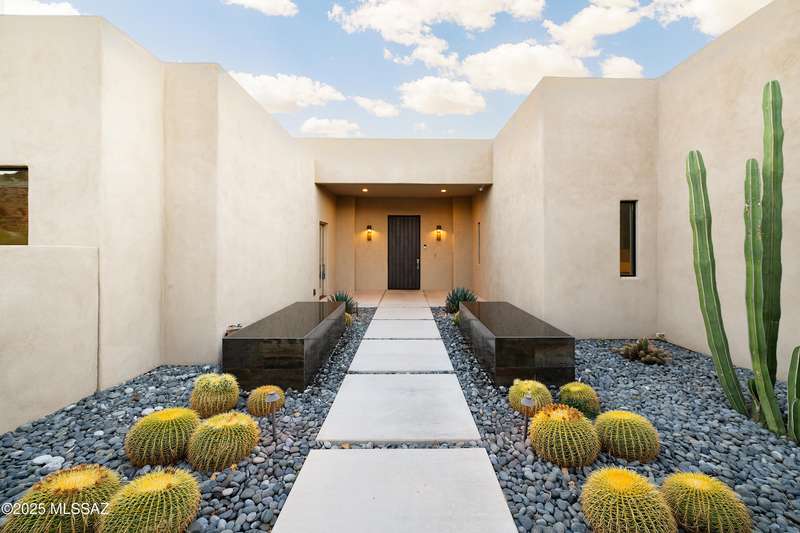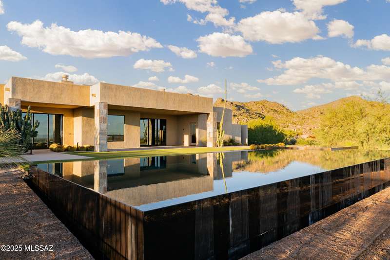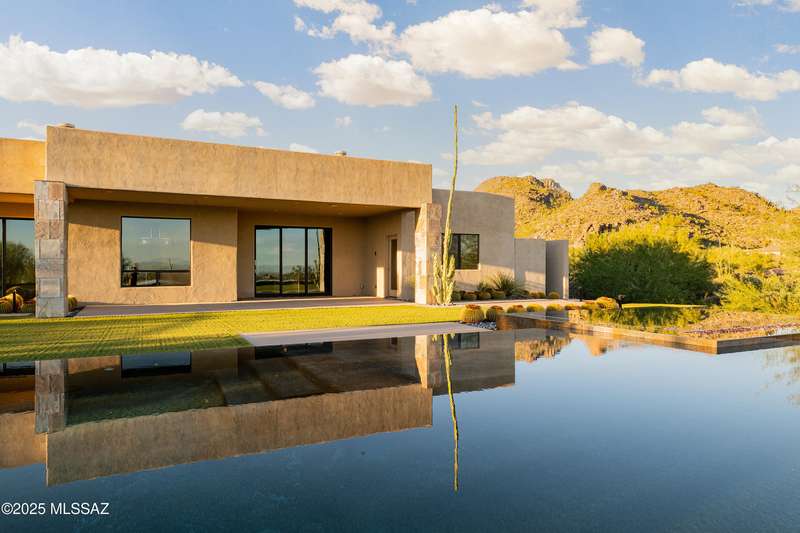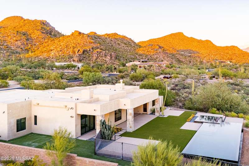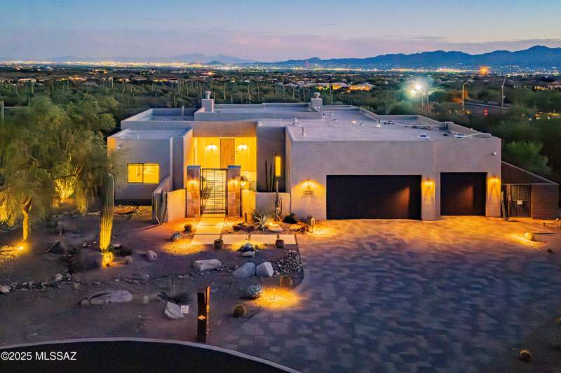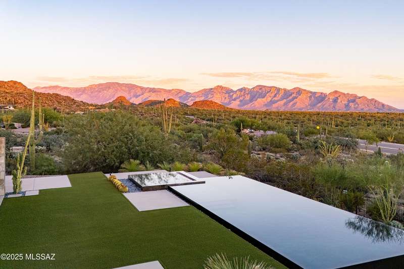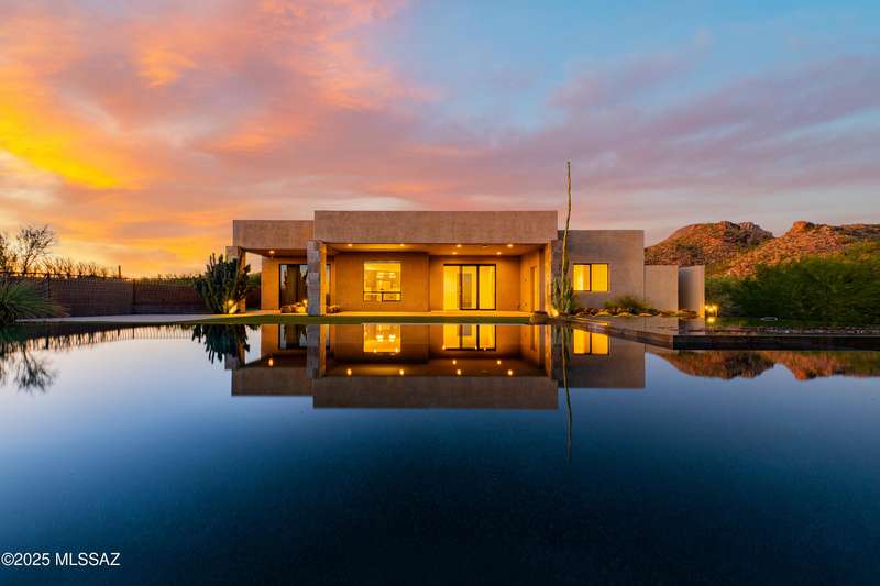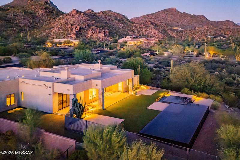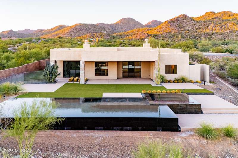 Sleek California Contemporary in Prestigious Canyon Pass at Dove Mountain. Welcome to ultra-contemporary desert living in one of Dove Mountain's most sought-after gated communities--Canyon Pass. This architecturally striking ranch-style home blends modern elegance with breathtaking natural surroundings. Step through the private entry gate and past tranquil fountain features, leading to a spacious, light-filled interior. A dramatic wall of windows immediately draws your eyes to panoramic views of the Tucson skyline, showcased beyond the stunning negative-edge pool and spa. Designed for entertaining, the expansive great room seamlessly connects to a gourmet chef's kitchen featuring a large island, premium appliances, and an open-concept dining area--all centered around a cozy gas fireplace.