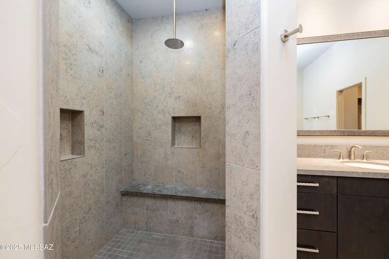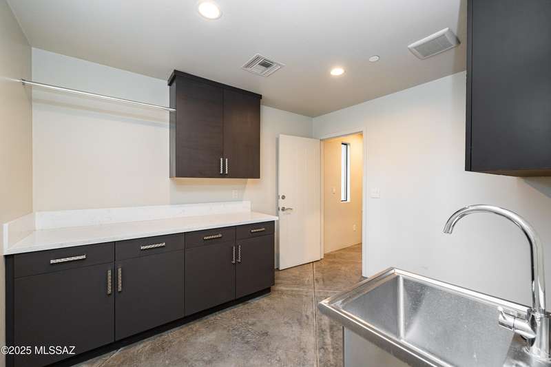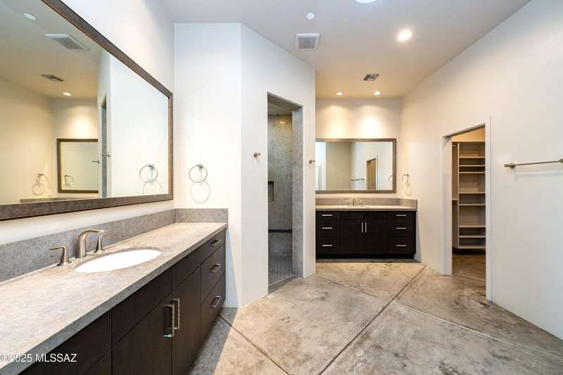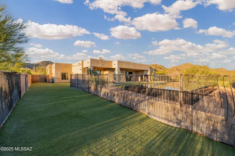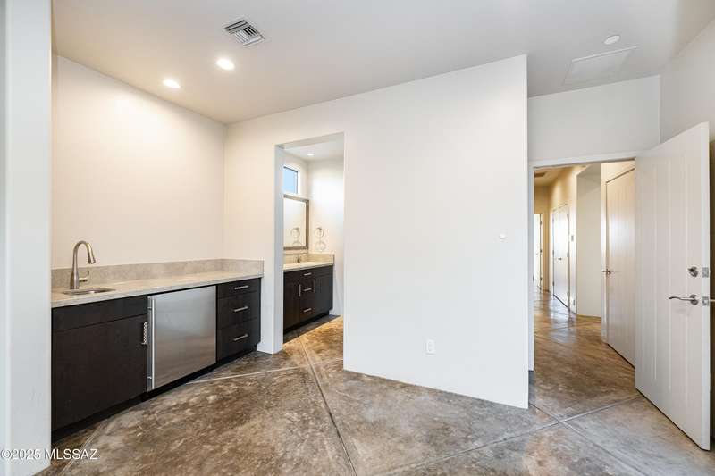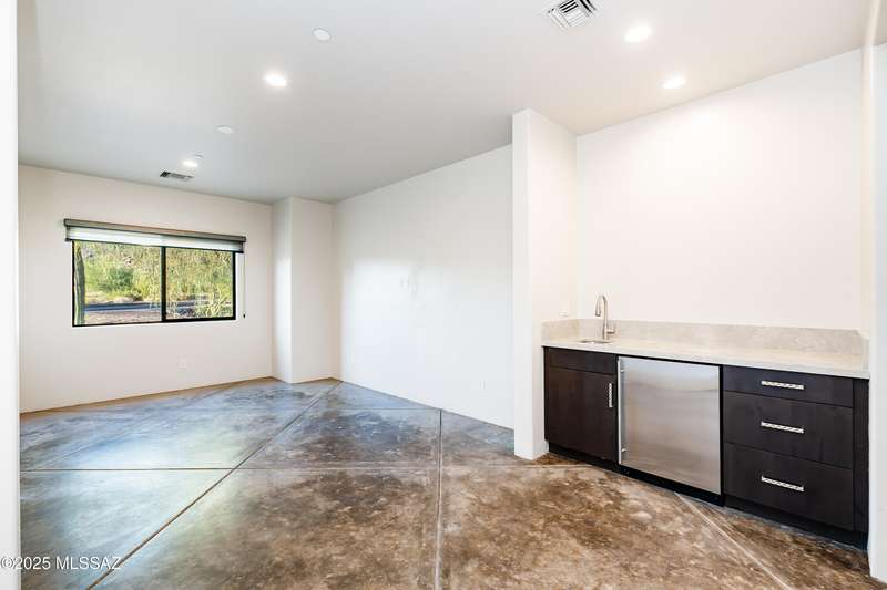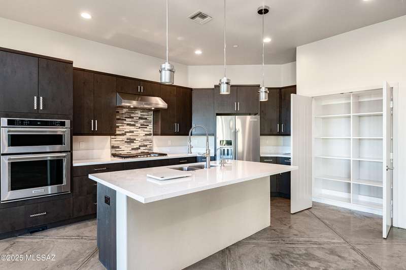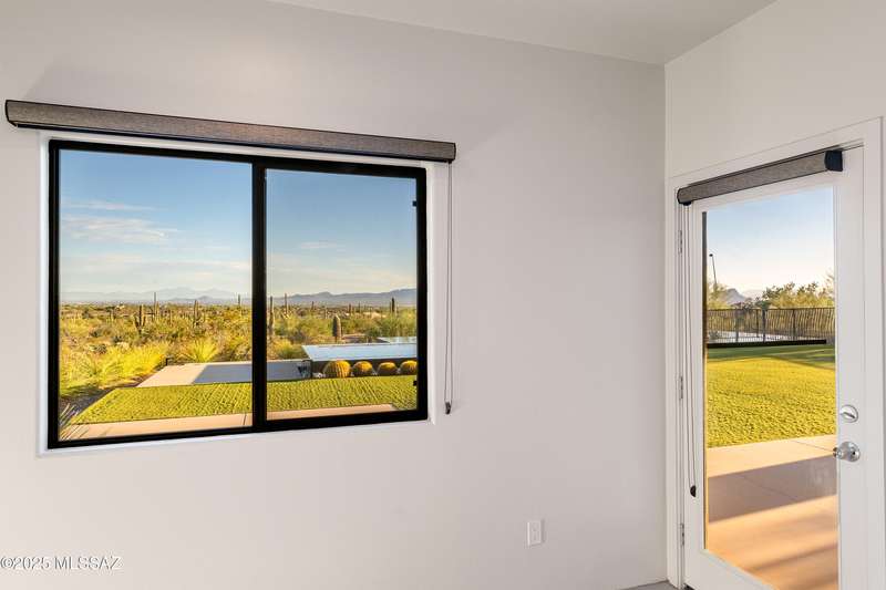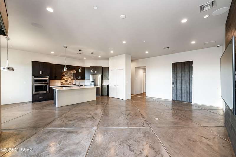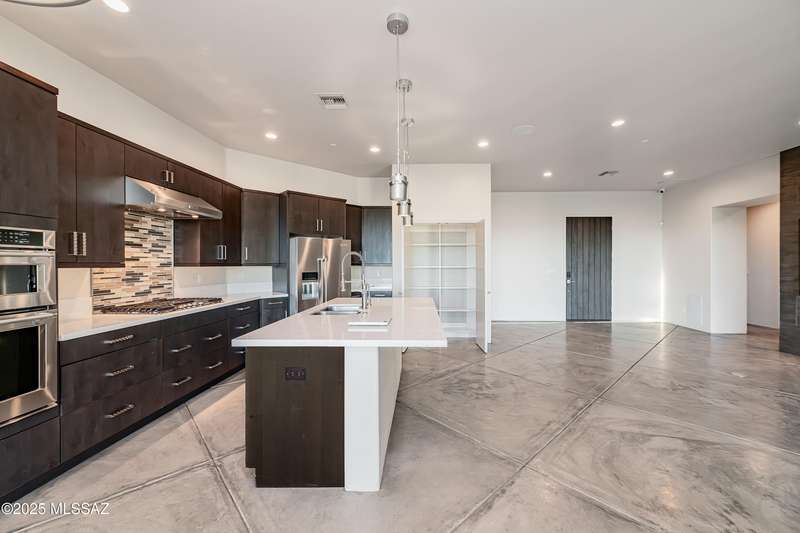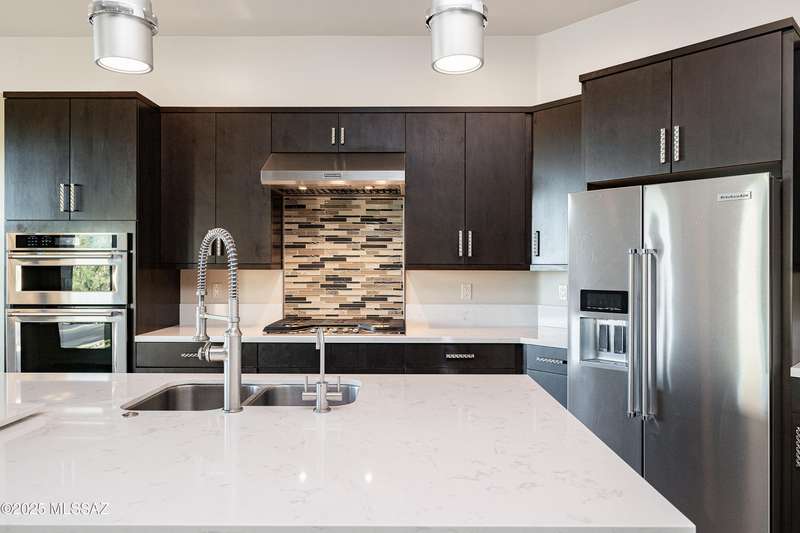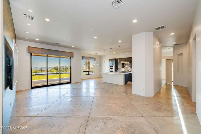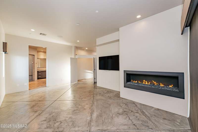 Sleek California Contemporary in Prestigious Canyon Pass at Dove Mountain. Welcome to ultra-contemporary desert living in one of Dove Mountain's most sought-after gated communities--Canyon Pass. This architecturally striking ranch-style home blends modern elegance with breathtaking natural surroundings. Step through the private entry gate and past tranquil fountain features, leading to a spacious, light-filled interior. A dramatic wall of windows immediately draws your eyes to panoramic views of the Tucson skyline, showcased beyond the stunning negative-edge pool and spa. Designed for entertaining, the expansive great room seamlessly connects to a gourmet chef's kitchen featuring a large island, premium appliances, and an open-concept dining area--all centered around a cozy gas fireplace.