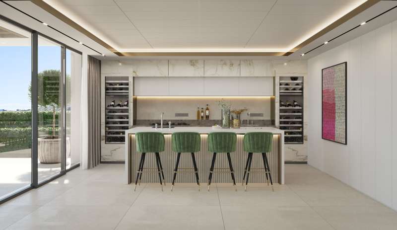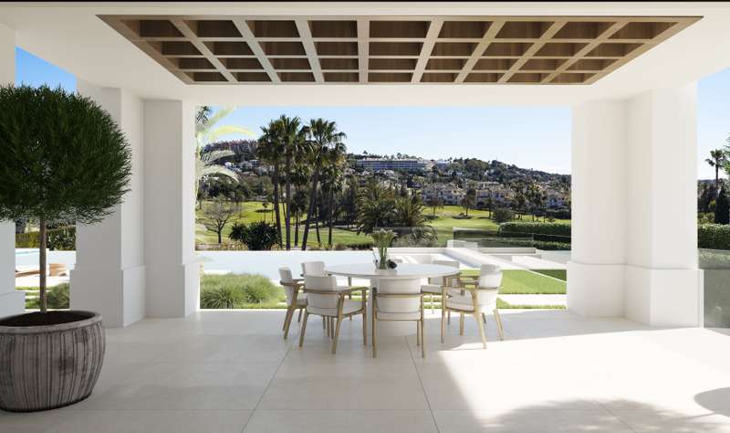 Situated on the front line of the Los Flamingos golf course, this modern villa is a striking example of contemporary design fused with Mediterranean elegance. Set on a 1,600 m² plot, its clean lines and refined geometry blend seamlessly with the surrounding golf landscape, creating a continuous dialogue between interior and exterior spaces. With a built area of 650 m² spread across two levels, plus a spacious basement, the villa features five luxurious bedrooms designed for comfort and privacy. Living areas flow effortlessly, filled with natural light pouring through expansive windows that frame panoramic views of the golf course. Carefully chosen materials—wood, stone, and minimalist finishes—bring warmth and sophistication to every corner. Outside, private gardens and a sparkling swimming pool offer a serene retreat, extending the living experience into the open air. Every detail has been meticulously considered, from functional layouts to the interplay of light, space, and landsca