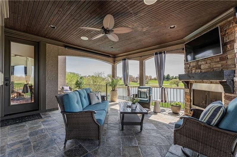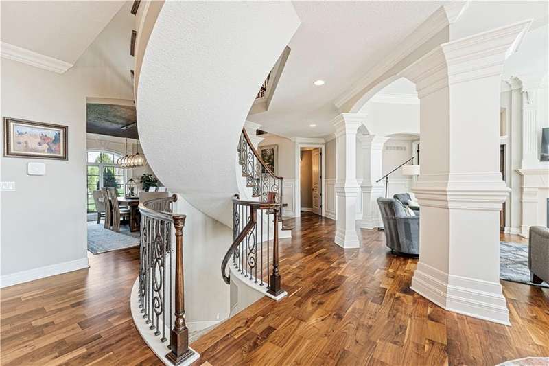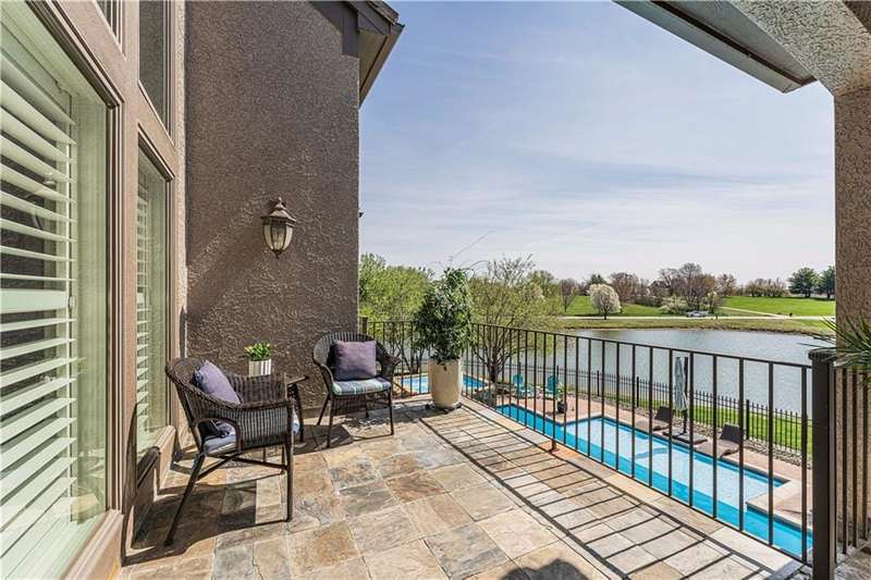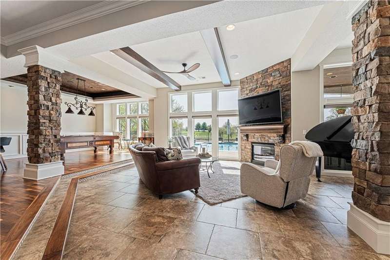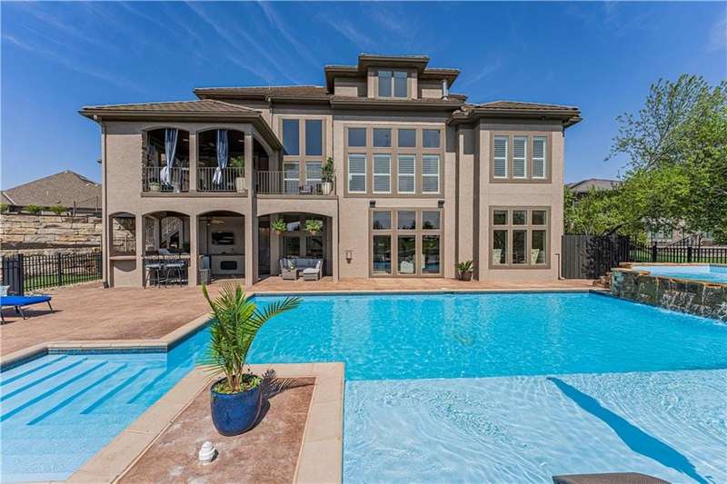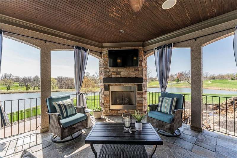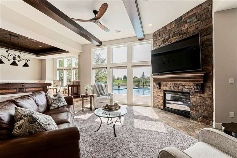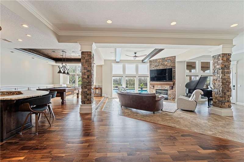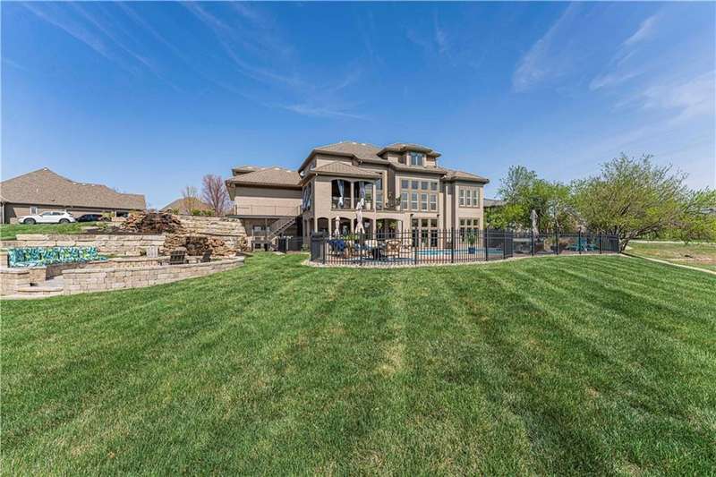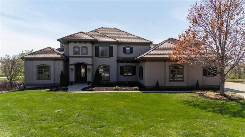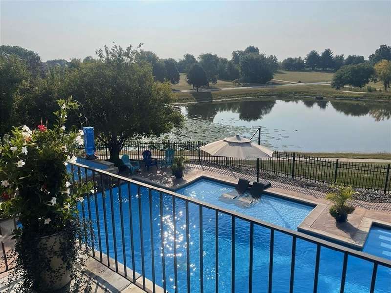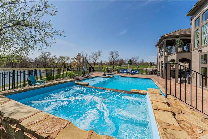 Welcome to this beautifully appointed resort style home, backing to water and featuring updates and designer touches at every turn! Main level living at its finest, with office & formal dining, as well as a gourmet kitchen w/ double ovens, laundry/mud room, great room and beautiful owner's suite. Stunning walnut floors have been refinished, carpet is all new, and there is fresh paint throughout! Upstairs, you'll find 3 additional bedrooms, each with an attached bathroom, along with a loft area for play or study. A bonus room is also available and can be used for so many things: bunkroom, play or office space! The star of the show is the walkout lower level, featuring 10.5 ft ceilings, wet bar, wine cellar, rec room, home theatre, gym AND a basketball court where you can also practice your pickleball moves! Continue the party outside: pool, spa, firepit, outdoor kitchen, covered porch, fresh landscaping and stunning water views! For more outdoor entertainment, the neighborhood offers 3 stocked ponds for fishing, and trails for walking. Beautiful (yes, freshly painted, epoxied and refinished built ins) 4 car garage fits all your vehicle and storage needs. With easy highway access and close to KCI and Northland amenities, the location can't be beat. This is truly an entertainer's dream home- make it yours to enjoy the summer with family and friends!