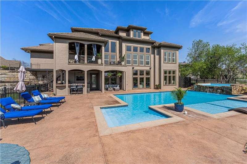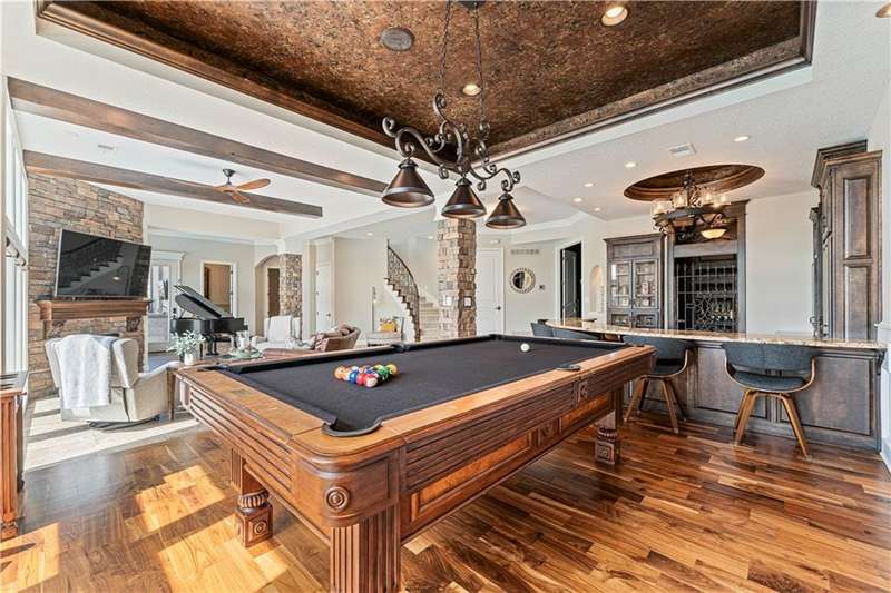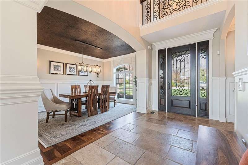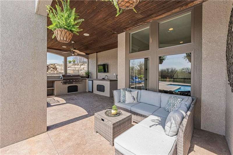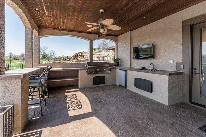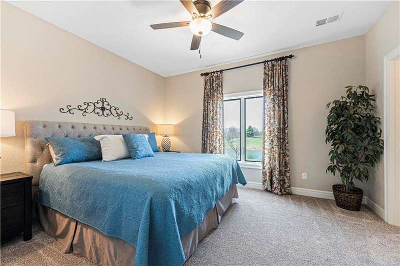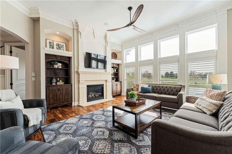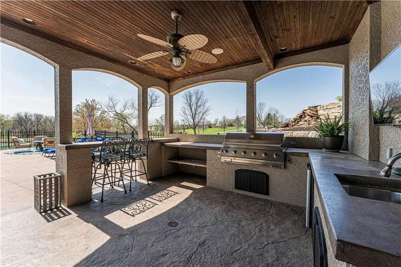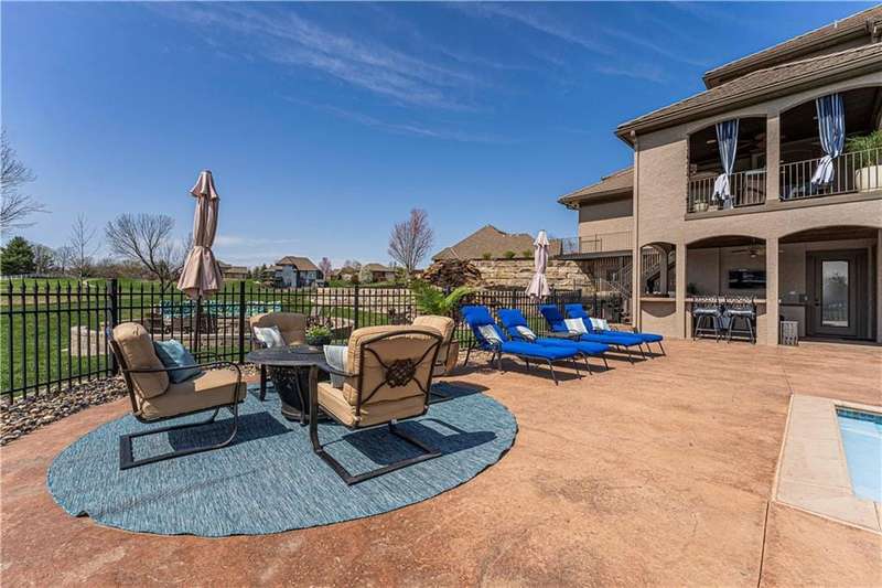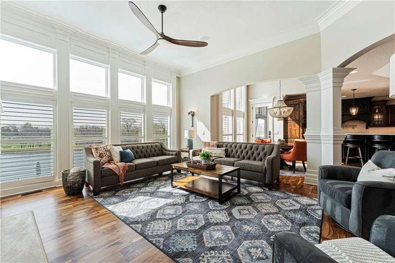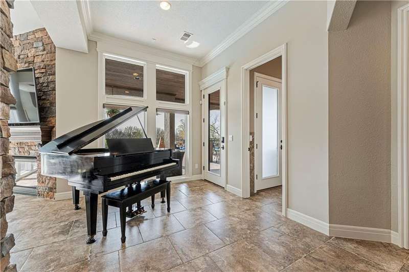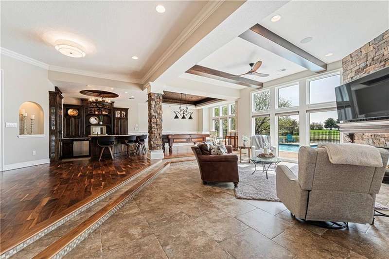 Welcome to this beautifully appointed resort style home, backing to water and featuring updates and designer touches at every turn! Main level living at its finest, with office & formal dining, as well as a gourmet kitchen w/ double ovens, laundry/mud room, great room and beautiful owner's suite. Stunning walnut floors have been refinished, carpet is all new, and there is fresh paint throughout! Upstairs, you'll find 3 additional bedrooms, each with an attached bathroom, along with a loft area for play or study. A bonus room is also available and can be used for so many things: bunkroom, play or office space! The star of the show is the walkout lower level, featuring 10.5 ft ceilings, wet bar, wine cellar, rec room, home theatre, gym AND a basketball court where you can also practice your pickleball moves! Continue the party outside: pool, spa, firepit, outdoor kitchen, covered porch, fresh landscaping and stunning water views! For more outdoor entertainment, the neighborhood offers 3 stocked ponds for fishing, and trails for walking. Beautiful (yes, freshly painted, epoxied and refinished built ins) 4 car garage fits all your vehicle and storage needs. With easy highway access and close to KCI and Northland amenities, the location can't be beat. This is truly an entertainer's dream home- make it yours to enjoy the summer with family and friends!