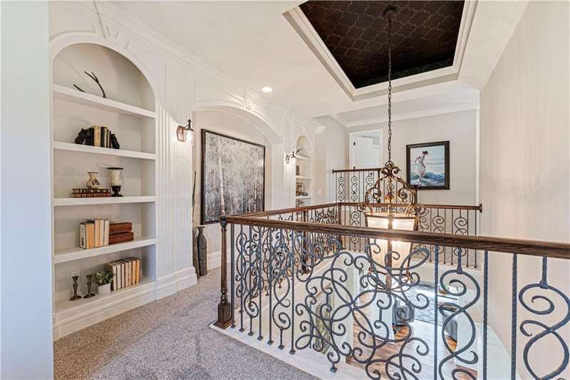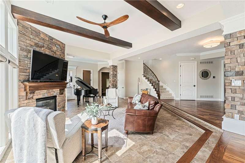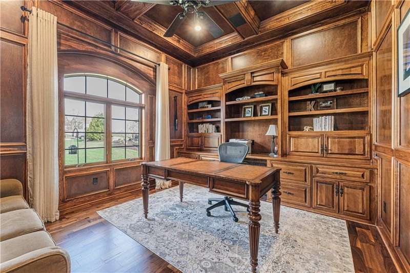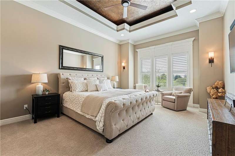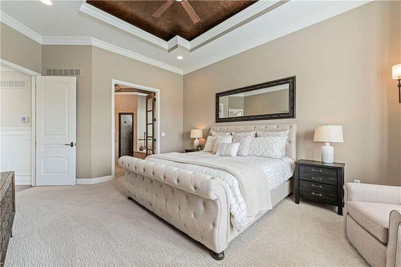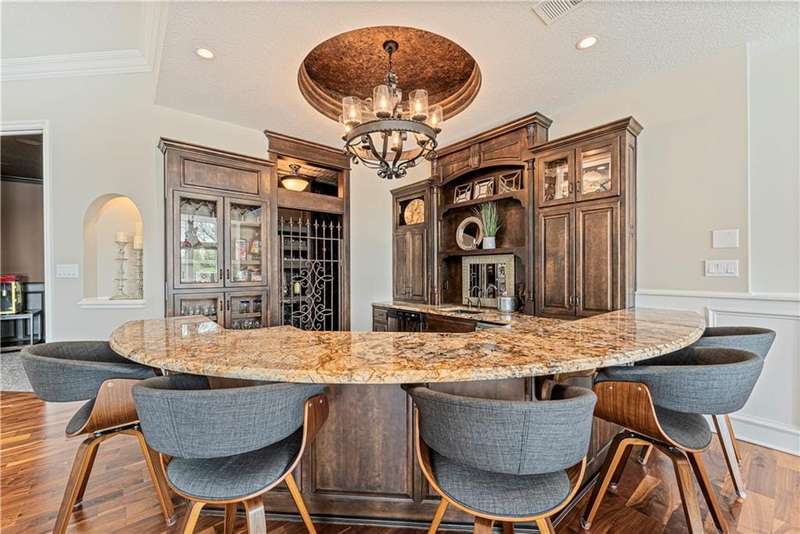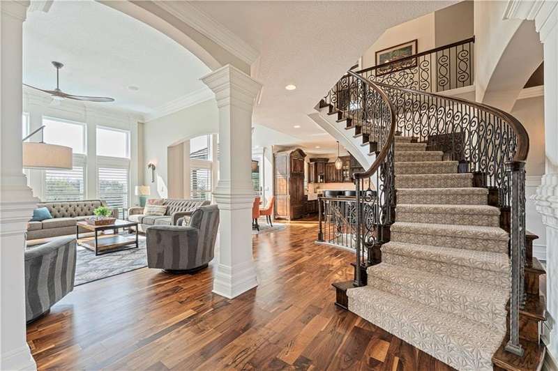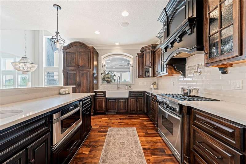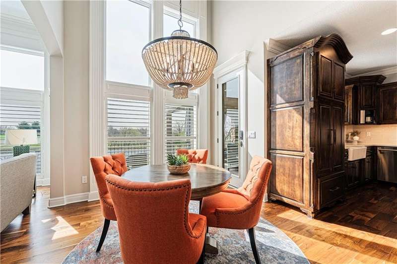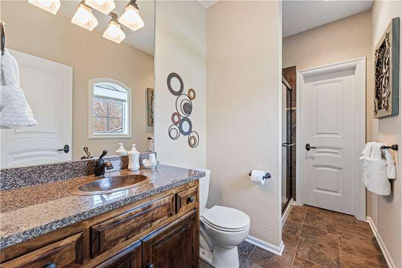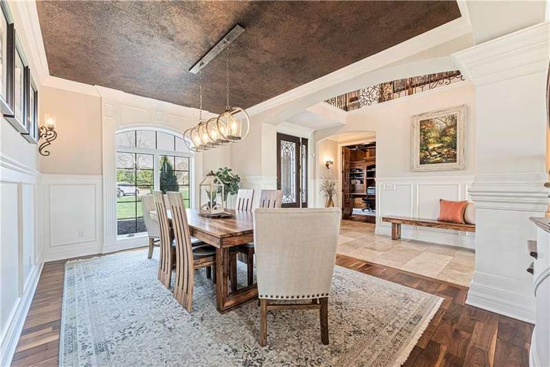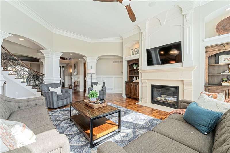 Welcome to this beautifully appointed resort style home, backing to water and featuring updates and designer touches at every turn! Main level living at its finest, with office & formal dining, as well as a gourmet kitchen w/ double ovens, laundry/mud room, great room and beautiful owner's suite. Stunning walnut floors have been refinished, carpet is all new, and there is fresh paint throughout! Upstairs, you'll find 3 additional bedrooms, each with an attached bathroom, along with a loft area for play or study. A bonus room is also available and can be used for so many things: bunkroom, play or office space! The star of the show is the walkout lower level, featuring 10.5 ft ceilings, wet bar, wine cellar, rec room, home theatre, gym AND a basketball court where you can also practice your pickleball moves! Continue the party outside: pool, spa, firepit, outdoor kitchen, covered porch, fresh landscaping and stunning water views! For more outdoor entertainment, the neighborhood offers 3 stocked ponds for fishing, and trails for walking. Beautiful (yes, freshly painted, epoxied and refinished built ins) 4 car garage fits all your vehicle and storage needs. With easy highway access and close to KCI and Northland amenities, the location can't be beat. This is truly an entertainer's dream home- make it yours to enjoy the summer with family and friends!