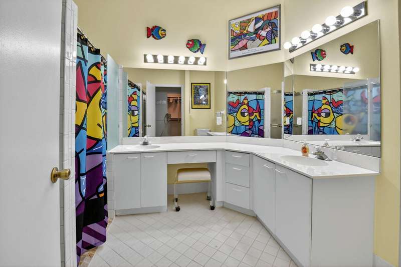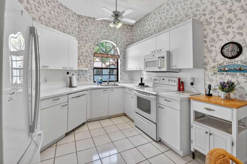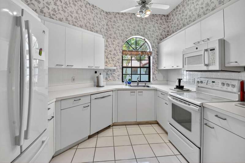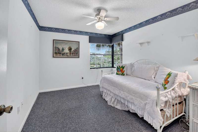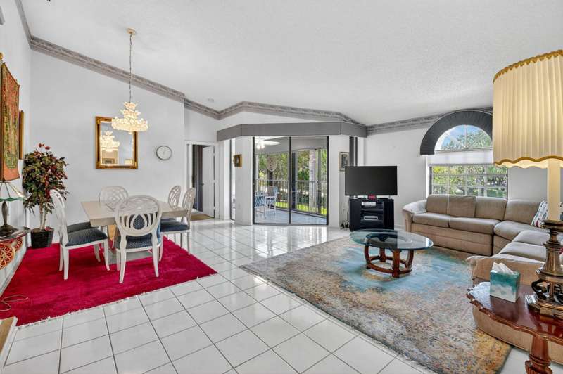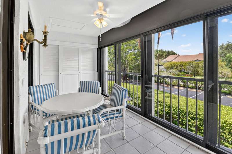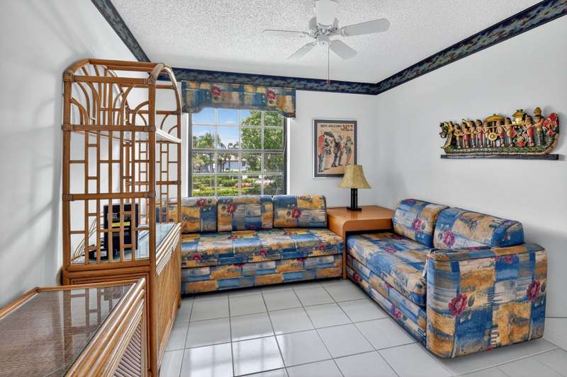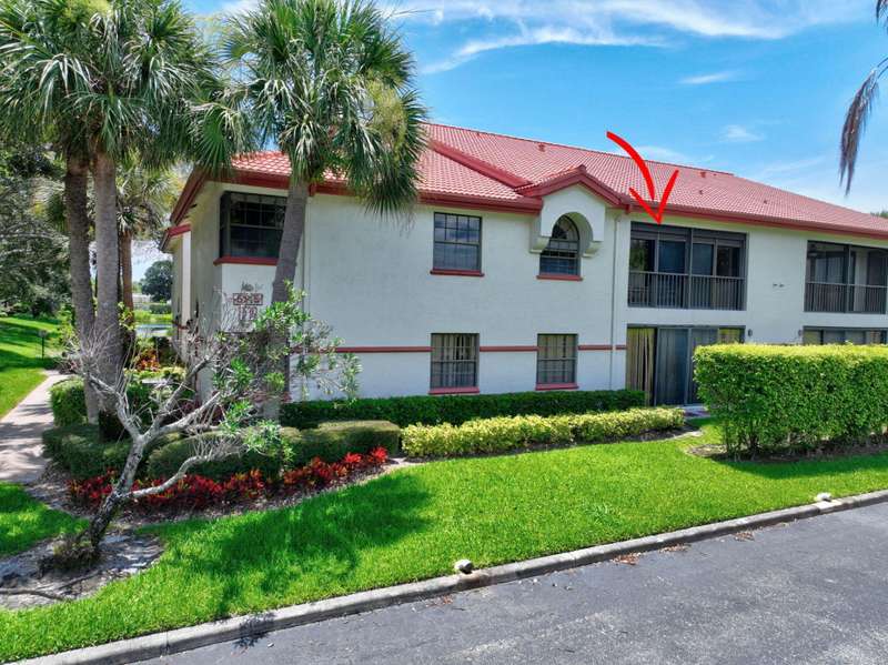 This two bedroom plus den, two full bath condo offers care-free, resort-style living. It is just a short walk from the vibrant 20,000 square foot clubhouse and an array of exceptional amenities. Access your upstairs living space using your private staircase or exclusive elevator--perfect for accessibility and ease of entry. The open, split floor plan ensures privacy and flow, with soaring ceilings creating an airy, inviting ambiance throughout. The spacious eat-in kitchen has abundant storage and a generous pantry for all your essentials. The master suite features a custom-fitted walk-in closet and a large bathroom complete with dual sinks, a vanity, and both a handicap accessible shower and a regular walk-in shower--designed to cater to every need. The den provides flexibility and style, easily convertible to a third bedroom to accommodate guests or serve as a home office. All contents are included, so you can move in immediately and update the home at your own pace. Platina offers a lifestyle where every day feels like a vacation. The community offers care-free, resort-style living at its very best! AT&T FIBER OPTIC HIGH SPEED INTERNET is INCLUDED IN THE CONDO FEES along with DIRECT TV, PEST CONTROL, ROOF MAINTENANCE and WATER. (All you pay for is electricity!) The active clubhouse is stunning! Cafe open for breakfast and lunch offering take-out meals, card rooms, fitness center with stationary bicycles in a solarium overlooking the pool area. Relax in one of the satellite pools or at the enormous free-form main pool and spacious sundeck. Tennis, handball and pickleball courts. There is also an art room with a kiln! With shows, bingo, and an array of clubs, you will not be bored! 24-hour guard gated community. Convenient access to I-95 and the Florida Turnpike. Close to shopping and wonderful restaurants. DONT FORGET TO VISIT THE CLUBHOUSE.