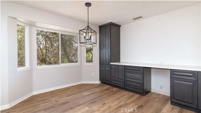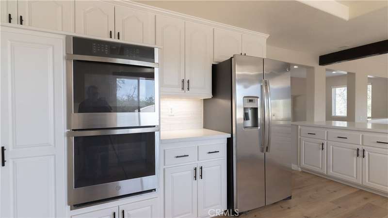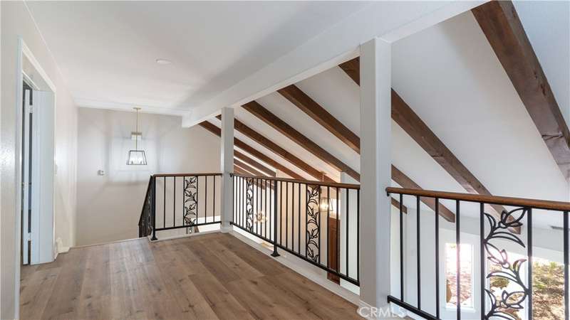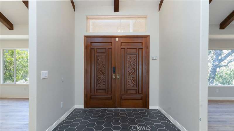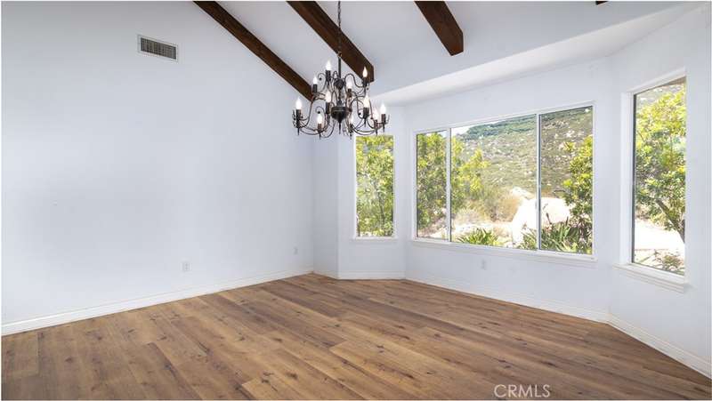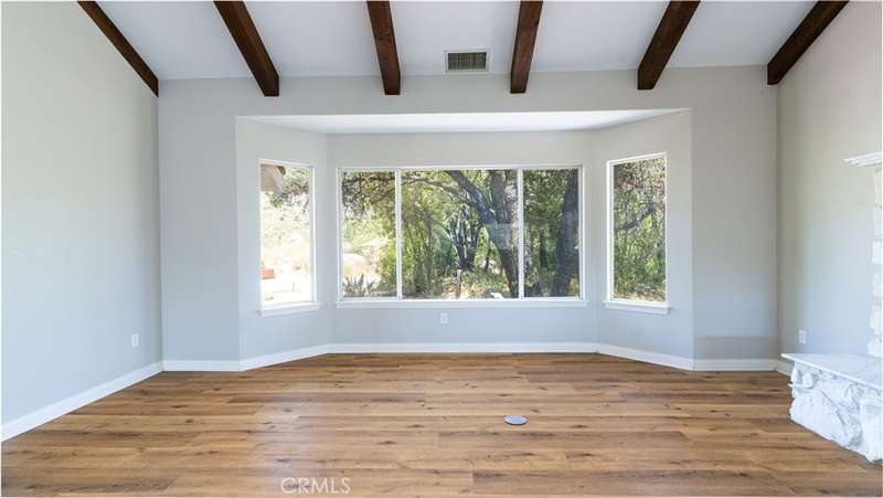 Step through the front door and into the heart of the home. The living room greets you with a cozy fireplace, wood-beamed ceilings, and expansive windows showcasing serene views. Beautifully updated flooring flows throughout the home, adding warmth and continuity.