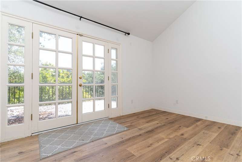 The main level also includes two bedrooms, a full bath, and a guest powder room. One of the bedrooms features French doors opening onto a private deck with sweeping views.