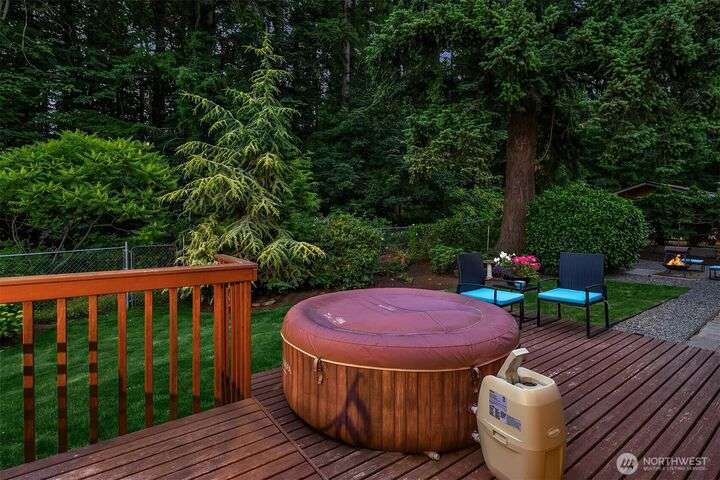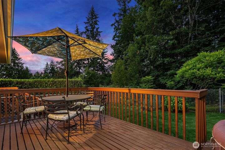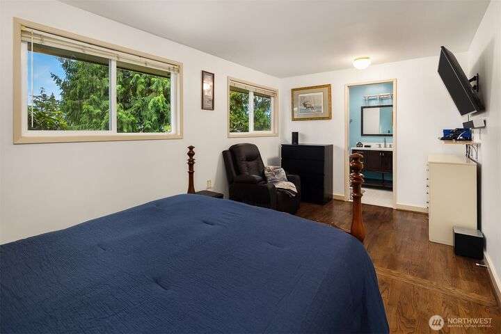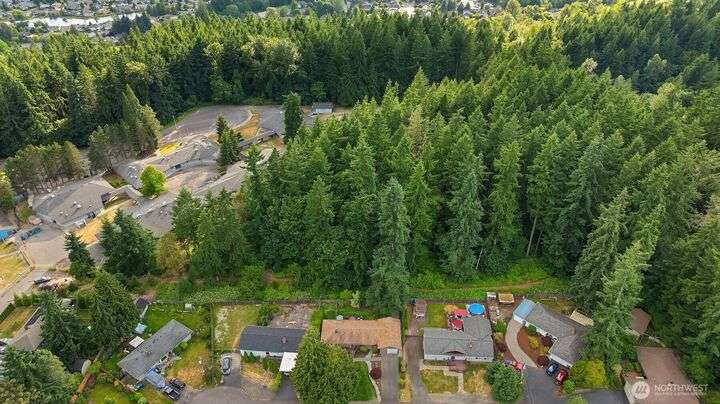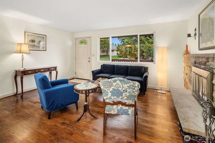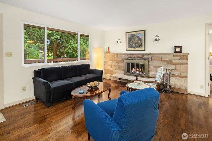 Forest retreat meets modern living. Beautiful Mid-Century rambler is nestled against Shelton View Forest with trail access. This exceptional home features two primary suites plus a versatile third bedroom/office with Murphy bed, offering the ultimate in flexible living. Oversized garage can transform into your dream workshop, home gym, or entertainment zone. Updated kitchen with beautiful quartz countertops and abundant cabinetry. Original hardwoods and striking stone fireplace deliver timeless character. AC & Heat pump provide year-round comfort. Top-rated Northshore School District, Shelton View Elementary is blocks away! Fully fenced yard with dog run and large private deck. Easy access to freeways, shopping and restaurants. Must see
