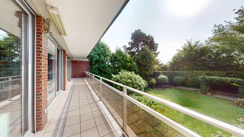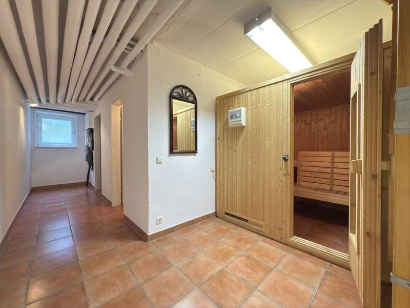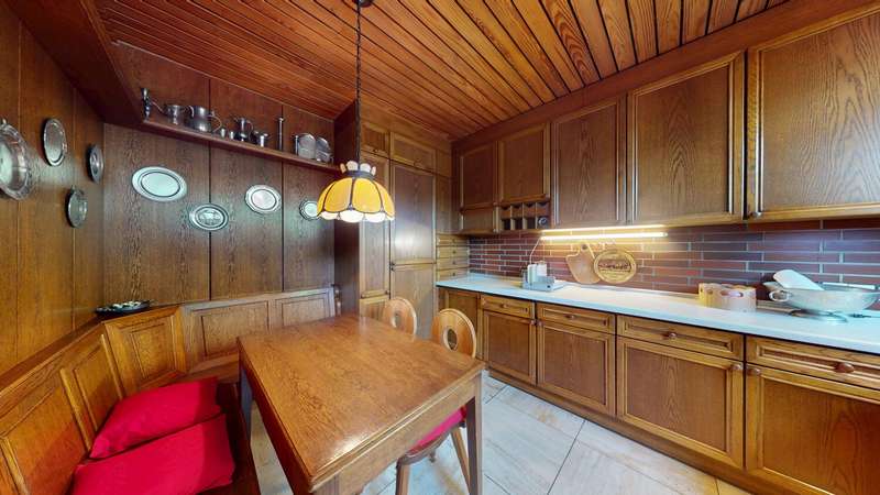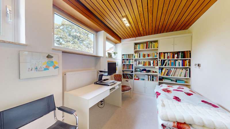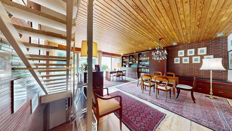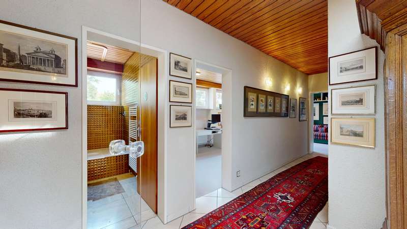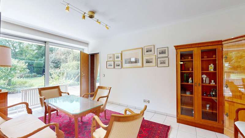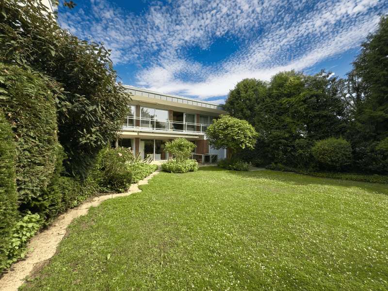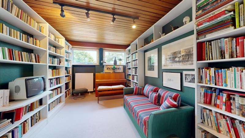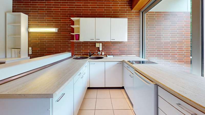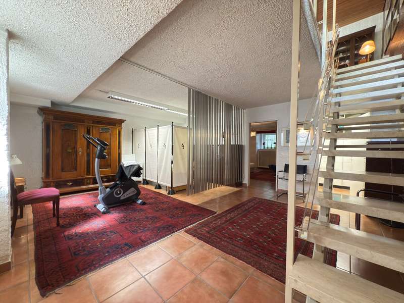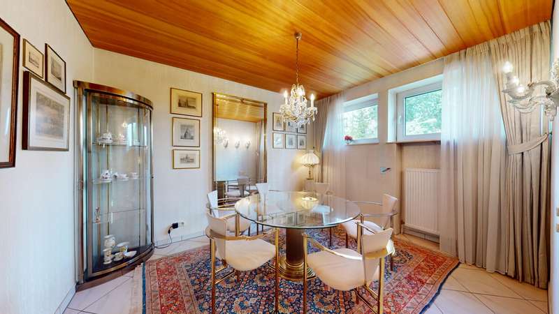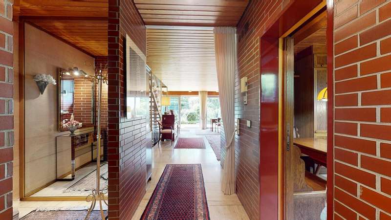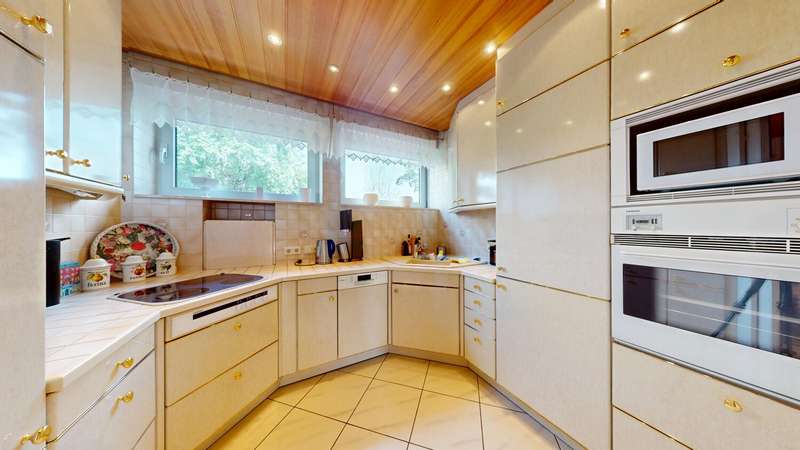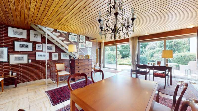 This exceptional architect's house from 1969 impresses with its generous living space of around 296 m², a plot of around 629 m² in a sought-after location on the edge of a field and a well thought-out and versatile room layout. Built in solid brick construction, it combines charming architecture with numerous possible uses - whether for a large family, as a multi-generational home, for combining working and living or as an investment with potential for a three-family home. The first floor has two separate entrances, two kitchens, two guest toilets, a shower room, a spacious living and dining area with access to the terrace and the idyllic mature garden, as well as two further rooms. The original planning allowed for the separation of a practice unit from the private rooms of the house. On the upper floor you will find a master bedroom with en-suite bathroom and access to an office and the large balcony, another spacious living room, a dining room, another kitchen, a shower room and two further bedrooms, which are currently separated by a high-quality carpentry wall unit. The area with a full basement of approx. 146 m² is dry and can be used for living. Here there are two further rooms, a utility room with direct access to the garden, a sauna, a shower room and several storage rooms - ideal as a guest, hobby or work area. The house is flooded with light thanks to floor-to-ceiling windows and is partly equipped with electric shutters. The roof was extensively renovated in 2021. The beautifully ingrown south-west-facing garden with garden shed and access to the garage from the garden and street side, the quiet cul-de-sac location with little through traffic and the direct proximity to fields ensure a high quality of life. The spacious garage with electric door has enough space for up to two cars, and there is also another parking space in front of the garage. At the same time, you benefit from Niederursel's good infrastructure: shopping facilities, schools, daycare centers and public transport are all within easy reach, and Frankfurt city center is just a few minutes' drive away. A house that, thanks to its size and layout, makes many lifestyles possible: whether a spacious family idyll, comfortable multi-generational living or a combination of living and working - here you will find space for your visions. See for yourself the many possibilities and the special charm of this property during a viewing.