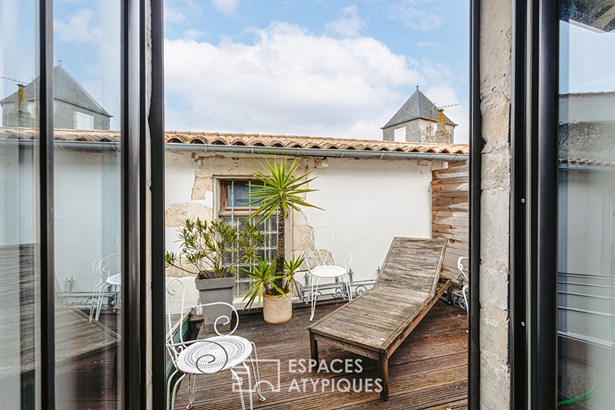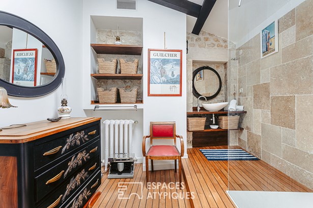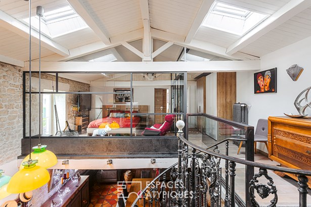 The first floor surprises with its volumes and reveals a real open space, today an office and library. On one side of the footbridge is revealed the master bedroom of the place with its dressing room, its bathroom and its private terrace. On the other, two bedrooms share a large bathroom. This unique place benefits from an ideal location between the city center and the Ile de Re. No work to be planned.