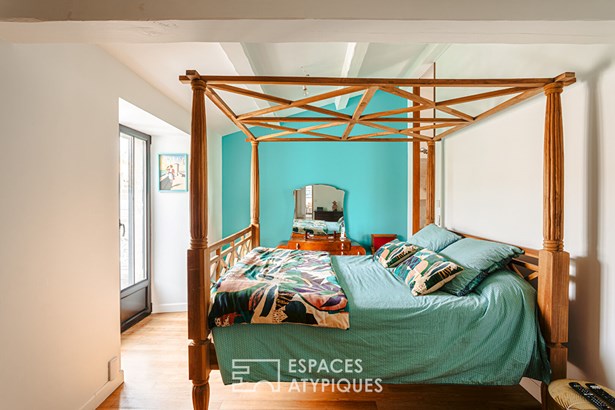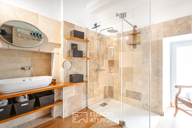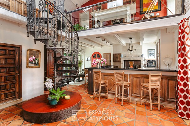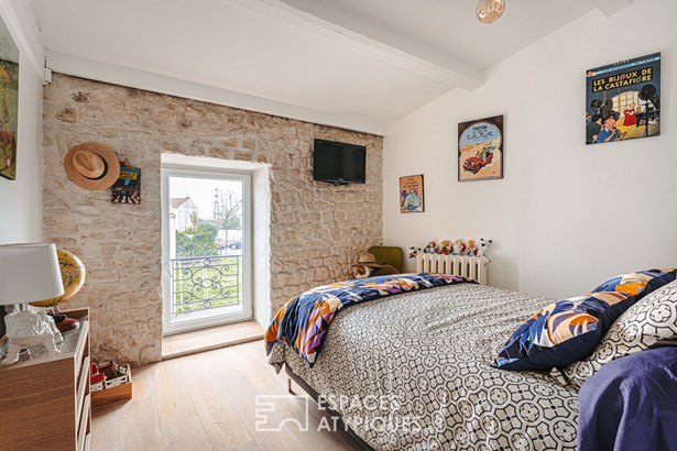 The entrance to the house immediately sets the tone: rubble and exposed beams instill charm and character, while the centerpiece, an imposing spiral staircase, divides the living room in two. On one side, the living room, intimate with its fireplace, on the other, the kitchen, a real space of conviviality with its counter that can accommodate more than six people. In the extension, the patio with its glass roof and an office complete this level. The metal staircase leads to the sleeping area.