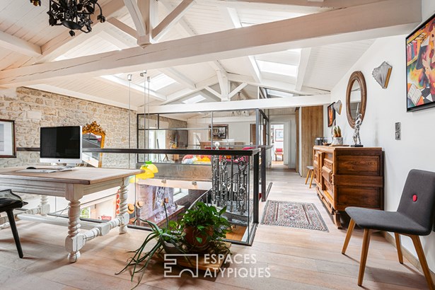Located in the quiet area of Laleu in La Rochelle, this former renovated stable seduces with its cocooning spirit. With approximately 195 sqm of living space, this family and welcoming home borrows the look of a loft.