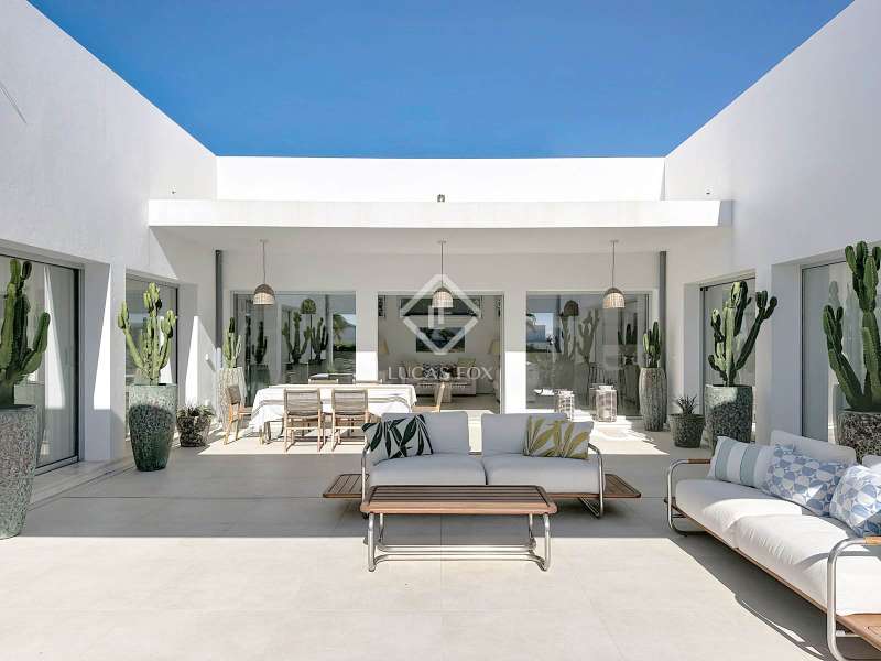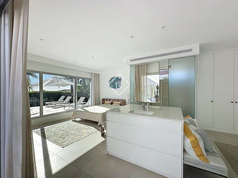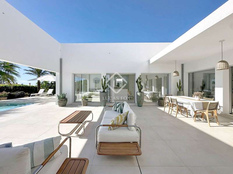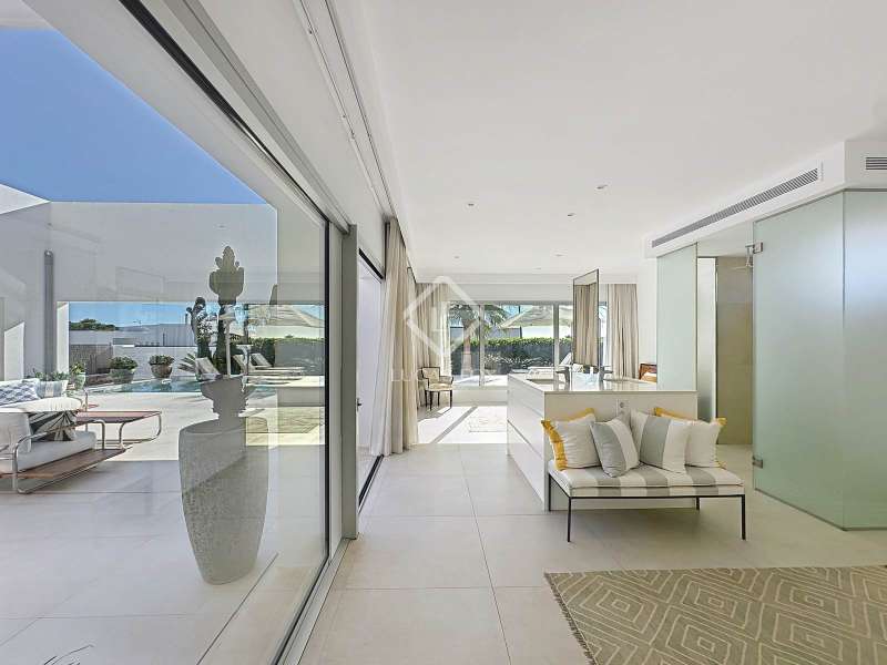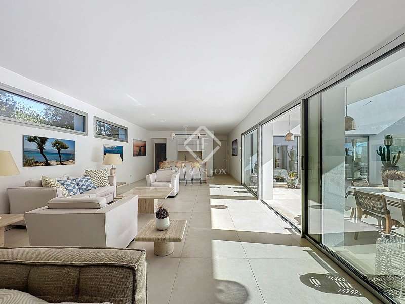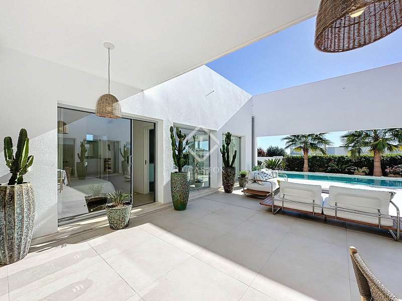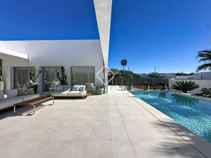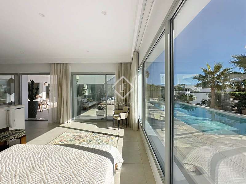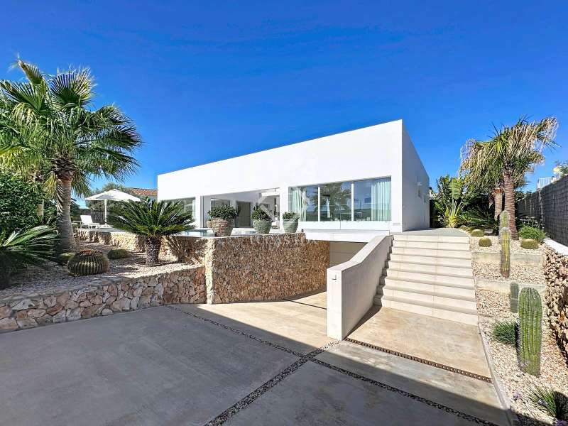 Lucas Fox presents this extraordinary single-storey luxury villa, located in Son Remei, an exclusive residential area of Sant Lluís, just a few metres from the sea. From its spacious terrace and spectacular solarium, you can enjoy beautiful sea views and the natural surroundings of Menorca’s stunning south coast. Set on a plot of 833 m², the property offers 208 m² of built area all on one level, standing out for its avant-garde architecture and innovative concept of transparency. Its design allows you to see practically every part of the home from any point, creating a continuous, open and light-filled space. The house is arranged around an elegant central terrace that opens onto a south-facing private pool, ensuring sunlight and natural brightness throughout the day. The main porch connects to all rooms, making the home completely exterior and seamlessly blending indoor and outdoor living. The continuous flooring, identical inside and out, enhances this sense of fluid connection and allows you to enjoy the Mediterranean climate all year round. At the heart of the home lies a spacious central living area with a library and several zones for rest and relaxation, framed by large windows that flood the space with natural light. The open-plan kitchen with island integrates with the living room, creating a modern and welcoming atmosphere, ideal both for everyday life and for entertaining family and friends. The night area comprises three bedrooms, all exterior and carefully oriented to make the most of the natural light. The main bedroom is the most spacious and features a private bathroom with glass walls, a central island washbasin, and a large dressing area with built-in wardrobes. The other two bedrooms share a complete bathroom, maintaining the same elegant and minimalist aesthetic. Outside, the garden surrounds the entire perimeter of the house and is beautifully landscaped with Mediterranean vegetation, inviting you to stroll and enjoy the serene atmosphere. The pool, perfectly integrated into the architecture, and the various terrace areas offer multiple corners to relax and soak up the sun. On the rooftop, the villa features a solarium with solar panels, accessible from both the interior and exterior, with the possibility of creating a chill-out area, barbecue or outdoor kitchen, ideal for enjoying the stunning sea views and sunsets. The property also includes a private garage on the lower level, accessed via an electric gate with remote control. It is equipped with double-glazed windows, double curtains, and a state-of-the-art electrical and insulation system that ensures very low energy consumption and maximum comfort throughout the year. Located in a very quiet area, the villa offers complete privacy while being just a few minutes from the village of Sant Lluís and Mahón, where you can find all essential amenities such as supermarkets, restaurants and shops. In addition, the most beautiful beaches on the south coast, including Punta Prima, are just three minutes away by car. In short, a unique, modern and light-filled property that perfectly combines design, comfort and sustainability in a privileged setting — ideal for those seeking a contemporary home by the sea in southern Menorca.