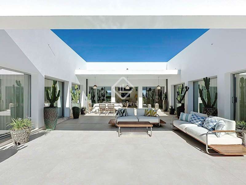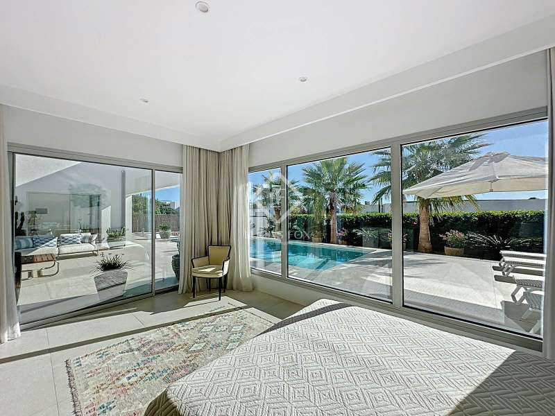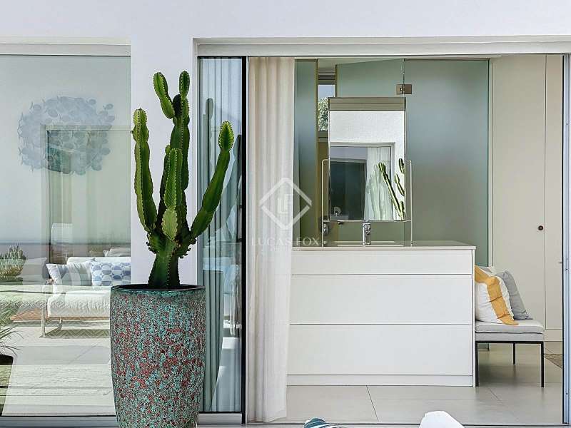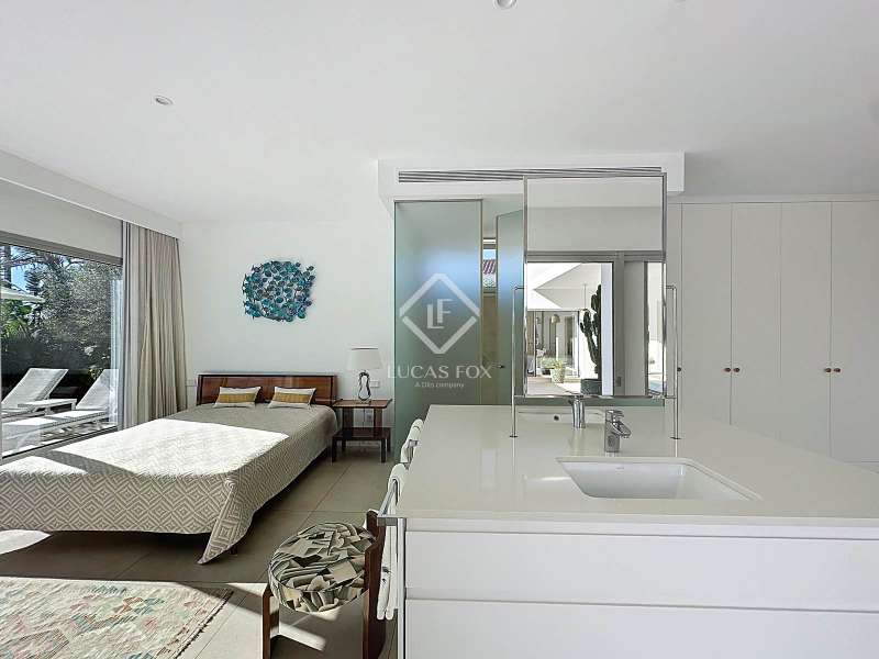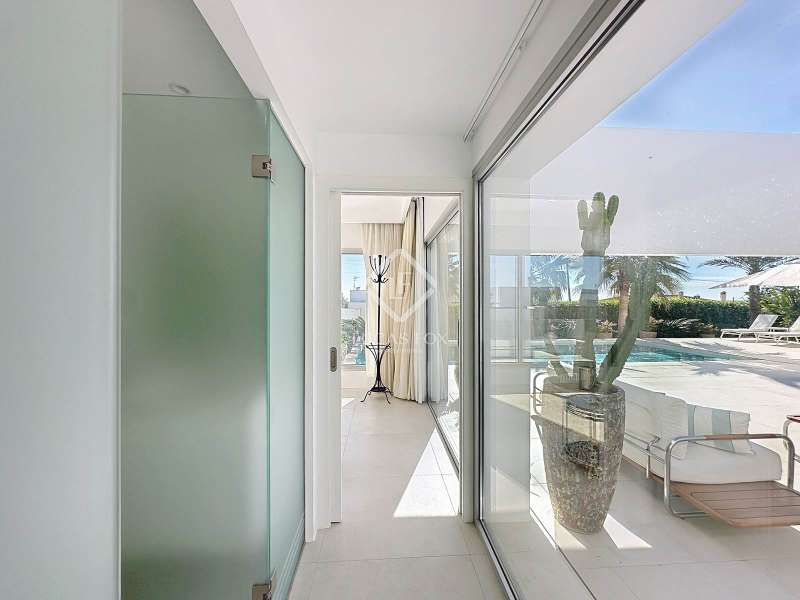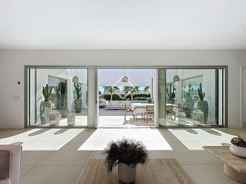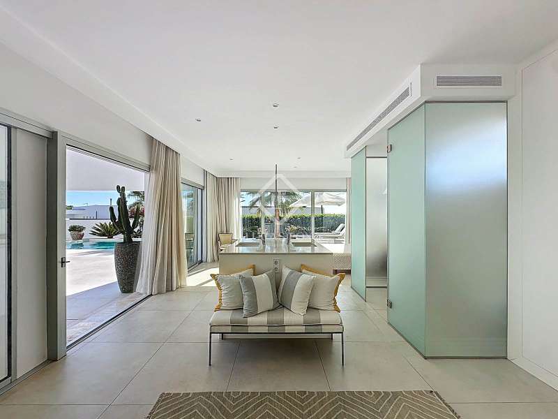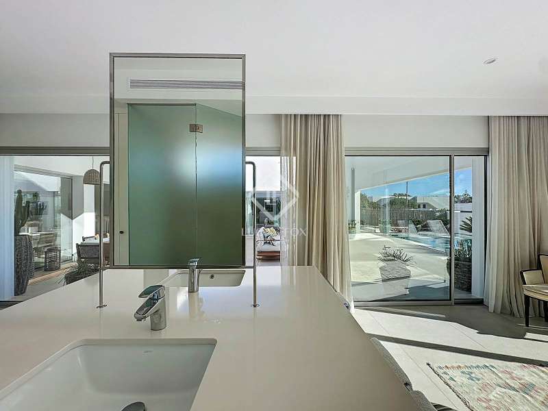Lucas Fox presents this extraordinary single-storey luxury villa, located in Son Remei, an exclusive residential area of Sant Lluís, just a few metres from the sea. From its spacious terrace and spectacular solarium, you can enjoy beautiful sea views and the natural surroundings of Menorca’s stunning south coast. Set on a plot of 833 m², the property offers 208 m² of built area all on one level, standing out for its avant-garde architecture and innovative concept of transparency. Its design allows you to see practically every part of the home from any point, creating a continuous, open and light-filled space. The house is arranged around an elegant central terrace that opens onto a south-facing private pool, ensuring sunlight and natural brightness throughout the day. The main porch connects to all rooms, making the home completely exterior and seamlessly blending indoor and outdoor living. The continuous flooring, identical inside and out, enhances this sense of fluid connection and allows you to enjoy the Mediterranean climate all year round. At the heart of the home lies a spacious central living area with a library and several zones for rest and relaxation, framed by large windows that flood the space with natural light. The open-plan kitchen with island integrates with the living room, creating a modern and welcoming atmosphere, ideal both for everyday life and for entertaining family and friends. The night area comprises three bedrooms, all exterior and carefully oriented to make the most of the natural light. The main bedroom is the most spacious and features a private bathroom with glass walls, a central island washbasin, and a large dressing area with built-in wardrobes. The other two bedrooms share a complete bathroom, maintaining the same elegant and minimalist aesthetic. Outside, the garden surrounds the entire perimeter of the house and is beautifully landscaped with Mediterranean vegetation, inviting you to stroll and enjoy the serene atmosphere. The pool, perfectly integrated into the architecture, and the various terrace areas offer multiple corners to relax and soak up the sun. On the rooftop, the villa features a solarium with solar panels, accessible from both the interior and exterior, with the possibility of creating a chill-out area, barbecue or outdoor kitchen, ideal for enjoying the stunning sea views and sunsets. The property also includes a private garage on the lower level, accessed via an electric gate with remote control. It is equipped with double-glazed windows, double curtains, and a state-of-the-art electrical and insulation system that ensures very low energy consumption and maximum comfort throughout the year. Located in a very quiet area, the villa offers complete privacy while being just a few minutes from the village of Sant Lluís and Mahón, where you can find all essential amenities such as supermarkets, restaurants and shops. In addition, the most beautiful beaches on the south coast, including Punta Prima, are just three minutes away by car. In short, a unique, modern and light-filled property that perfectly combines design, comfort and sustainability in a privileged setting — ideal for those seeking a contemporary home by the sea in southern Menorca.