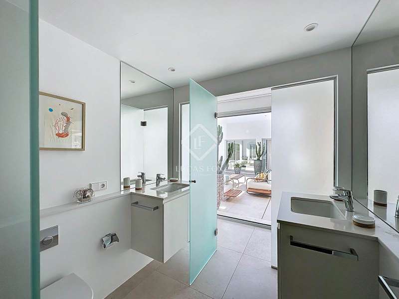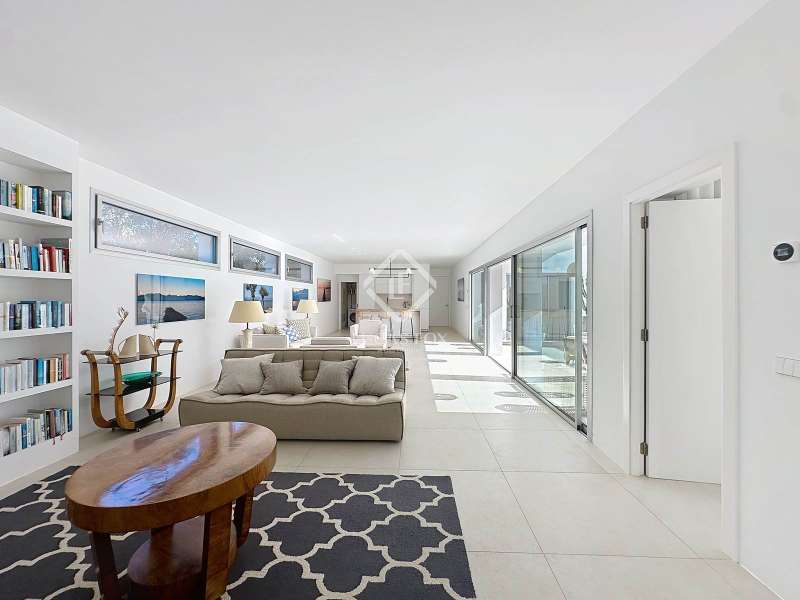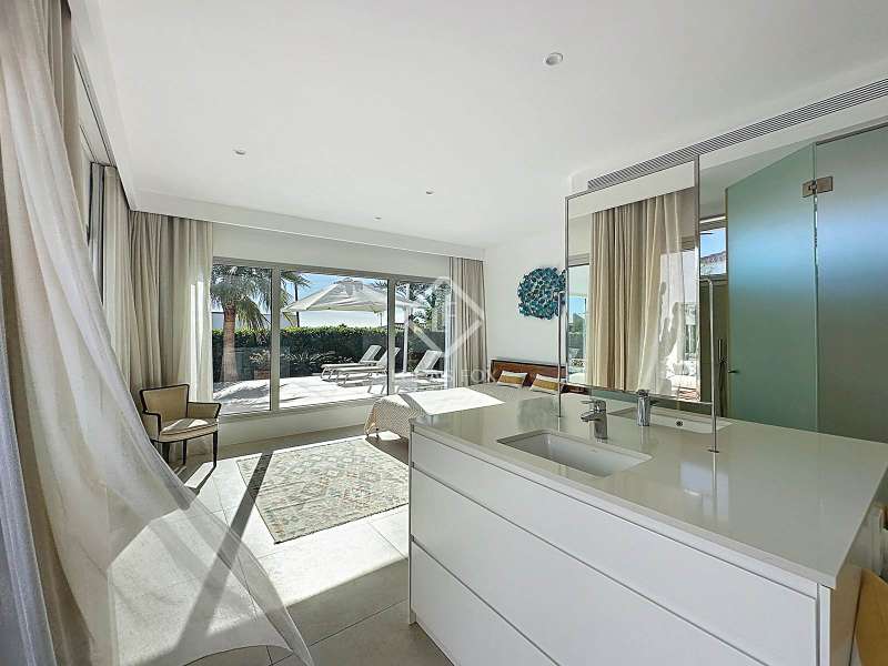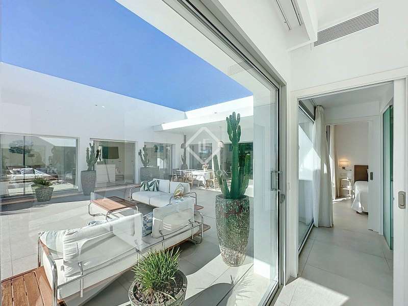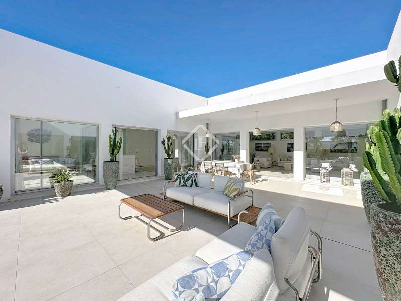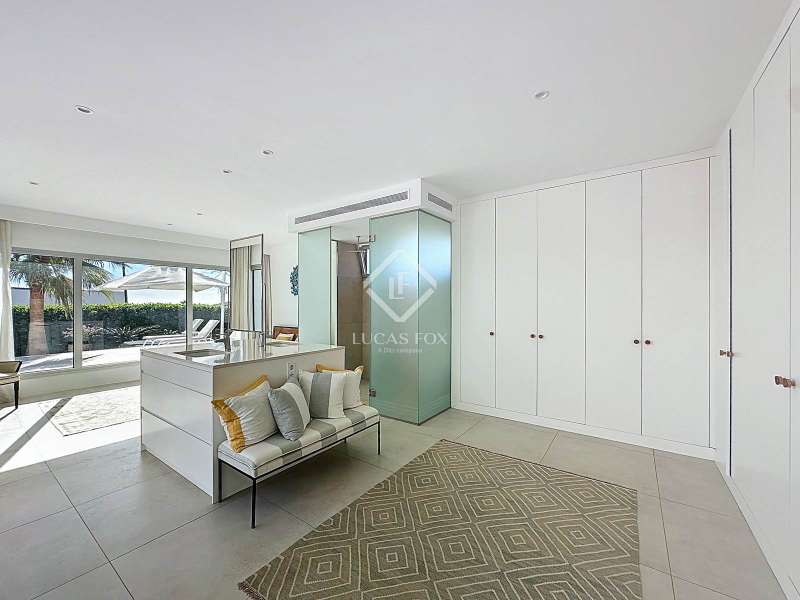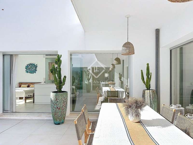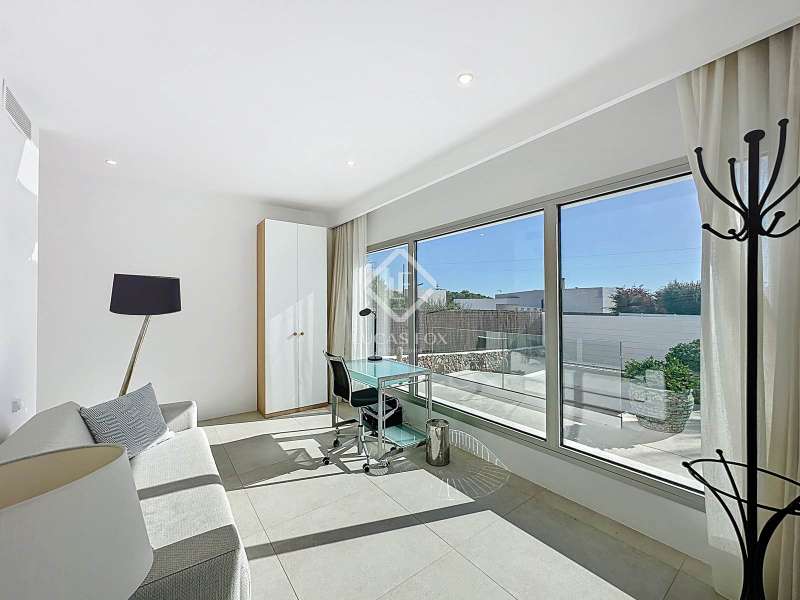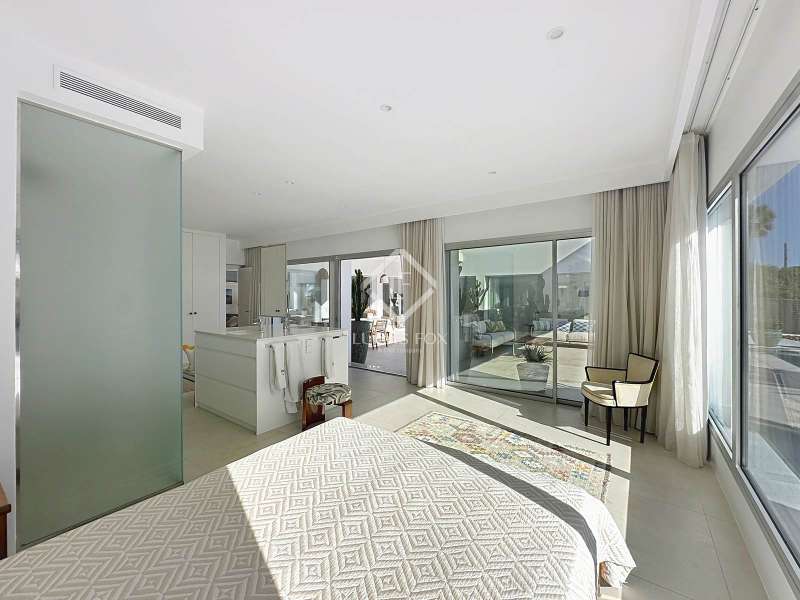 Lucas Fox presents this extraordinary single-storey luxury villa, located in Son Remei, an exclusive residential area of Sant Lluís, just a few metres from the sea. From its spacious terrace and spectacular solarium, you can enjoy beautiful sea views and the natural surroundings of Menorca’s stunning south coast. Set on a plot of 833 m², the property offers 208 m² of built area all on one level, standing out for its avant-garde architecture and innovative concept of transparency. Its design allows you to see practically every part of the home from any point, creating a continuous, open and light-filled space. The house is arranged around an elegant central terrace that opens onto a south-facing private pool, ensuring sunlight and natural brightness throughout the day. The main porch connects to all rooms, making the home completely exterior and seamlessly blending indoor and outdoor living. The continuous flooring, identical inside and out, enhances this sense of fluid connection and allows you to enjoy the Mediterranean climate all year round. At the heart of the home lies a spacious central living area with a library and several zones for rest and relaxation, framed by large windows that flood the space with natural light. The open-plan kitchen with island integrates with the living room, creating a modern and welcoming atmosphere, ideal both for everyday life and for entertaining family and friends. The night area comprises three bedrooms, all exterior and carefully oriented to make the most of the natural light. The main bedroom is the most spacious and features a private bathroom with glass walls, a central island washbasin, and a large dressing area with built-in wardrobes. The other two bedrooms share a complete bathroom, maintaining the same elegant and minimalist aesthetic. Outside, the garden surrounds the entire perimeter of the house and is beautifully landscaped with Mediterranean vegetation, inviting you to stroll and enjoy the serene atmosphere. The pool, perfectly integrated into the architecture, and the various terrace areas offer multiple corners to relax and soak up the sun. On the rooftop, the villa features a solarium with solar panels, accessible from both the interior and exterior, with the possibility of creating a chill-out area, barbecue or outdoor kitchen, ideal for enjoying the stunning sea views and sunsets. The property also includes a private garage on the lower level, accessed via an electric gate with remote control. It is equipped with double-glazed windows, double curtains, and a state-of-the-art electrical and insulation system that ensures very low energy consumption and maximum comfort throughout the year. Located in a very quiet area, the villa offers complete privacy while being just a few minutes from the village of Sant Lluís and Mahón, where you can find all essential amenities such as supermarkets, restaurants and shops. In addition, the most beautiful beaches on the south coast, including Punta Prima, are just three minutes away by car. In short, a unique, modern and light-filled property that perfectly combines design, comfort and sustainability in a privileged setting — ideal for those seeking a contemporary home by the sea in southern Menorca.