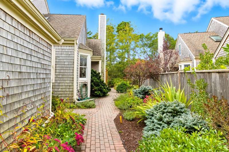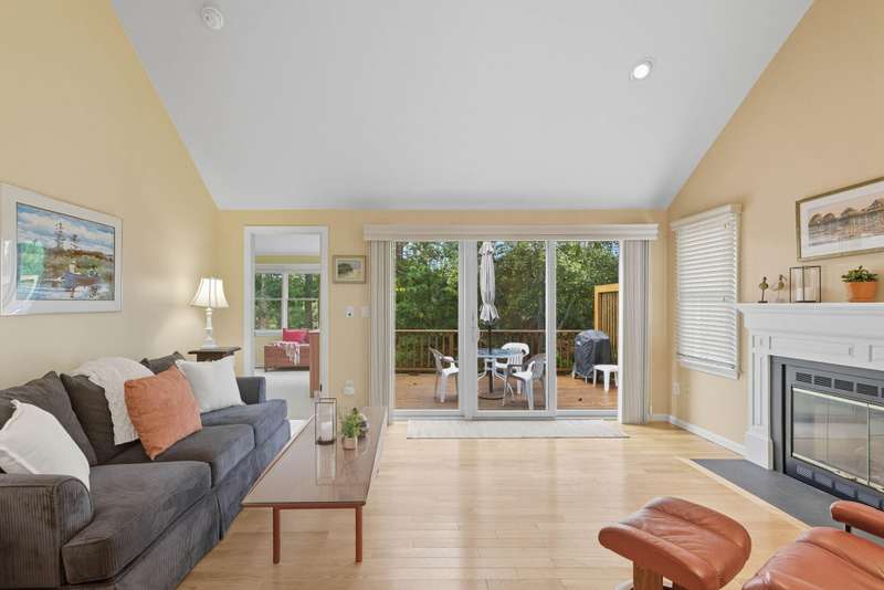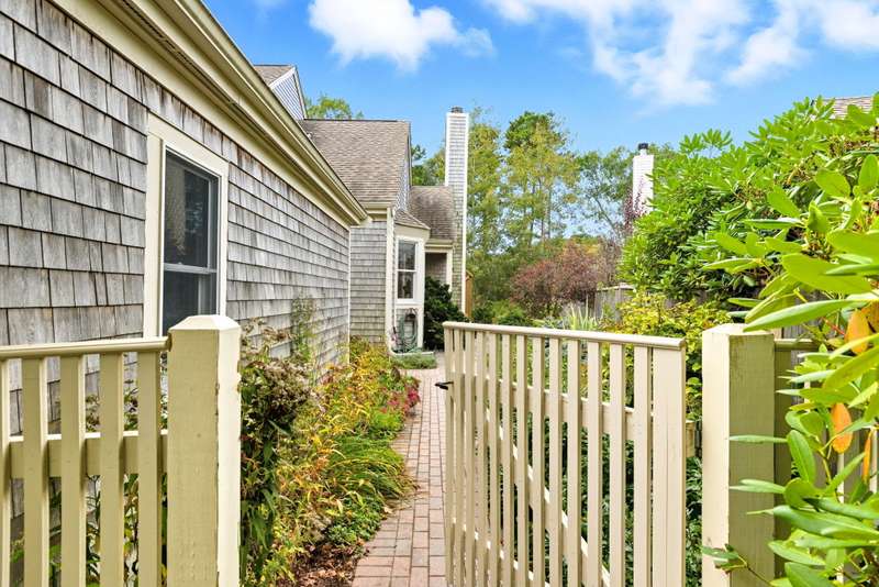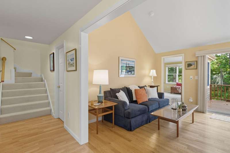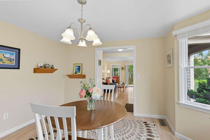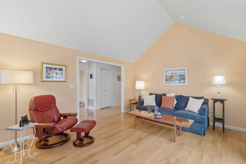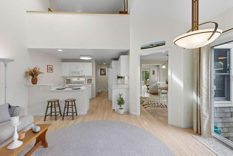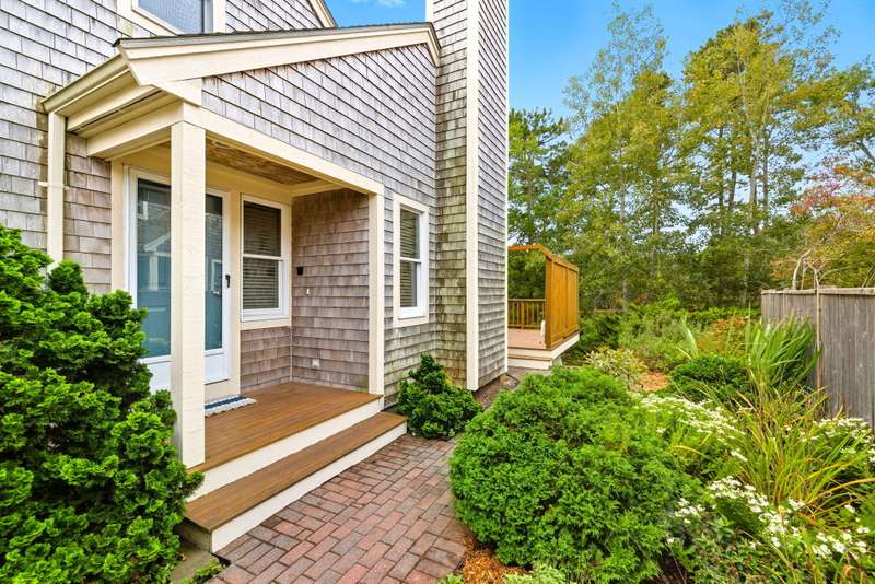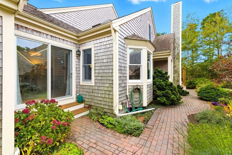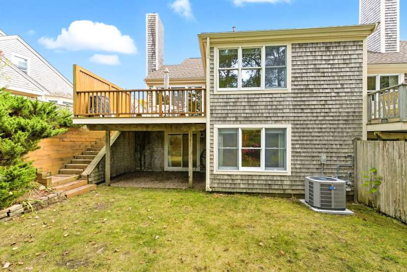 Popular D model townhome overlooking the 1st tee and fairway in Kings Way, Cape Cod's premier condo community. Move-in ready and light and bright, this home offers 1st floor living with primary bedroom ensuite with a walk-in shower, guest bath, living room with vaulted ceiling, gas fireplace and slider to deck, dining room, large eat-in kitchen/family room, laundry and direct entry 2 car garage. Second floor offers a guest bedroom, full bath, and loft for office or den. The finished lower level offers large family room, office, bonus room and full bath. There is hardwood on the first floor except for the primary bedroom and new tile in the bathrooms. Attractive courtyard and steps leading to the lower level. The entire HVAC system was replaced in the fall of 2023. Water heater was replaced in 2022. Come and enjoy the Kings Way lifestyle with many activities including a golf course, restaurant, 2 pools, tennis and pickle ball courts, meeting house, social center/post office and year-