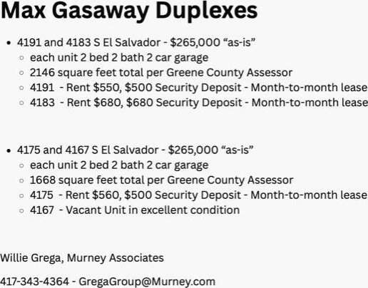 Prime Investment Opportunity in Southwest Springfield! This package includes TWO DUPLEXES, built in 1998 by the current owner. Each unit offers 2 bedrooms, 2 full bathrooms, and a 2-car garage, perfect for attracting quality tenants. Unit 4167 (interior photos attached) is vacant, move-in ready, and in excellent condition. The other three units are leased month-to-month at below-market rents, offering significant potential for increased cash flow. Sold ''As-Is,'' with showings of occupied units to be arranged after an accepted contract. Don't miss this chance to own high-potential investment properties in a desirable location!