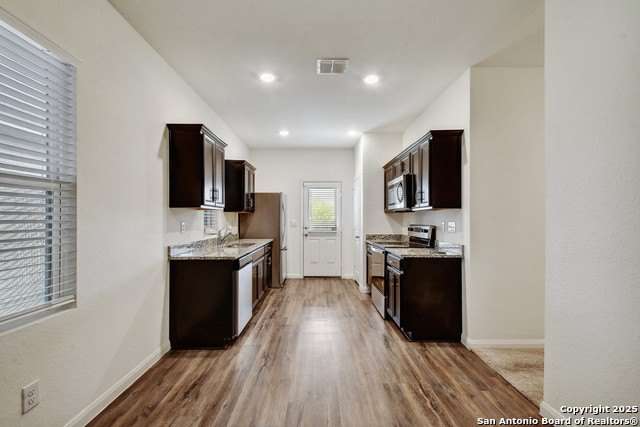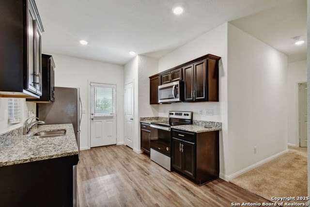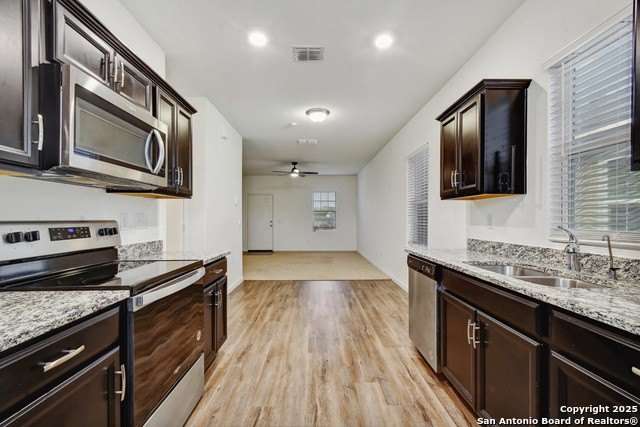 Welcome to this beautiful and pristine 3-bedroom, 2-bathroom single-story home, perfectly situated on a desirable corner lot. Boasting an open and airy floor plan, this home is designed for both comfortable living and effortless entertaining. Step into the spacious living area that flows seamlessly into a well-appointed kitchen featuring stunning granite countertops and a sleek electric range-perfect for the home chef. The master suite offers a serene retreat with a generous walk-in closet and a private ensuite bath. Additional highlights include energy-efficient solar window screens that help keep utility costs low, a state-of-the-art security system for peace of mind, energy efficient appliances and a 2-car garage offering plenty of storage. Meticulously maintained and move-in ready, this home combines comfort, convenience, and modern touches in every detail. Sellers are offering $5,000 in assistance with closing costs for your new home! Don't miss your chance to own this gem located in the desirable Liberte neighborhood in Converse Texas!
