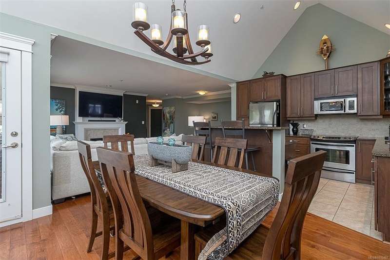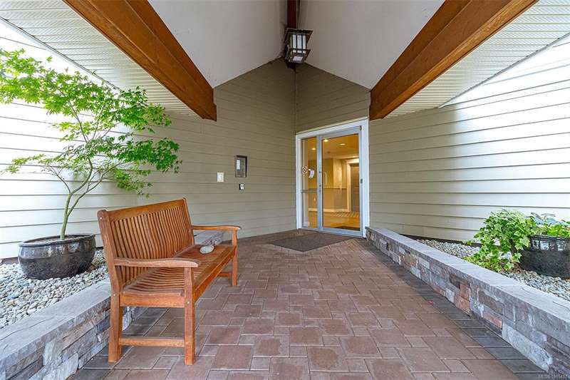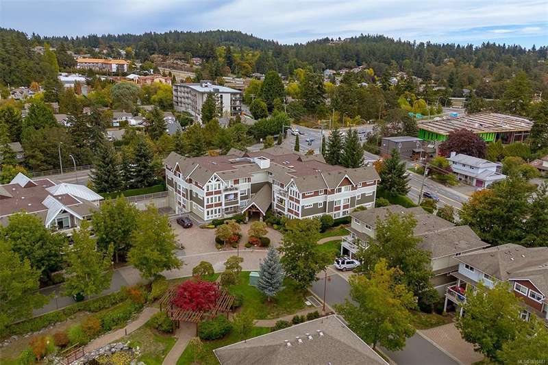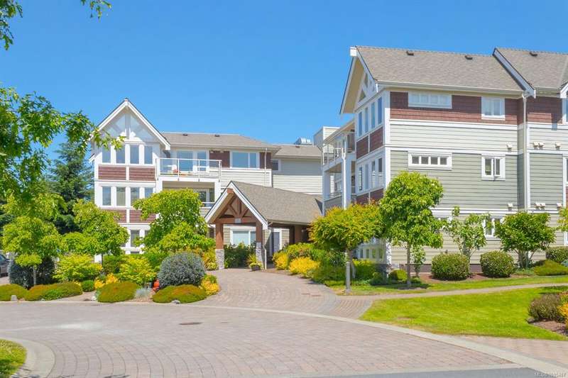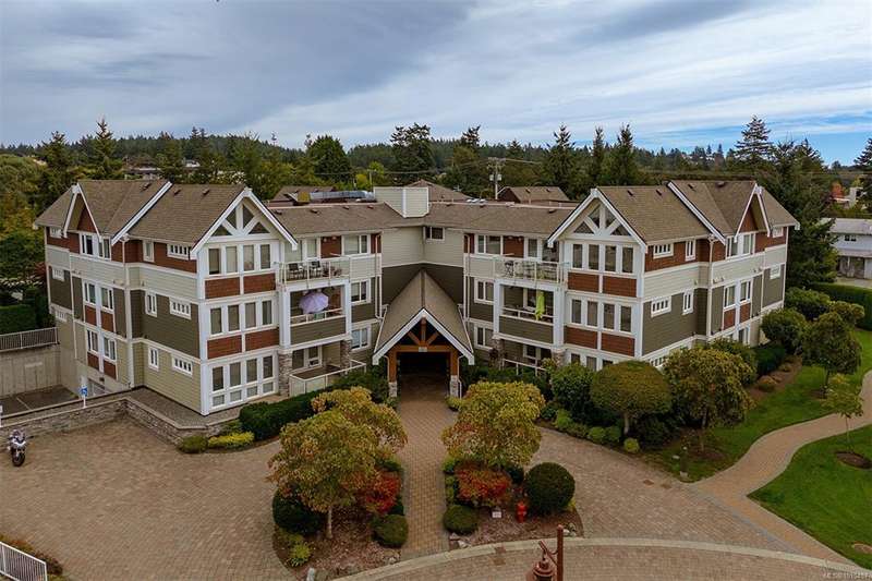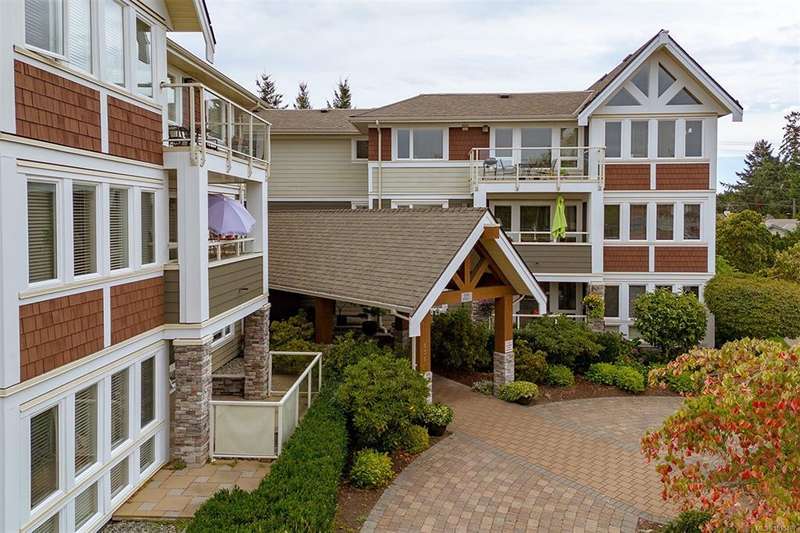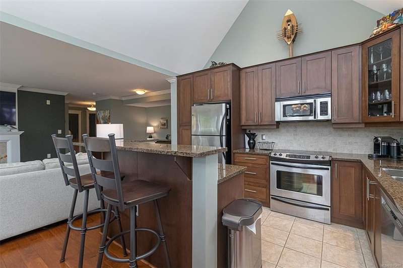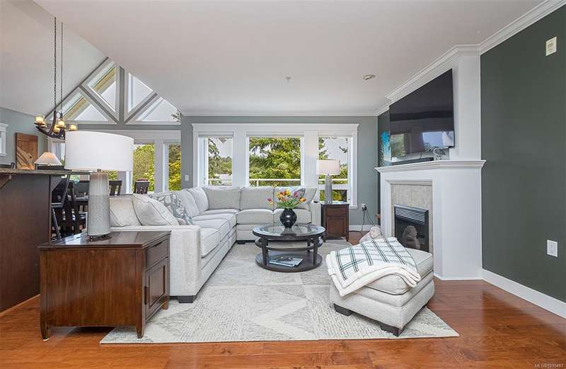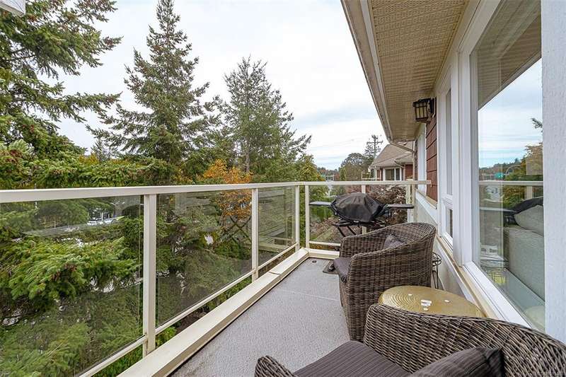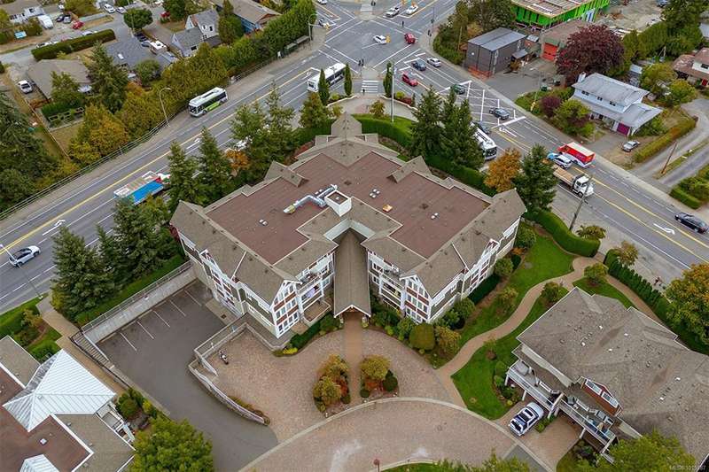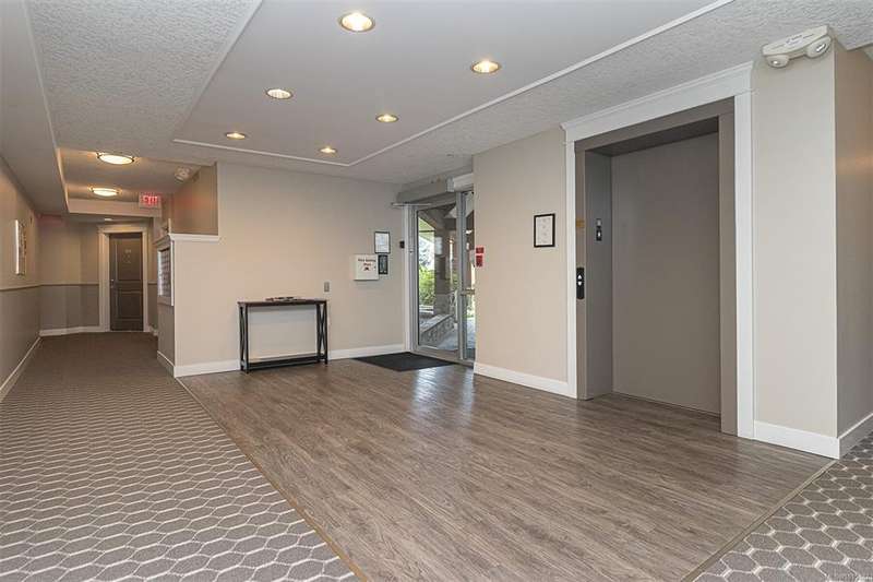 Welcome to your top-floor corner home with vaulted ceilings & floor-to-ceiling windows that flood your space w/natural light. Freshly painted throughout w/sleek new blinds, this place is move-in ready...literally nothing to do but unpack & relax. The smart, open-concept layout features hardwood floors & a spacious entry that flows effortlessly into two well-sized bedrooms. The living room is the perfect space to host your crew or just kick back & cozy up in comfort. The kitchen is ready for your inner chef w/granite countertops, stainless steel appliances, & a handy breakfast bar—perfect for morning coffee and easy flow to the large dining area, which has plenty of room for your full-size table & buffet or bar setup. The primary bedroom is a true retreat, with great closets & a spacious ensuite. The second bedroom is cross unit - perfect for privacy, guests, or home office. Set among beautifully landscaped grounds, an easy walk to Broadmead/Royal Oak shopping & to Commonwealth rec!