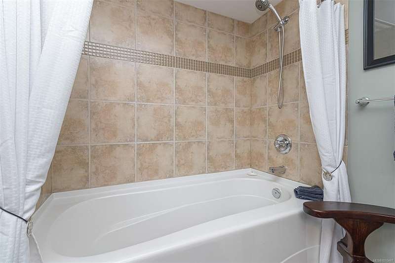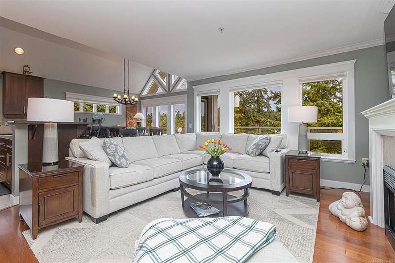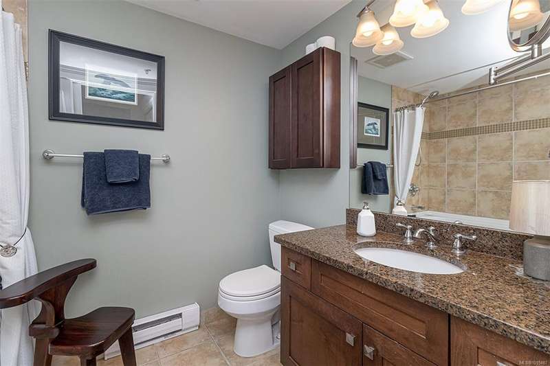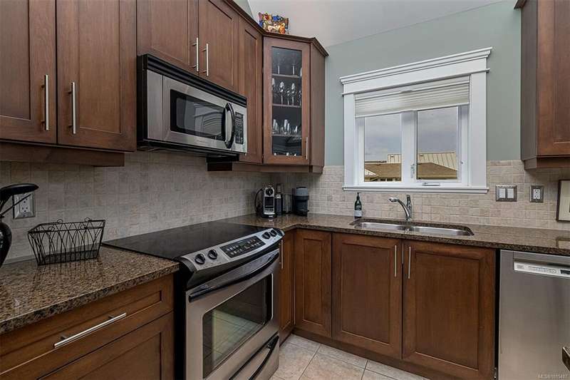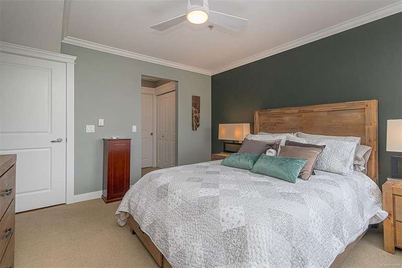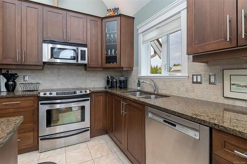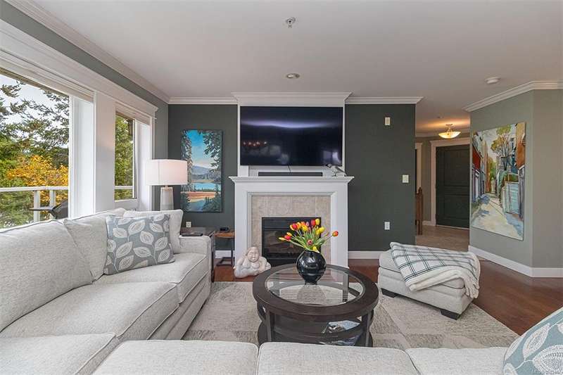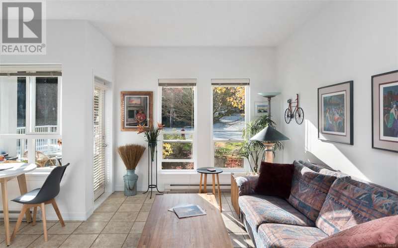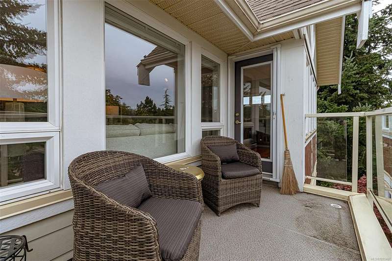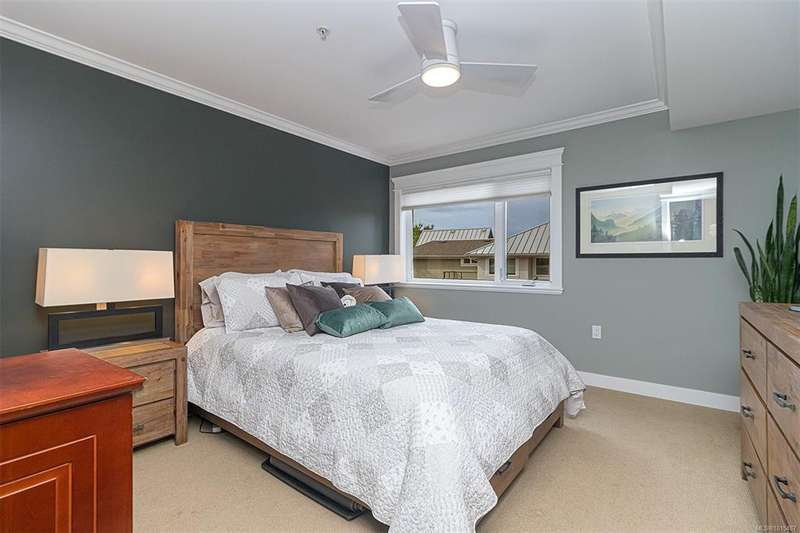 Welcome to your top-floor corner home with vaulted ceilings & floor-to-ceiling windows that flood your space w/natural light. Freshly painted throughout w/sleek new blinds, this place is move-in ready...literally nothing to do but unpack & relax. The smart, open-concept layout features hardwood floors & a spacious entry that flows effortlessly into two well-sized bedrooms. The living room is the perfect space to host your crew or just kick back & cozy up in comfort. The kitchen is ready for your inner chef w/granite countertops, stainless steel appliances, & a handy breakfast bar—perfect for morning coffee and easy flow to the large dining area, which has plenty of room for your full-size table & buffet or bar setup. The primary bedroom is a true retreat, with great closets & a spacious ensuite. The second bedroom is cross unit - perfect for privacy, guests, or home office. Set among beautifully landscaped grounds, an easy walk to Broadmead/Royal Oak shopping & to Commonwealth rec!