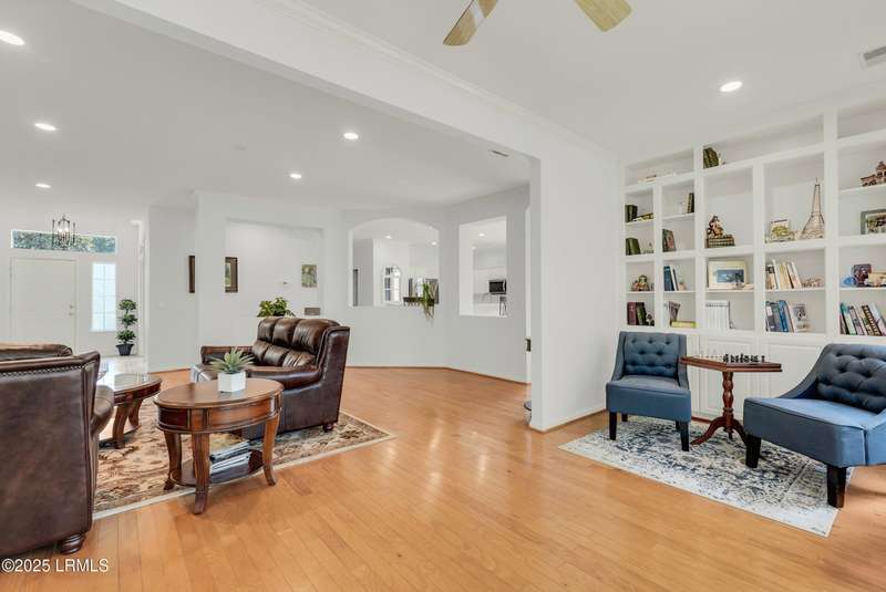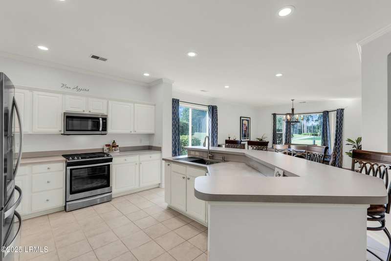 Enjoy serene views of the 8th green of the Okatie Creek golf course from this beautifully upgraded 3BD/2.5BA Charlotte Madison home in Sun City. Featuring an open-concept floor plan, this home offers a spacious great room, dining area & a Carolina room w/custom built-ins, perfect for relaxing or entertaining. The kitchen is well appointed w/stainless steel appliances, gas range & spacious pantry. Additional highlights include an oversized garage for extra storage, vinyl siding, smooth ceilings & bay windows in both the primary and guest bedrooms. This very private homesite is conveniently located b/w Town Square & Hidden Cypress.
