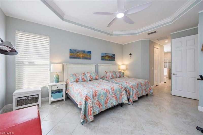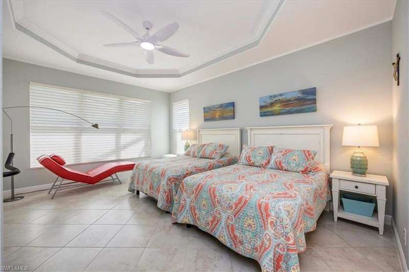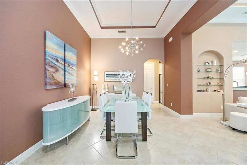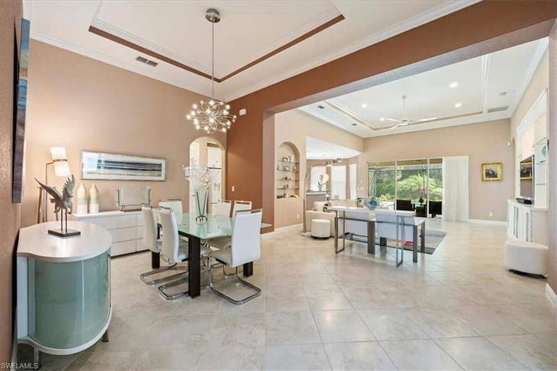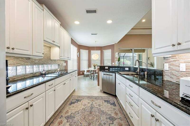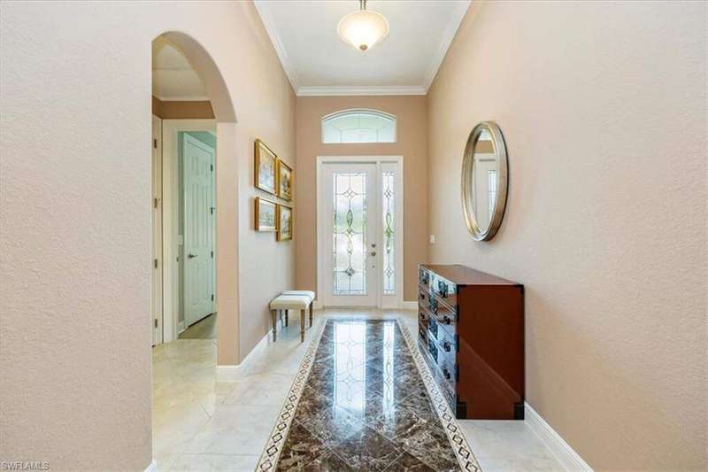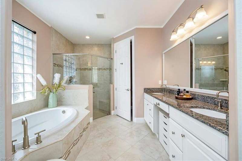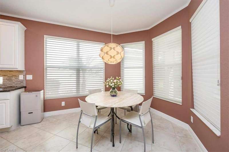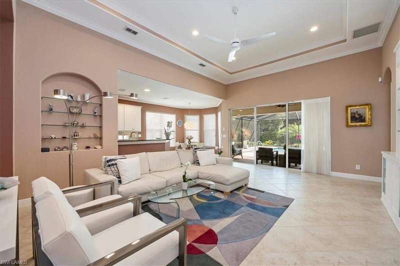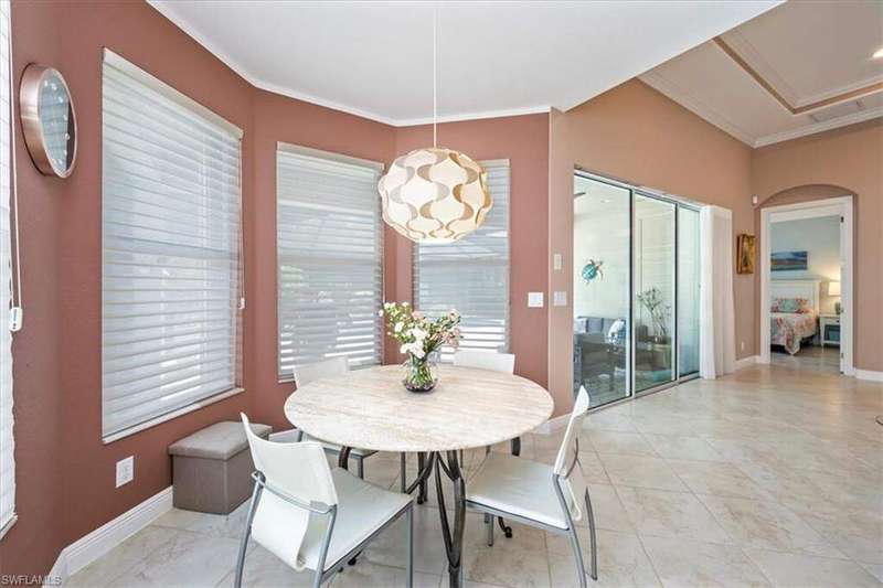 Meticulously maintained home in well-located gated single-family community. Move-In Ready! Spacious 2 bedroom + den home with formal dining, high ceilings featuring an incredible lanai and pool area surrounded by a lush tropical oasis. Foyer entry with marble insets, crown molding, upgraded LED lighting with dimmers including under cabinets. Custom built-ins in den and living room. Gracious master suite with pool access, electric shutters and dual closets. Features include: A/C 3 years old, Plantation shutters, pleated window shades, accordion shutters, impact front and garage doors, reverse osmosis system and all-house carbon system, NO CARPET, Husky cabinets in garage, saltwater pool with solar heat, ADT security included in community maintenance plus exterior cameras. Popular community just minutes to downtown Naples and the beautiful Gulf beaches!