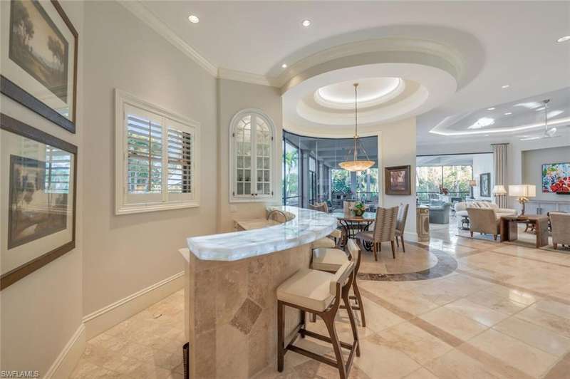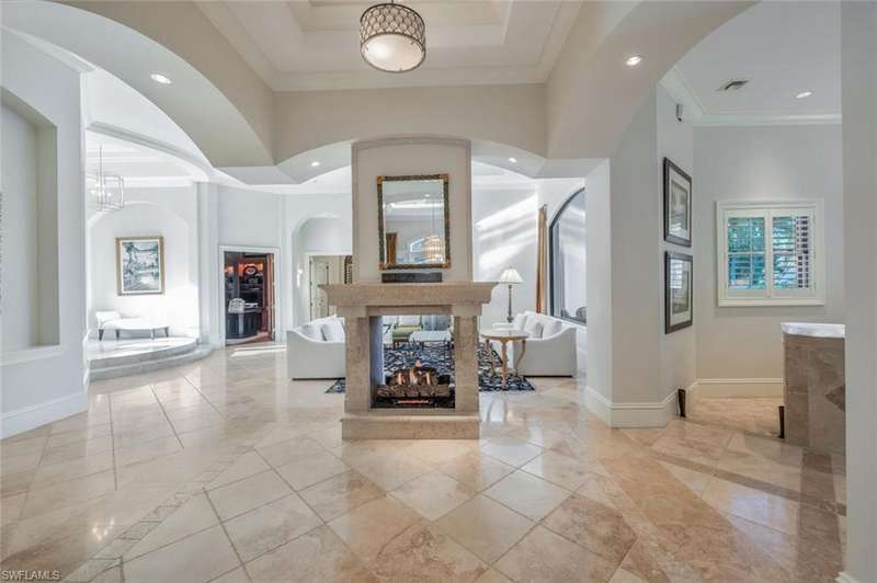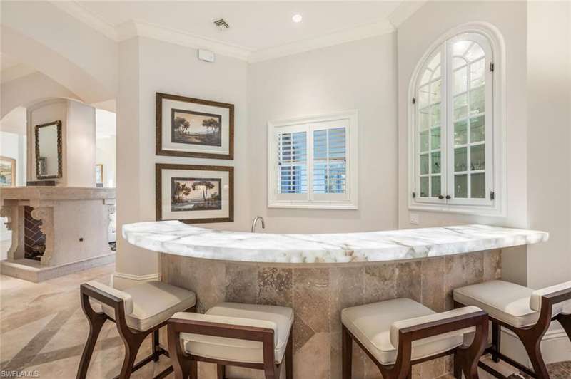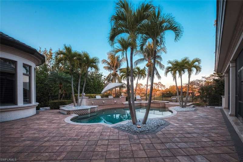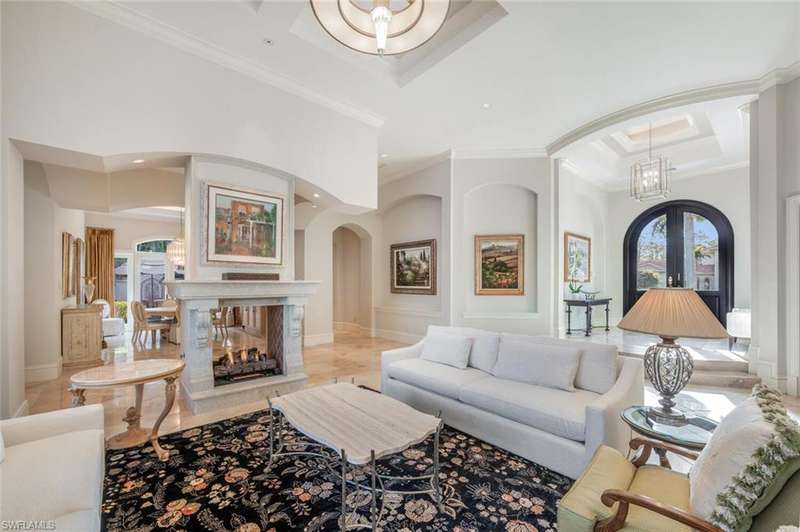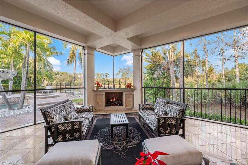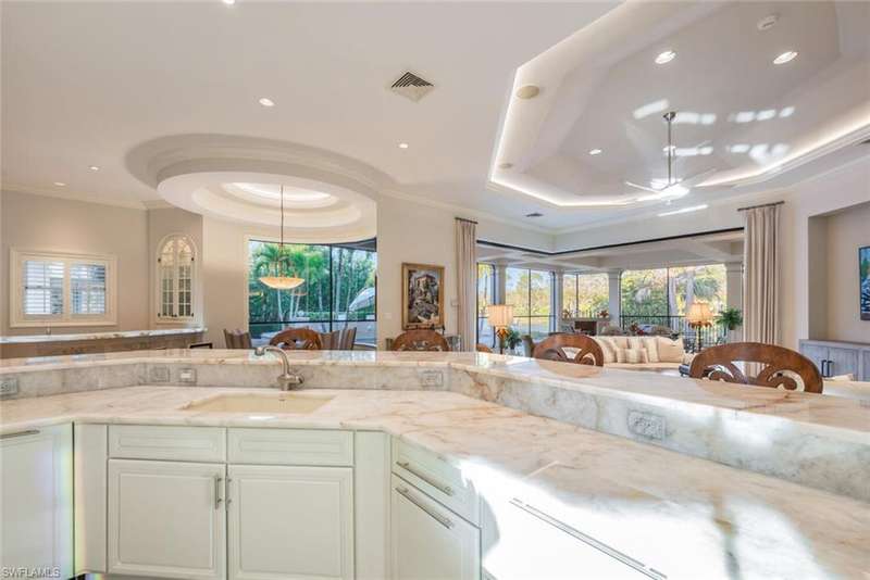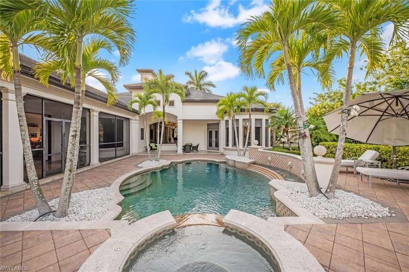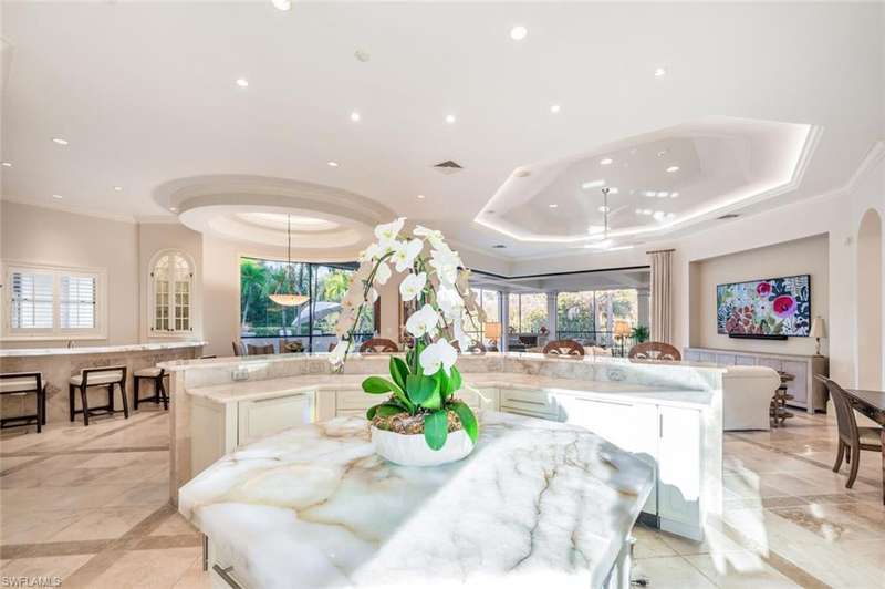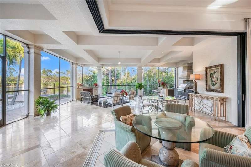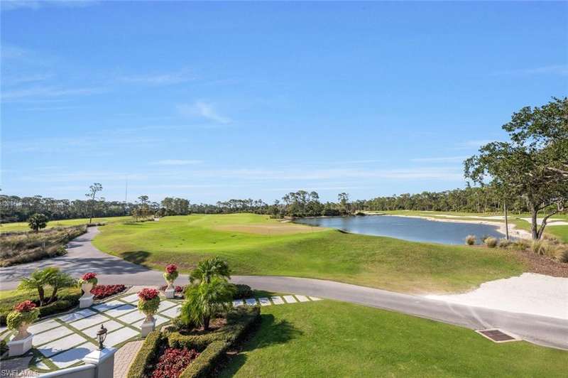 NO WAITING GOLF MEMBERSHIP OFFERED WITH HOME SALE. The Best Priced McGarvey Custom Luxury Estate Home in Mediterra. This stunning property not only welcomes you to unparalleled elegance and grants you immediate access to a highly sought-after golf membership. The inviting paver motor court beckons you forward, setting the stage for the magnificence that lies within. Enter through the grand gallery foyer to be struck by sweeping views of the sparkling pool and serene lake, perfectly framed by the sixth hole of the exquisite golf course. The formal living room dazzles with high seamless windows and a double-sided gas fireplace, creating an indulgent space perfect for relaxation or entertaining guests. Step into a world of sophistication, with soaring ceilings embellished with coffered and tray details, crown moldings, and magnificent custom stone flooring. A chef's kitchen is truly a culinary paradise, boasting abundant white cabinetry, top-tier Viking and Subzero appliances, and lumi
