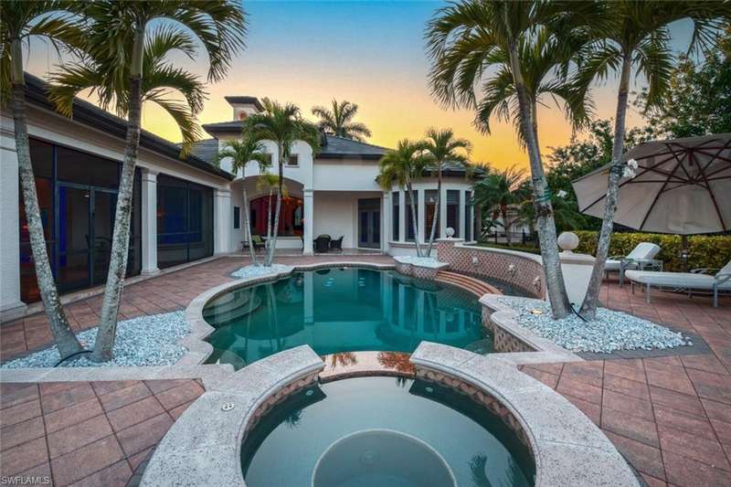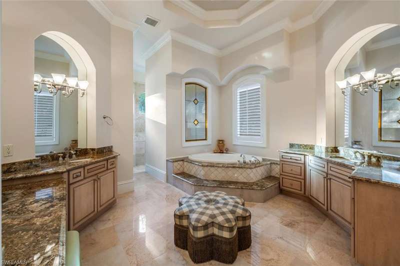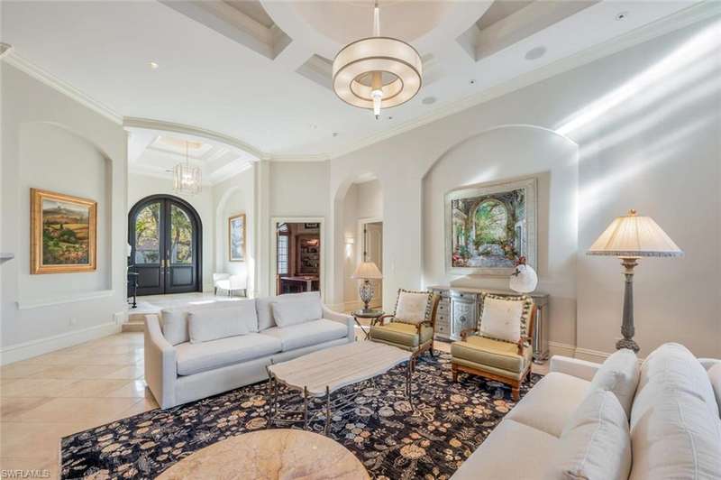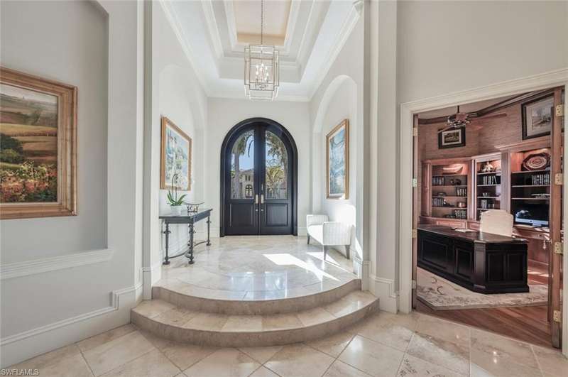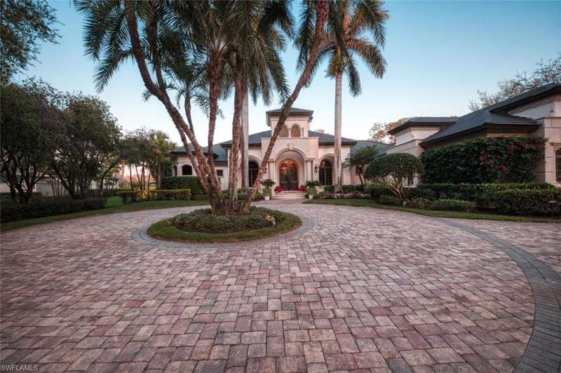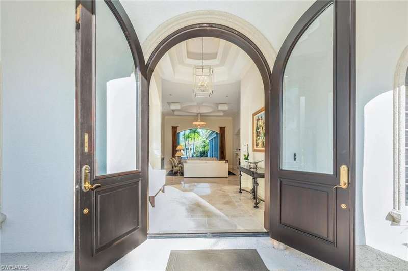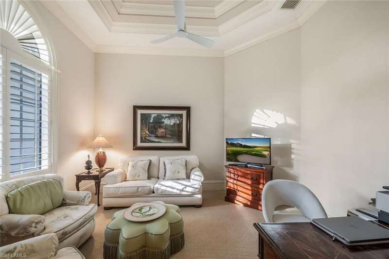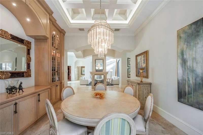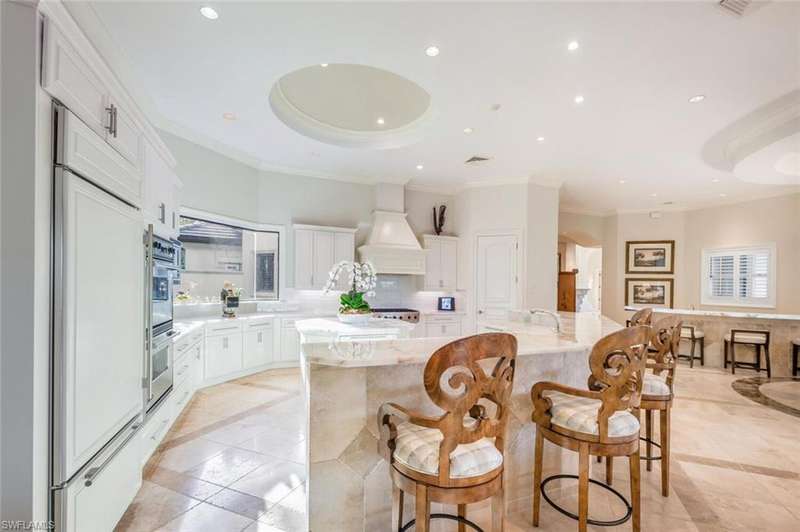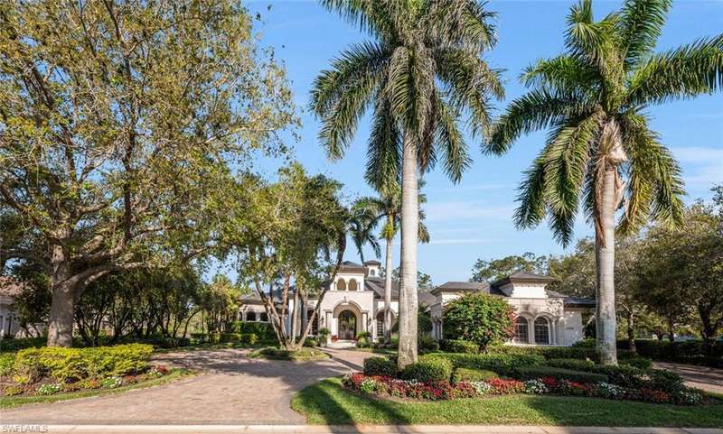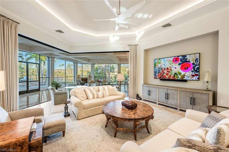 NO WAITING GOLF MEMBERSHIP OFFERED WITH HOME SALE. The Best Priced McGarvey Custom Luxury Estate Home in Mediterra. This stunning property not only welcomes you to unparalleled elegance and grants you immediate access to a highly sought-after golf membership. The inviting paver motor court beckons you forward, setting the stage for the magnificence that lies within. Enter through the grand gallery foyer to be struck by sweeping views of the sparkling pool and serene lake, perfectly framed by the sixth hole of the exquisite golf course. The formal living room dazzles with high seamless windows and a double-sided gas fireplace, creating an indulgent space perfect for relaxation or entertaining guests. Step into a world of sophistication, with soaring ceilings embellished with coffered and tray details, crown moldings, and magnificent custom stone flooring. A chef's kitchen is truly a culinary paradise, boasting abundant white cabinetry, top-tier Viking and Subzero appliances, and lumi