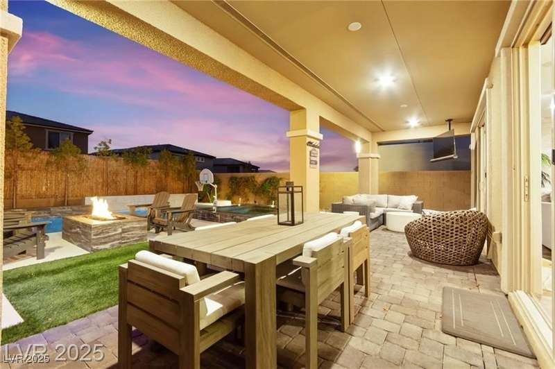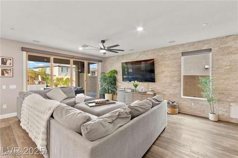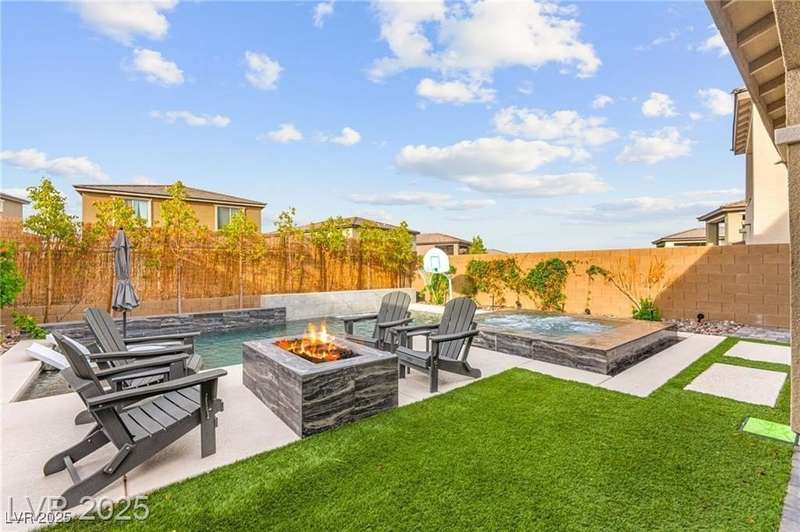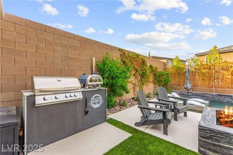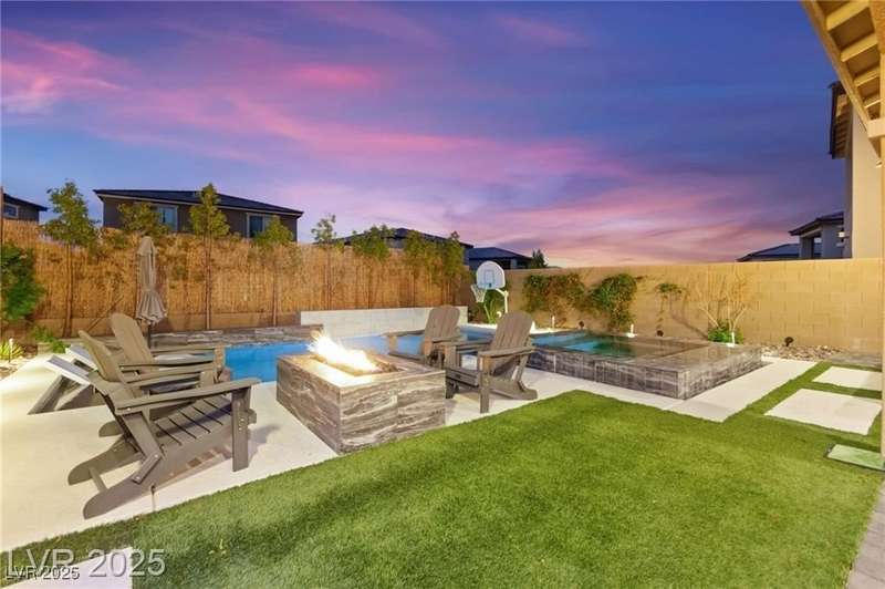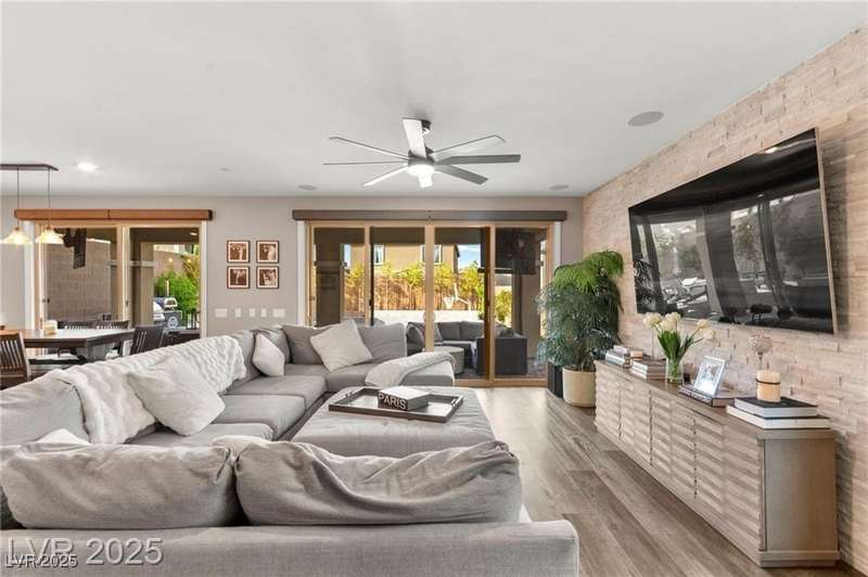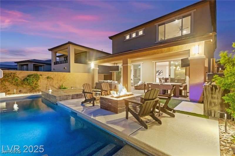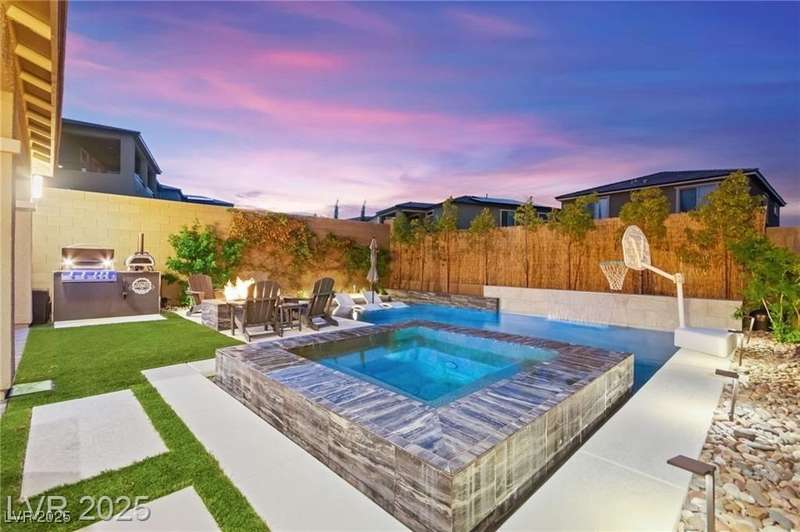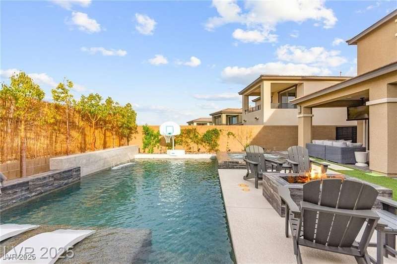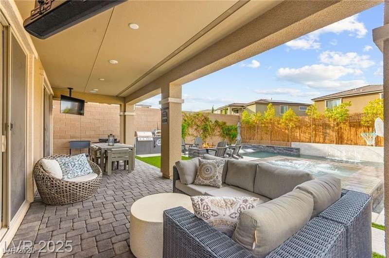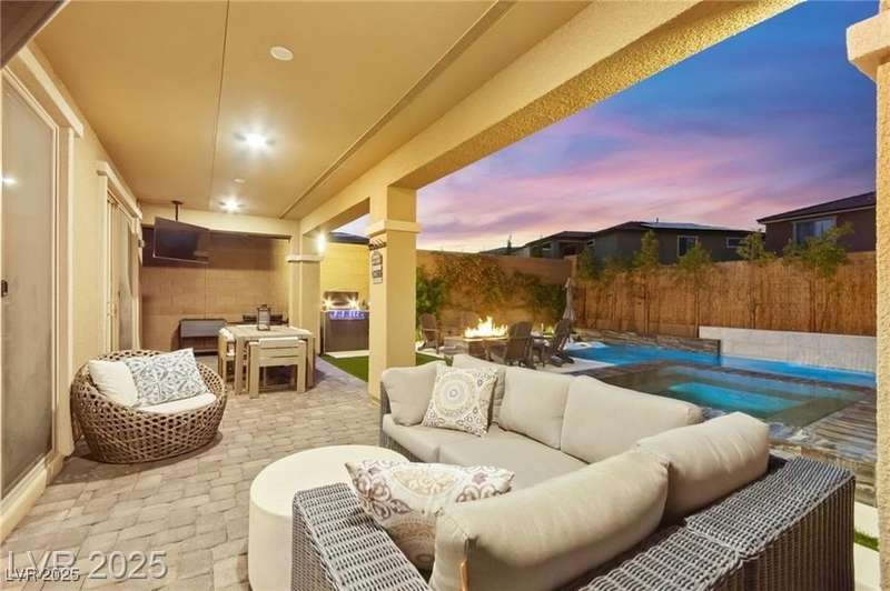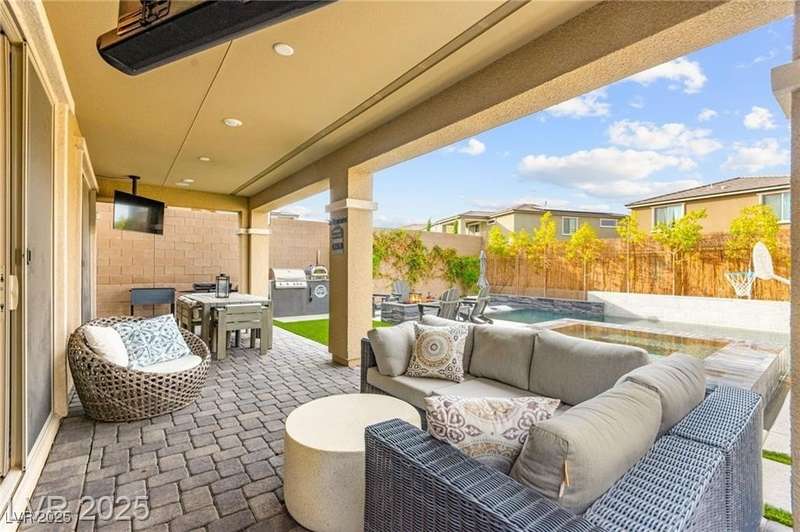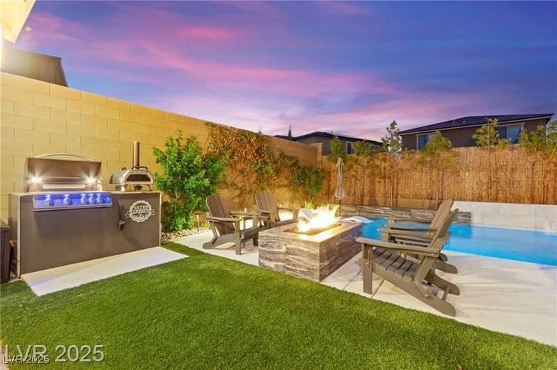 Step into this beautifully upgraded 4-bedroom, 3-bath West Summerlin home, where luxury and comfort meet. The chef’s kitchen is a showstopper, featuring a Sub-Zero fridge, custom ice maker, wine fridge, extended cabinetry, and a generously sized island—perfect for everyday living and entertaining. Light-filled, open spaces are highlighted by LVP flooring, designer window treatments, surround sound, and a striking stone feature wall in the living room. The spacious primary suite includes a custom walk-in closet with built-ins, while dual sliding doors open to a backyard oasis with full-length power shades, sparkling pool with wet lounge deck, elevated spa with water feature, fire pit, and a fully equipped outdoor kitchen. The covered patio with dual TVs is ideal for relaxing or hosting. Additional touches include meticulous landscaping and a dog run with turf, dual gates, and doggie door—every detail designed for comfort and style.