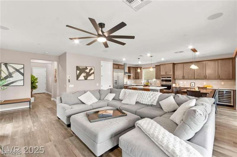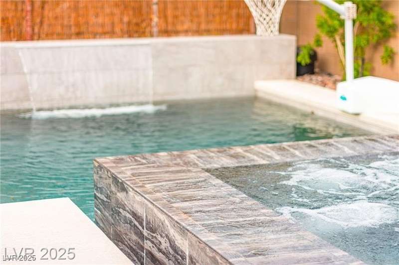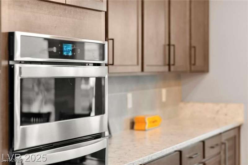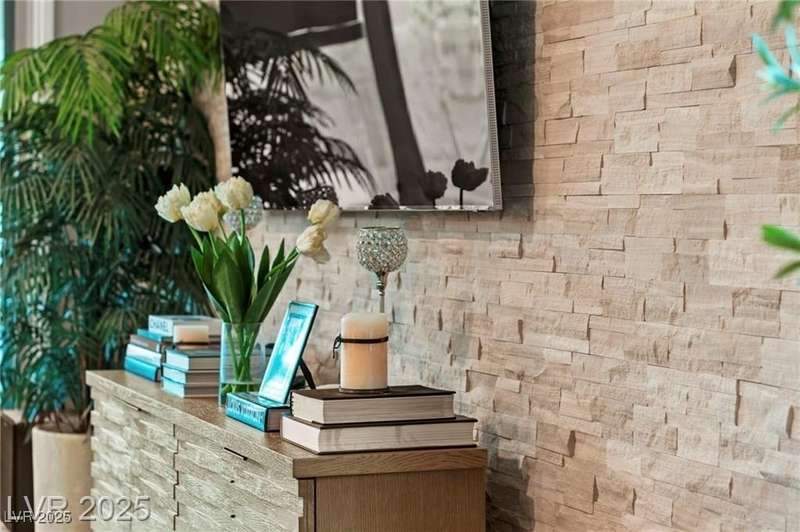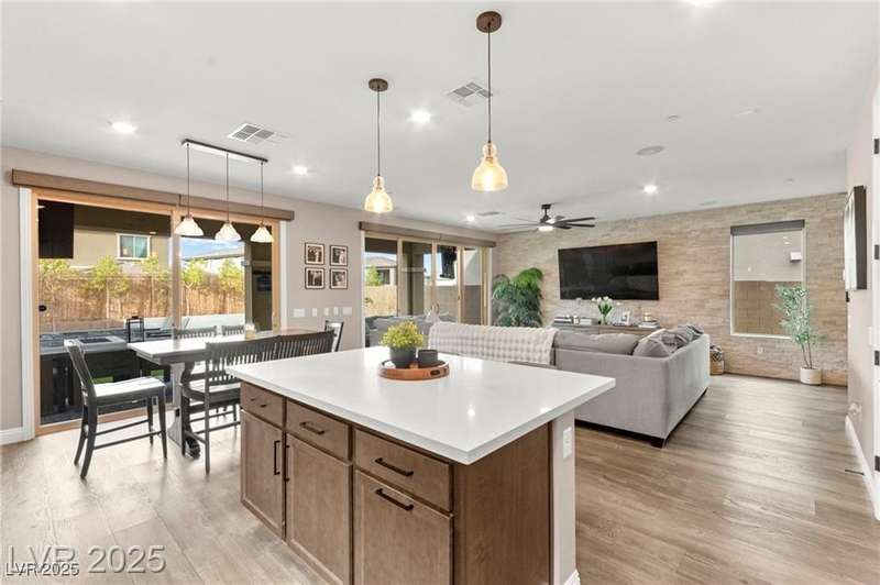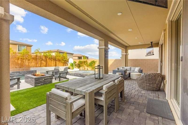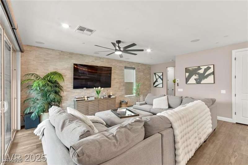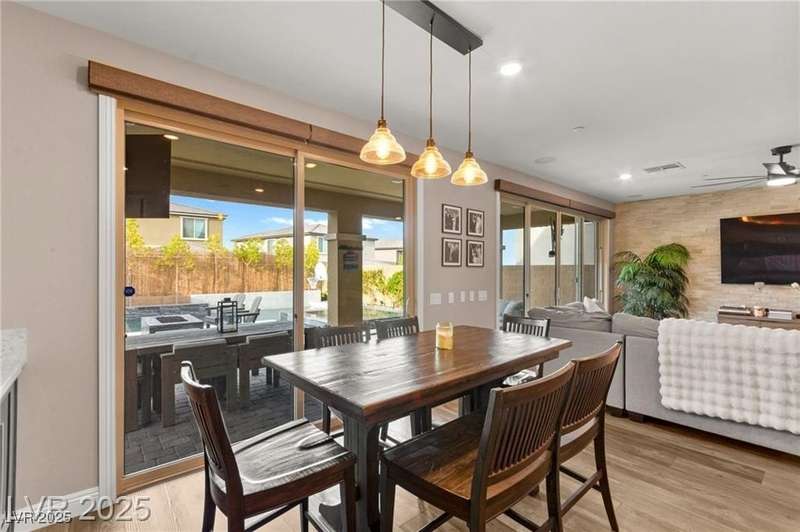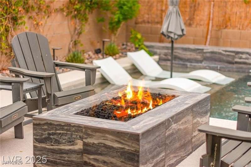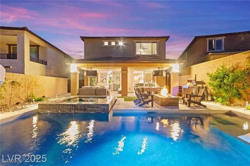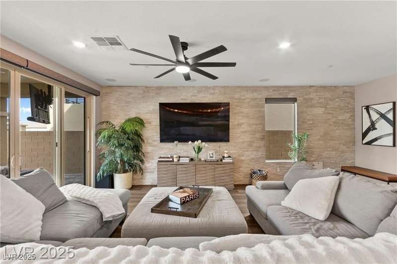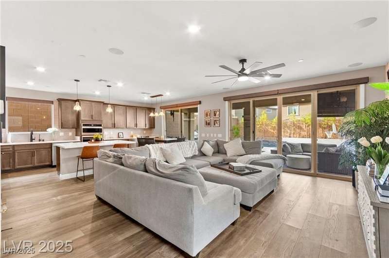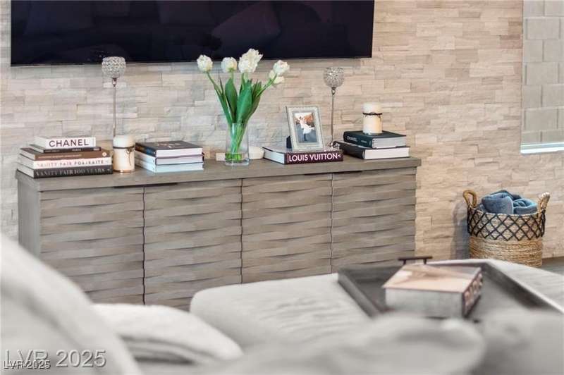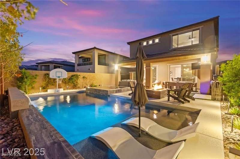 Step into this beautifully upgraded 4-bedroom, 3-bath West Summerlin home, where luxury and comfort meet. The chef’s kitchen is a showstopper, featuring a Sub-Zero fridge, custom ice maker, wine fridge, extended cabinetry, and a generously sized island—perfect for everyday living and entertaining. Light-filled, open spaces are highlighted by LVP flooring, designer window treatments, surround sound, and a striking stone feature wall in the living room. The spacious primary suite includes a custom walk-in closet with built-ins, while dual sliding doors open to a backyard oasis with full-length power shades, sparkling pool with wet lounge deck, elevated spa with water feature, fire pit, and a fully equipped outdoor kitchen. The covered patio with dual TVs is ideal for relaxing or hosting. Additional touches include meticulous landscaping and a dog run with turf, dual gates, and doggie door—every detail designed for comfort and style.