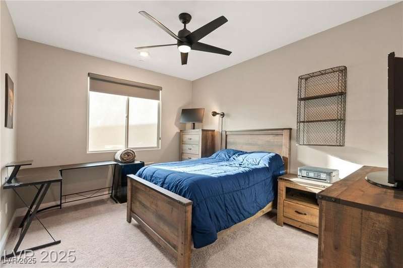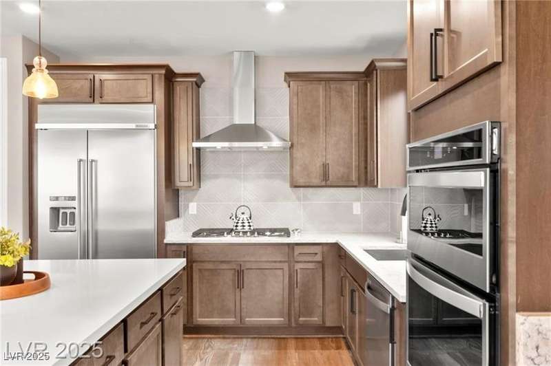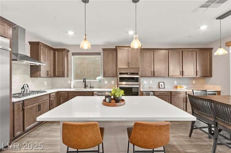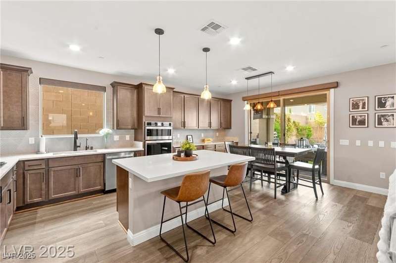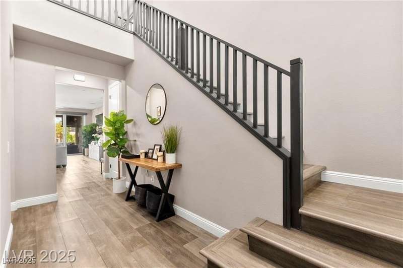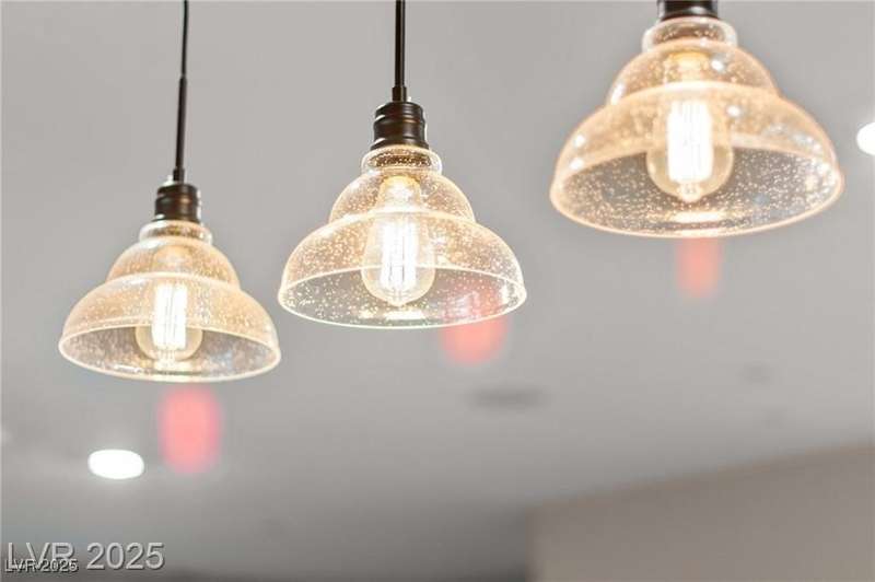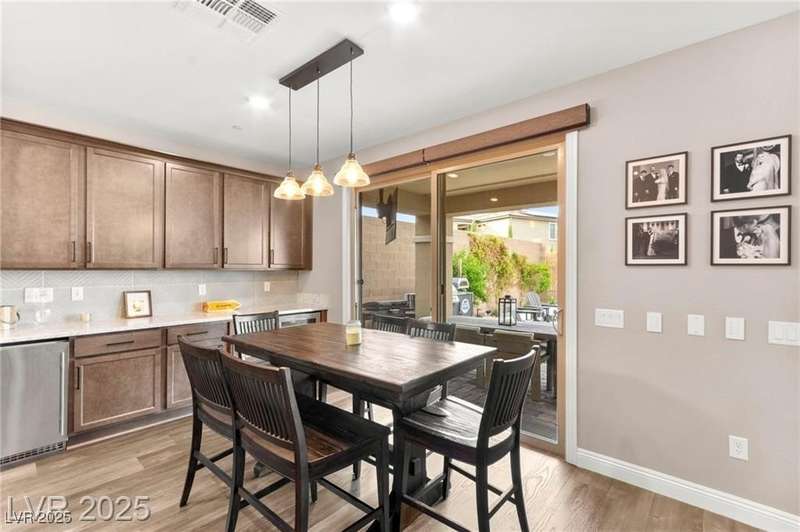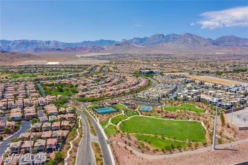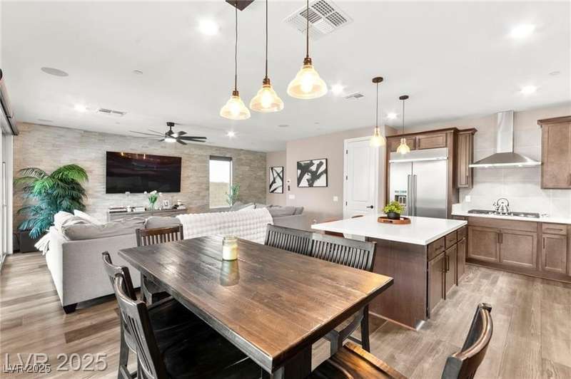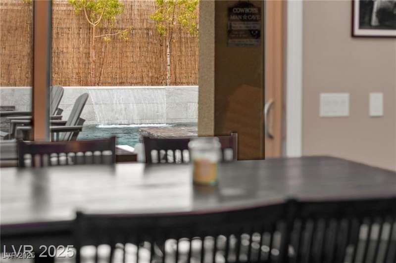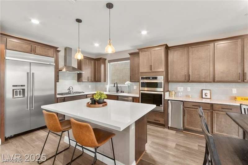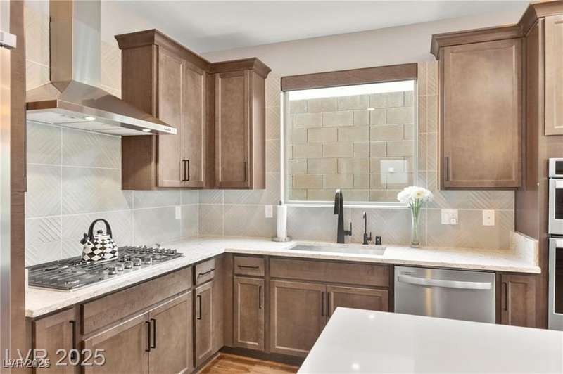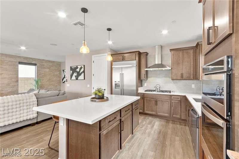 Step into this beautifully upgraded 4-bedroom, 3-bath West Summerlin home, where luxury and comfort meet. The chef’s kitchen is a showstopper, featuring a Sub-Zero fridge, custom ice maker, wine fridge, extended cabinetry, and a generously sized island—perfect for everyday living and entertaining. Light-filled, open spaces are highlighted by LVP flooring, designer window treatments, surround sound, and a striking stone feature wall in the living room. The spacious primary suite includes a custom walk-in closet with built-ins, while dual sliding doors open to a backyard oasis with full-length power shades, sparkling pool with wet lounge deck, elevated spa with water feature, fire pit, and a fully equipped outdoor kitchen. The covered patio with dual TVs is ideal for relaxing or hosting. Additional touches include meticulous landscaping and a dog run with turf, dual gates, and doggie door—every detail designed for comfort and style.