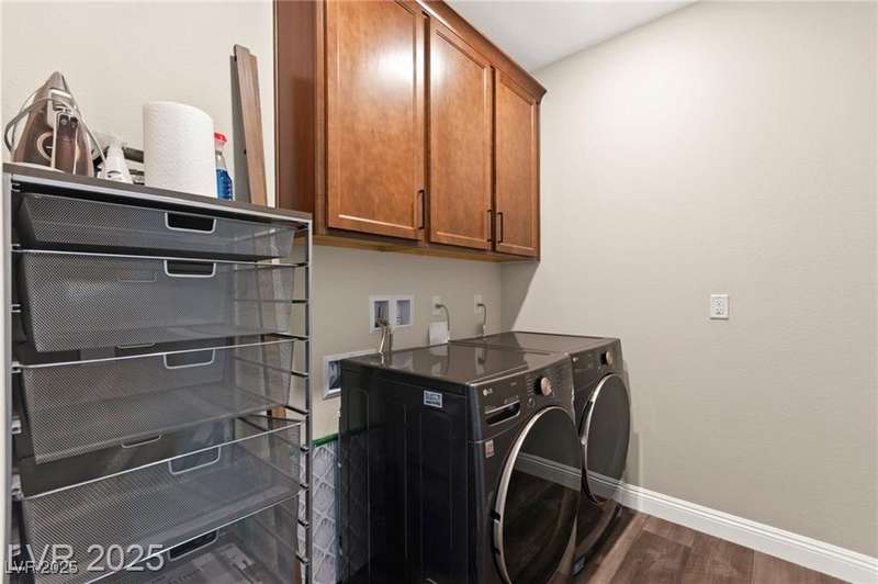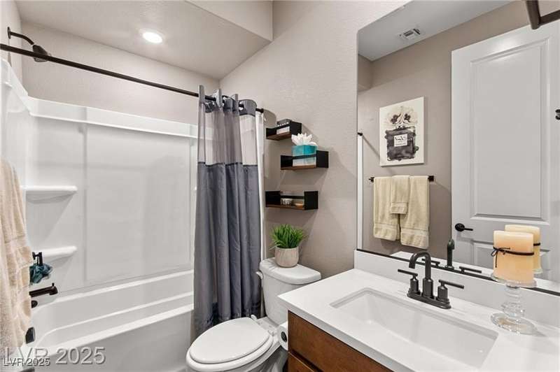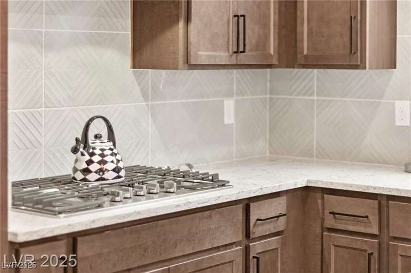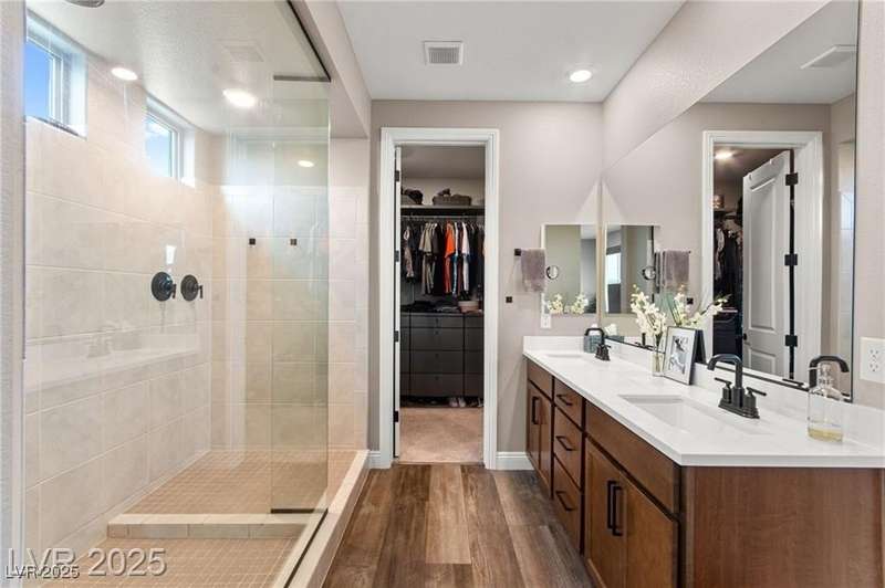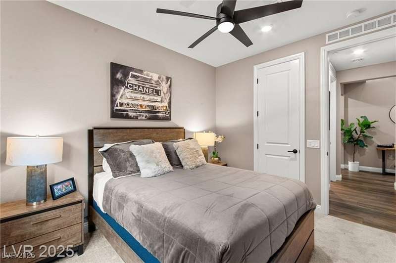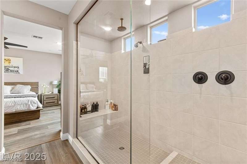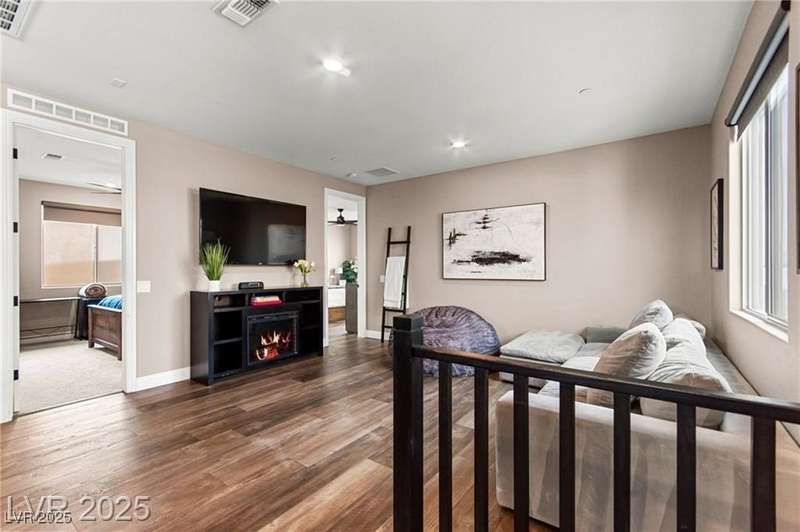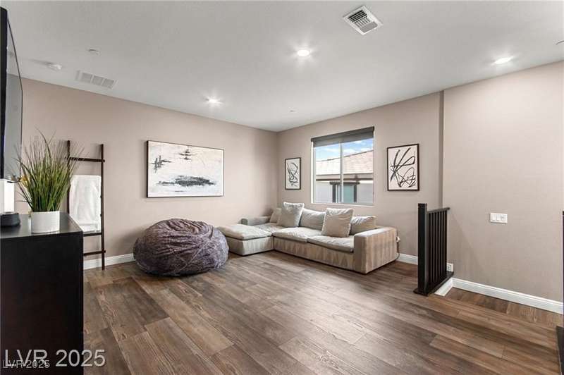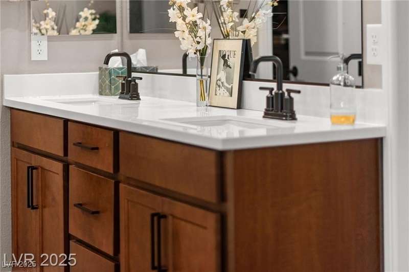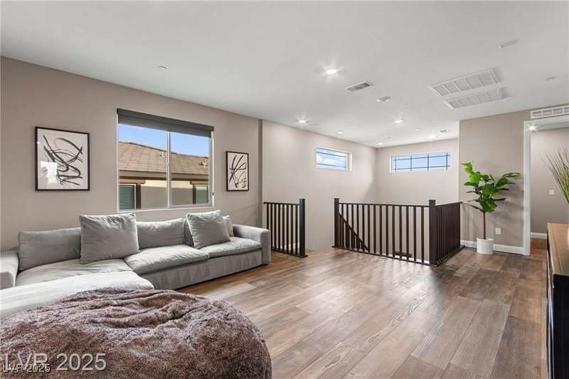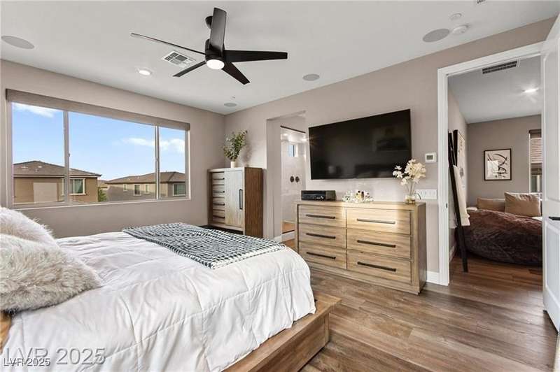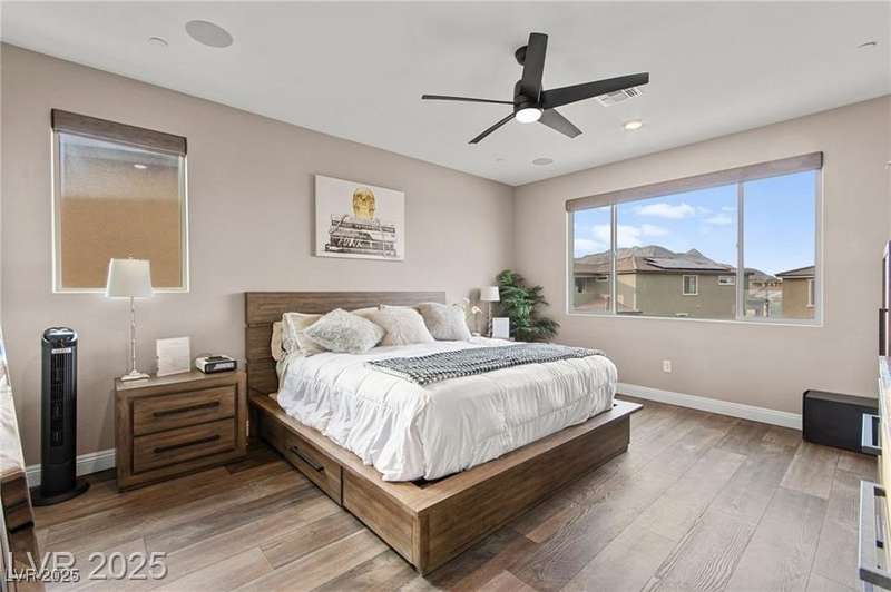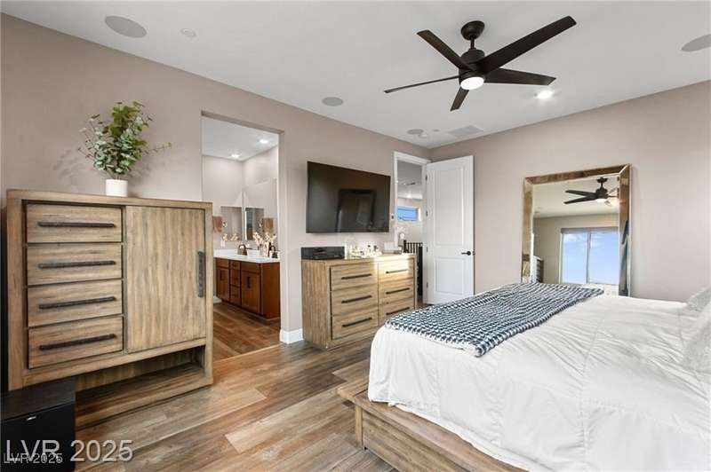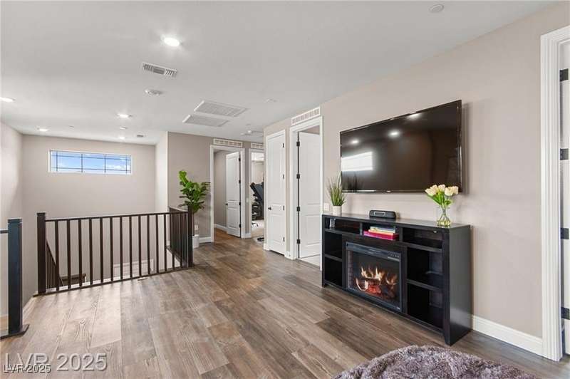 Step into this beautifully upgraded 4-bedroom, 3-bath West Summerlin home, where luxury and comfort meet. The chef’s kitchen is a showstopper, featuring a Sub-Zero fridge, custom ice maker, wine fridge, extended cabinetry, and a generously sized island—perfect for everyday living and entertaining. Light-filled, open spaces are highlighted by LVP flooring, designer window treatments, surround sound, and a striking stone feature wall in the living room. The spacious primary suite includes a custom walk-in closet with built-ins, while dual sliding doors open to a backyard oasis with full-length power shades, sparkling pool with wet lounge deck, elevated spa with water feature, fire pit, and a fully equipped outdoor kitchen. The covered patio with dual TVs is ideal for relaxing or hosting. Additional touches include meticulous landscaping and a dog run with turf, dual gates, and doggie door—every detail designed for comfort and style.