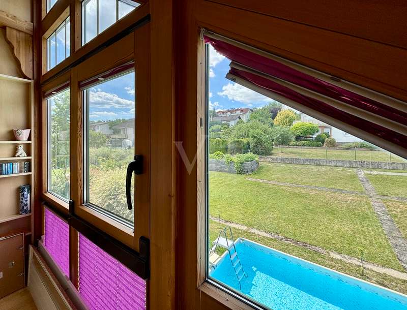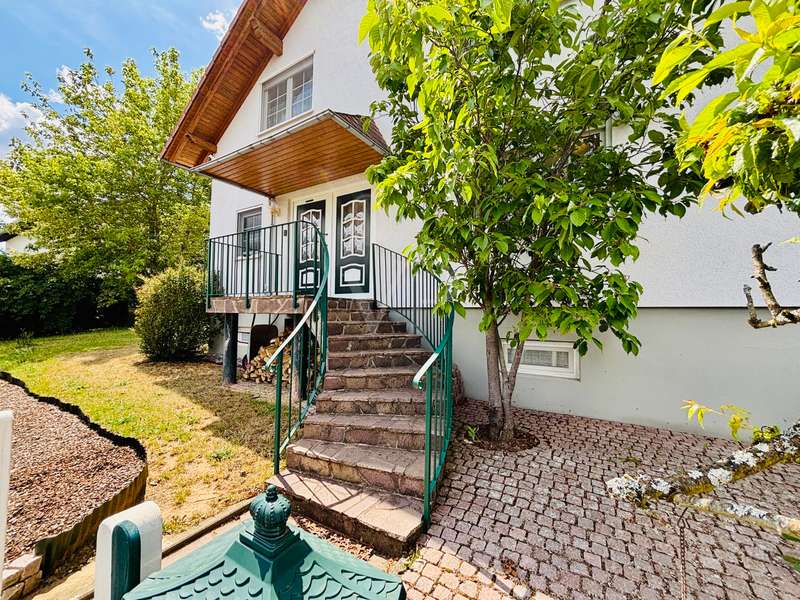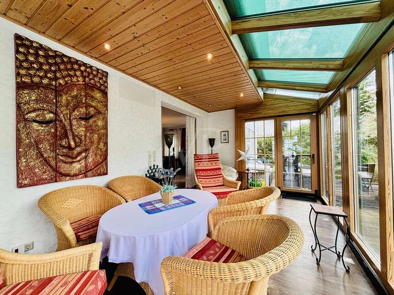 The well-kept detached house, built in 1999 in high-quality timber frame construction, has been constantly kept up to date through various modernizations. The total living space of approx. 150 m² extends over two levels and, with 5 generously proportioned rooms, including 3 bedrooms, offers ideal conditions for families or couples requiring more space. The spacious living area is equipped with a wood-burning stove, which provides cozy warmth in the cooler months of the year. The adjoining kitchen, which was modernized in 2010, conveys a pleasant living feeling thanks to its well thought-out room layout and functional equipment. Two modern bathrooms, which were also renovated in 2010, offer comfort with a bathtub or shower and are stylishly tiled. Particularly noteworthy is the conservatory, which was added in 2010 and has underfloor heating for cozy use even on cold days. From here you can access the large terrace, which invites you to relax. The garden, situated on a plot of approx. 549 m², impresses with its mature trees and provides shade and privacy. A cistern supports the garden maintenance and underlines the well thought-out utilization concept of the outdoor area. The house has a full basement with utility and storage rooms as well as a sauna. The central heating system was replaced in 2022 with a modern Viessmann Vitodens 200 model, ensuring energy-efficient and reliable operation. The air conditioning system installed in almost all rooms ensures pleasant temperatures even on warmer days. Outside, the property also features a garage with an electric door, which offers convenient and secure space for a vehicle. A wallbox also allows for convenient charging of an electric car.Overall, this spacious and well-appointed home represents an excellent opportunity to secure a long-term home that combines both comfort and practical features. The forward-thinking state of maintenance and extensive modernization contribute to the value of the property.