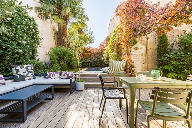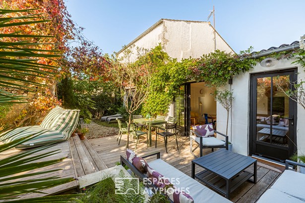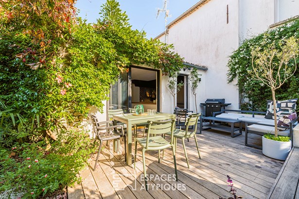 Outside, the space extends onto a wooden terrace surrounded by greenery. The heated salt-water pool, a true haven of freshness, naturally finds its place in this lush, secluded garden, enhanced by an automatic watering system.