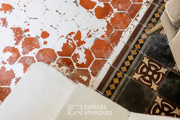 The entrance opens onto a welcoming kitchen designed for shared moments, extending into a light-filled living room. The cement tiles, original floor tiles, a fireplace insert, and large windows overlooking the garden create a warm and timeless decor. A bedroom with a private bathroom completes the ground floor, as well as a laundry room and a separate toilet.