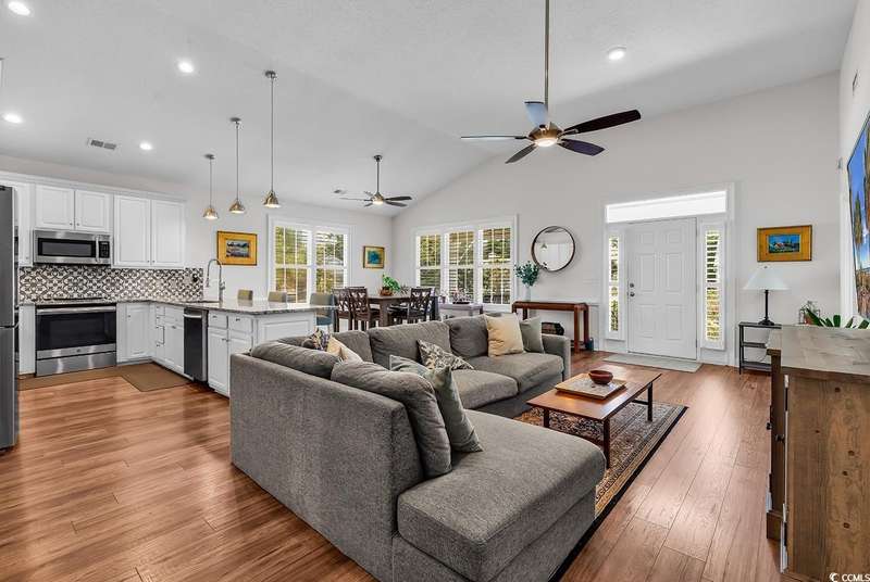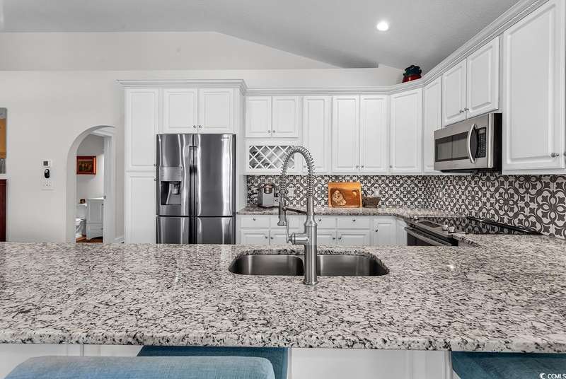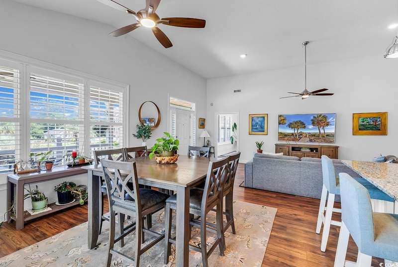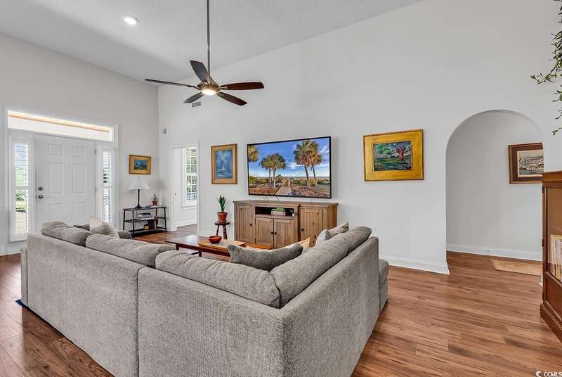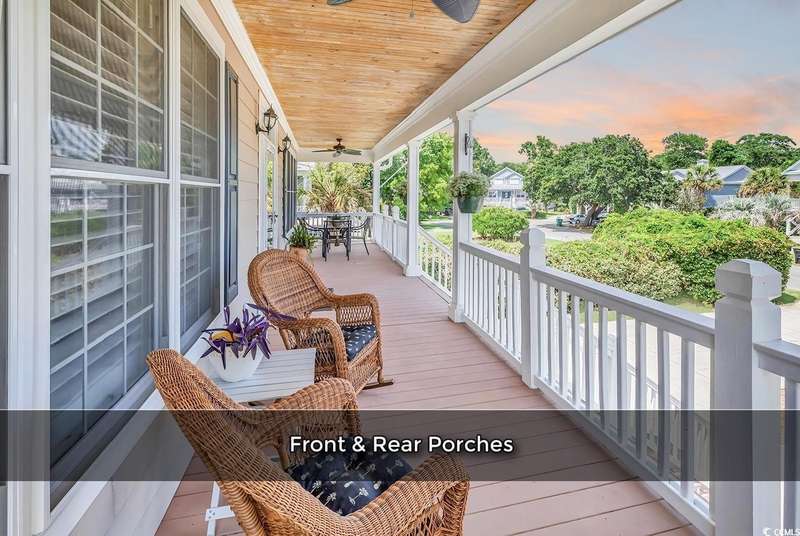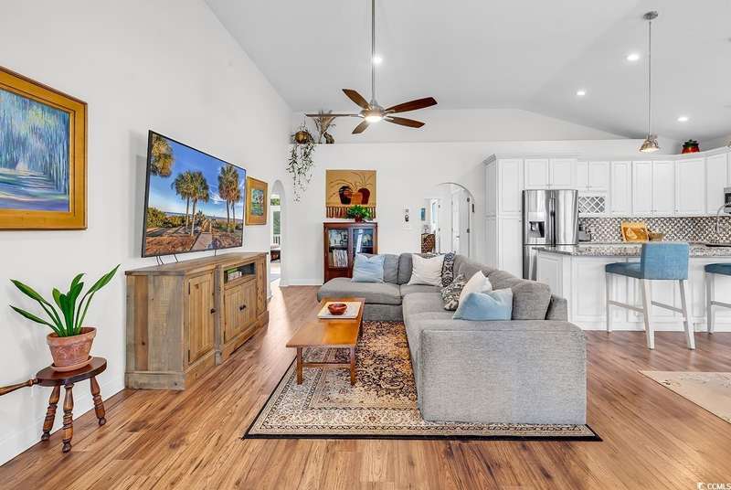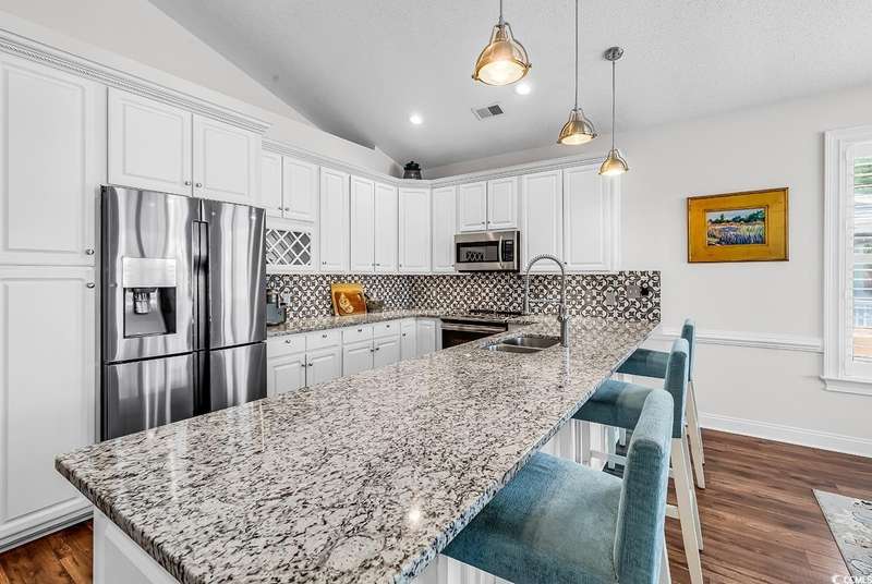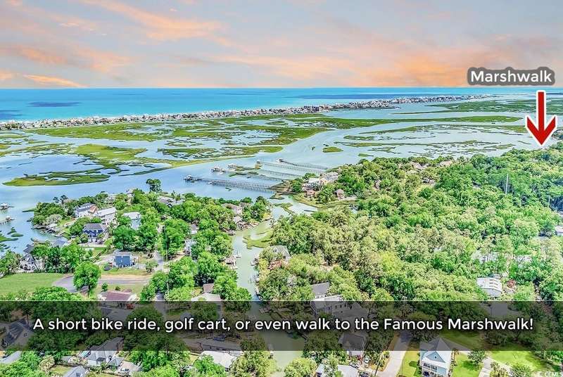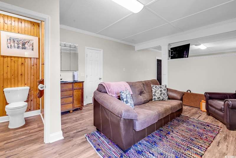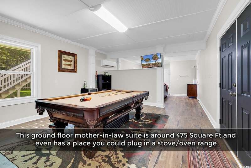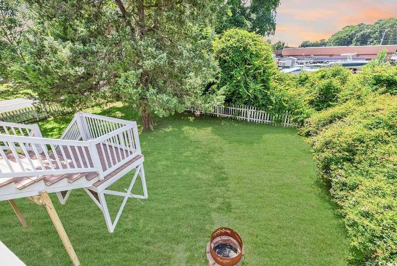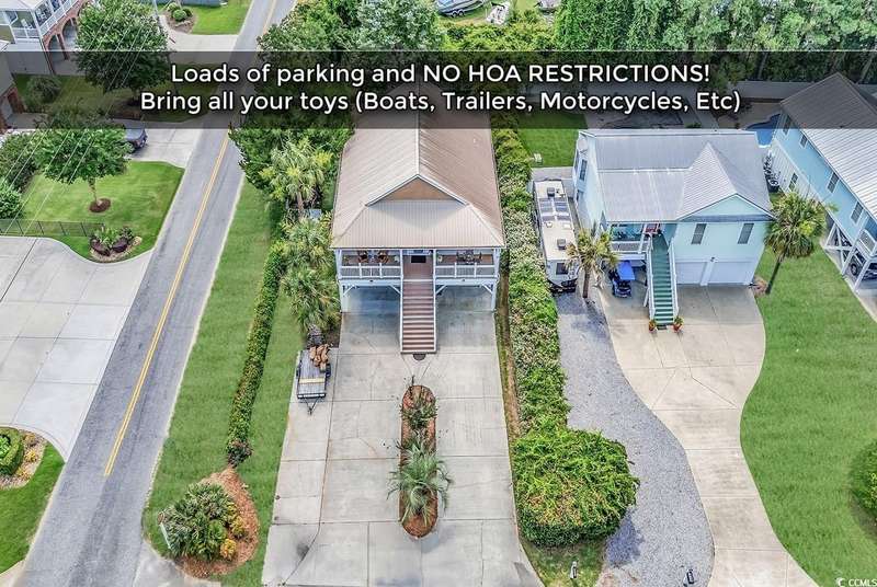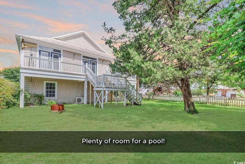 Welcome to your perfect coastal retreat, where comfort and convenience come together in this spacious and thoughtfully designed home. The open-concept living area flows seamlessly into a beautifully appointed kitchen featuring custom coastal white cabinets, a chic backsplash, stainless steel appliances, and granite countertops. The living room is highlighted by a soaring cathedral ceiling, creating an airy and inviting atmosphere. The upstairs of this home offers four bedrooms (including a dedicated office space, providing flexibility for families or remote work needs). The oversized master suite includes a walk-in closet and a luxurious bathroom with double vanities, a separate shower, and a soaking tub. No carpeting throughout ensures easy maintenance and a clean, modern look. Downstairs, the private mother-in-law suite includes a living area, bedroom, and full bathroom—all with zero stairs, ideal for guests or extended family. The laundry room is equipped with a convenient mud sink for added functionality. Enjoy peace and privacy with established hedges surrounding a generous lot large enough to accommodate a swimming pool. There's plenty of parking, including space beneath the home. Built with durable concrete fiber siding and topped with a metal roof, this property offers long-term savings on maintenance. Located within walking distance to restaurants, entertainment, and just steps from the Murrells Inlet bike path, you’ll be in the heart of it all. With no HOA or restrictions, this also means short-term rentals, such as VRBO and Airbnb, may be possible (Seller checked the deed and title policy and it appears as though there are no restrictions pertaining to short-term rentals). This option offers not only the perfect Inlet-side dream home but also an investment opportunity.
