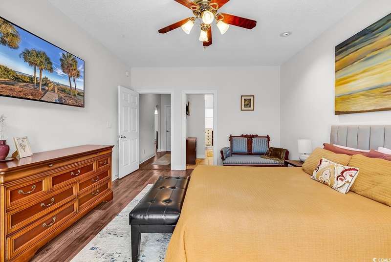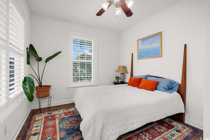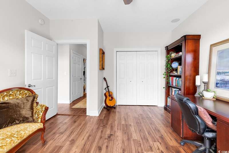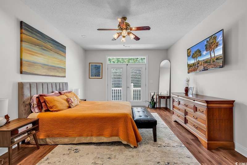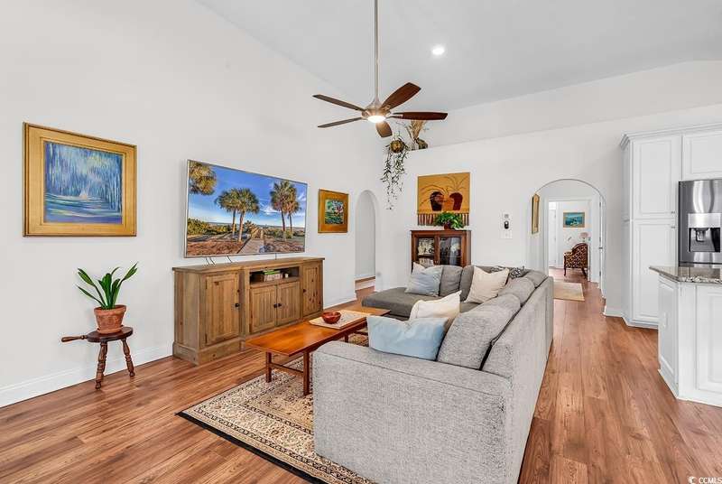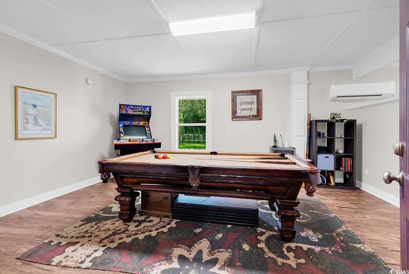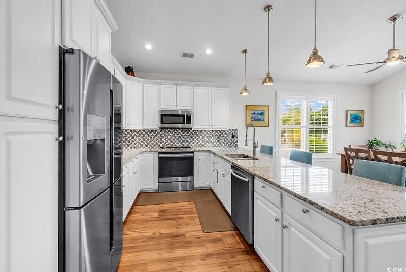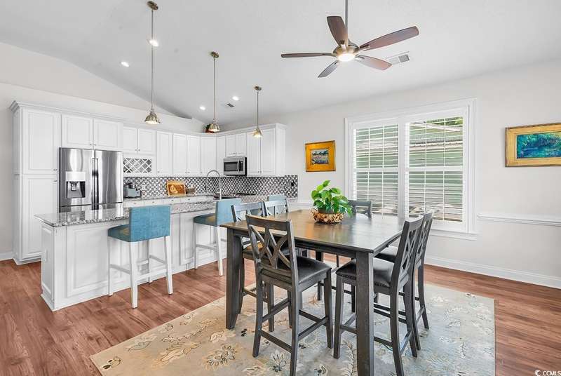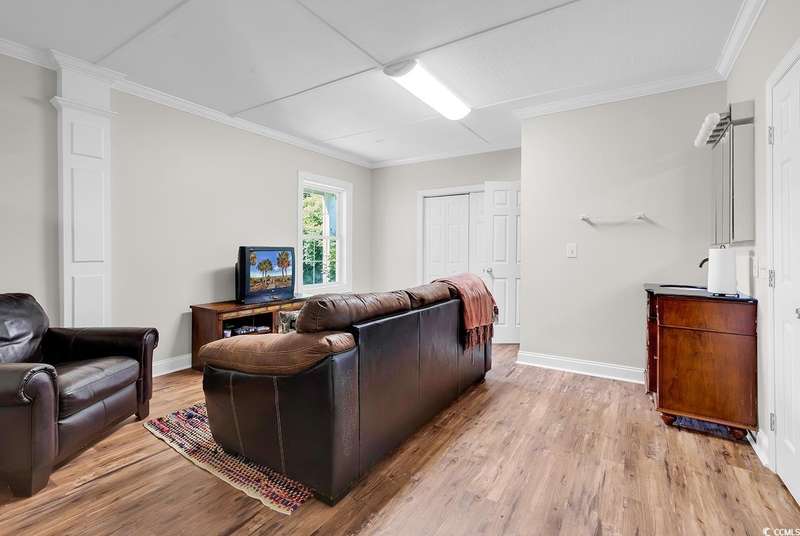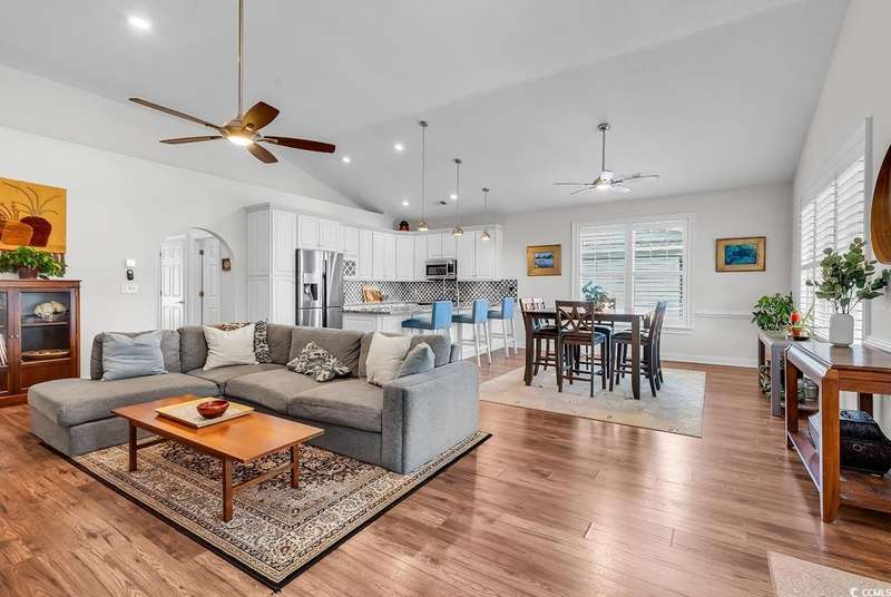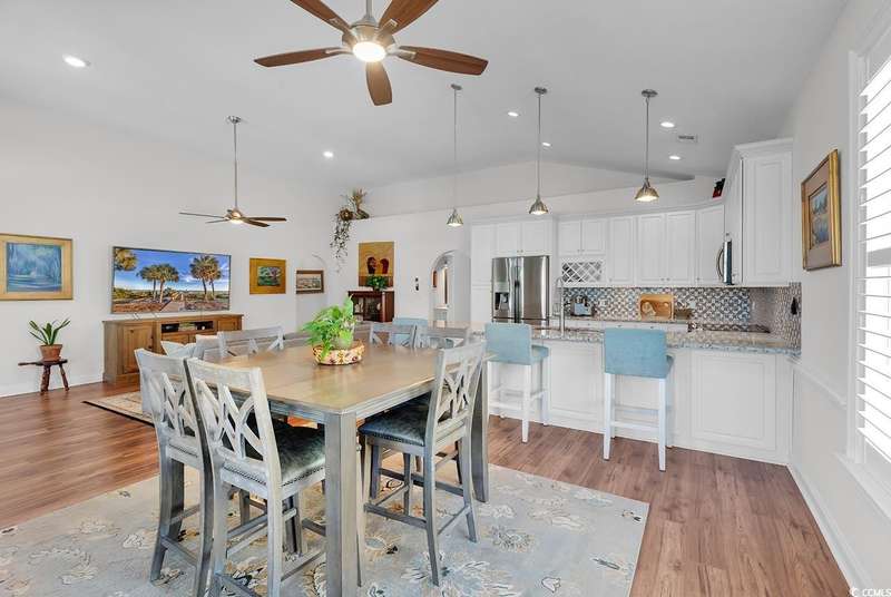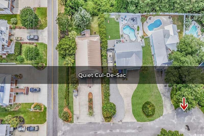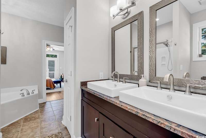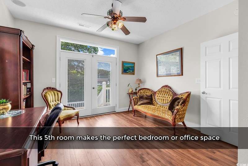 Welcome to your perfect coastal retreat, where comfort and convenience come together in this spacious and thoughtfully designed home. The open-concept living area flows seamlessly into a beautifully appointed kitchen featuring custom coastal white cabinets, a chic backsplash, stainless steel appliances, and granite countertops. The living room is highlighted by a soaring cathedral ceiling, creating an airy and inviting atmosphere. The upstairs of this home offers four bedrooms (including a dedicated office space, providing flexibility for families or remote work needs). The oversized master suite includes a walk-in closet and a luxurious bathroom with double vanities, a separate shower, and a soaking tub. No carpeting throughout ensures easy maintenance and a clean, modern look. Downstairs, the private mother-in-law suite includes a living area, bedroom, and full bathroom—all with zero stairs, ideal for guests or extended family. The laundry room is equipped with a convenient mud sink for added functionality. Enjoy peace and privacy with established hedges surrounding a generous lot large enough to accommodate a swimming pool. There's plenty of parking, including space beneath the home. Built with durable concrete fiber siding and topped with a metal roof, this property offers long-term savings on maintenance. Located within walking distance to restaurants, entertainment, and just steps from the Murrells Inlet bike path, you’ll be in the heart of it all. With no HOA or restrictions, this also means short-term rentals, such as VRBO and Airbnb, may be possible (Seller checked the deed and title policy and it appears as though there are no restrictions pertaining to short-term rentals). This option offers not only the perfect Inlet-side dream home but also an investment opportunity.