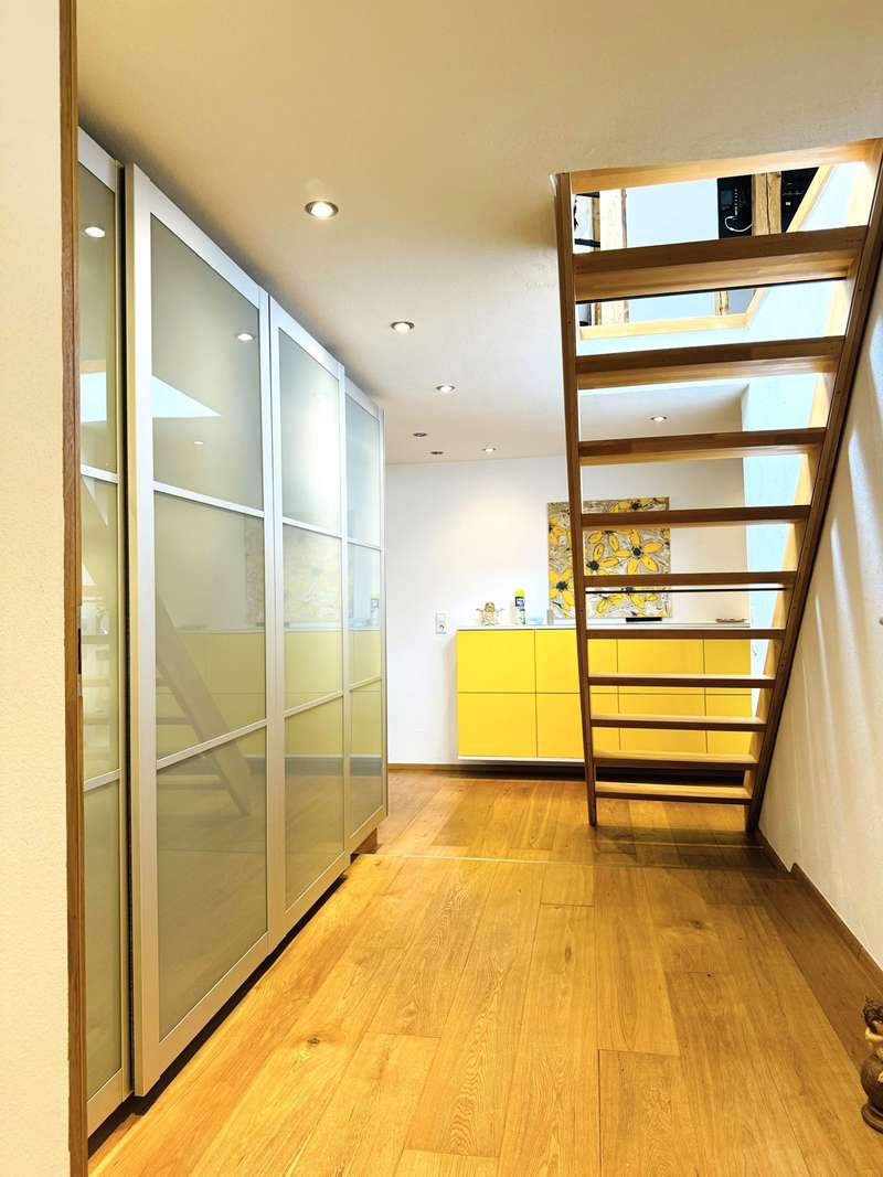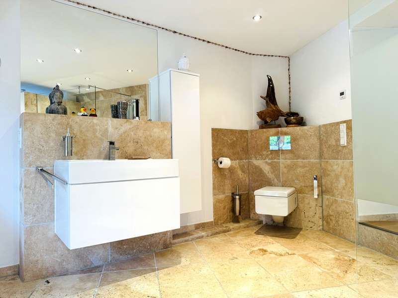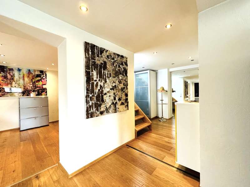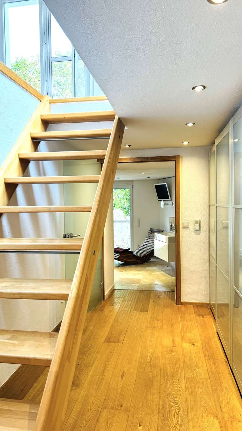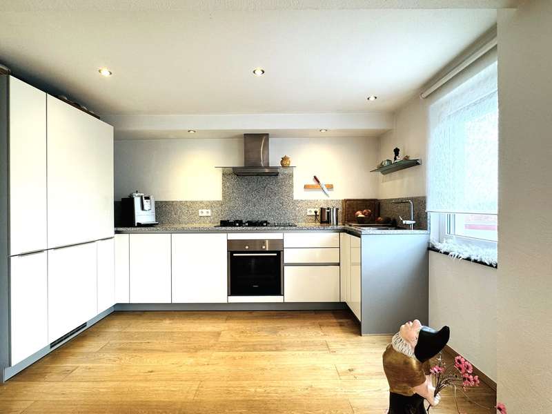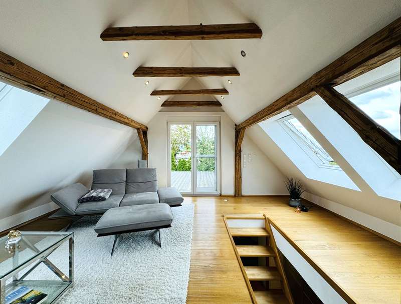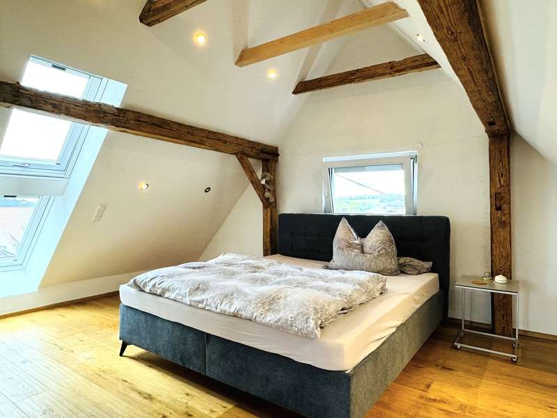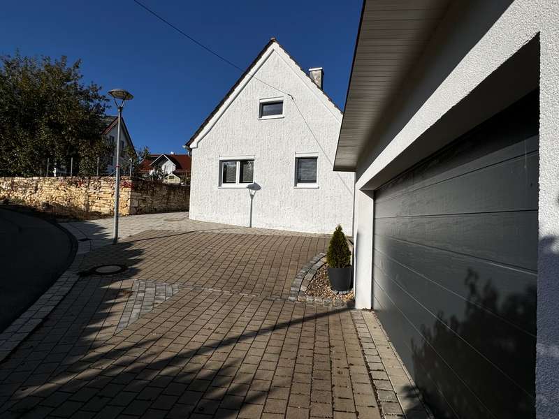 Stylish detached house for couples near Neresheim Experience exclusive living comfort in this detached house. It was extensively renovated to a high standard in 2012 and now impresses with the use of modern and elegant materials as well as a tasteful, open-plan design that is perfectly tailored to the needs of couples. The property offers approx. 115 m² of living space on a plot of approx. 289 m². The first floor is where life takes place during the day. The cooking and dining area with a gas stove is ideal for those who like to cook often. The Swedish stove and TV connection not only create a cozy and practical atmosphere, but also provide additional warmth on cooler evenings and entertainment during preparations. In the bathroom you will find natural stone tiles made of fine travertine and a walk-in shower, which, in combination with the integrated sauna, create the ideal wellness area. The room also offers direct access to the terrace, from where you can enjoy the fresh air after a sauna session. A further, self-contained room, which could be used as a bedroom, office or guest room, is also located on this living level. The private retreat area awaits you on the top floor with a spacious combination of living and sleeping area. From here you have access to the large roof terrace, where you can relax at the end of the day. The open-plan design makes the living level particularly bright and friendly. The floors of the living areas are fitted with warm, high-quality oak parquet. Modern double-glazed windows create a bright and friendly atmosphere, while practical roller shutters offer protection from the sun and prying eyes. The house is heated with electricity. However, the existing gas connection and existing pipes in the rooms also offer the option of converting to another heating alternative. There is no cellar. The outdoor areas of this property have also been thoughtfully designed. A low-maintenance plot with a shed offers additional storage space. A garage and parking spaces in front of the house provide ample parking space. The house can be occupied without any renovation work. For safety reasons, however, the addition of fall protection on the roof terrace and in the staircase area on the top floor would be very useful. This property is the ideal choice for couples looking for a stylish and modern living environment with lots of comfort in a quiet rural location. Don't miss the opportunity to discover your new home and get in touch with us using the contact form. Please have your general financing confirmation ready for a viewing.