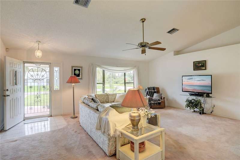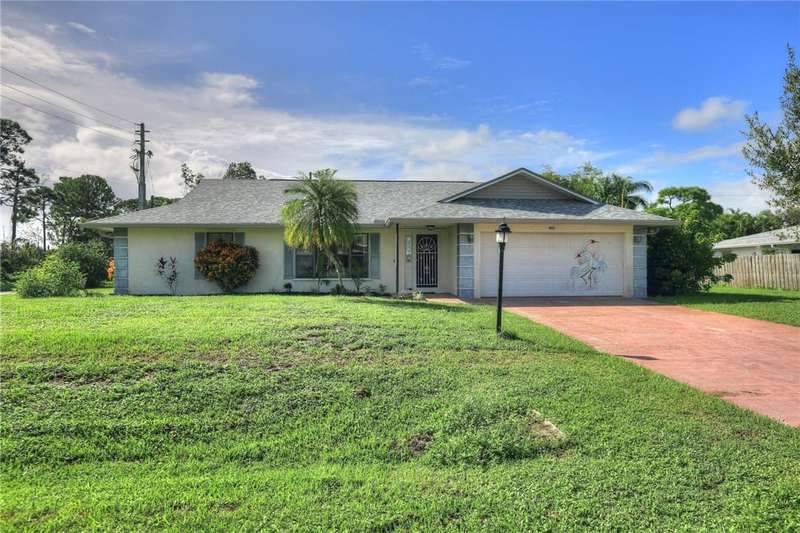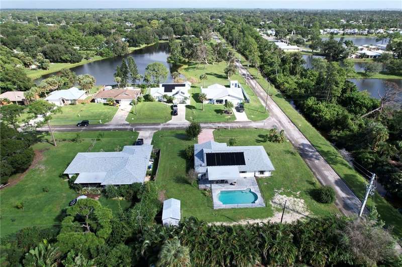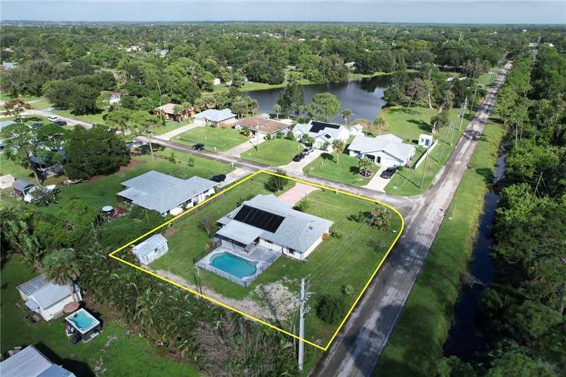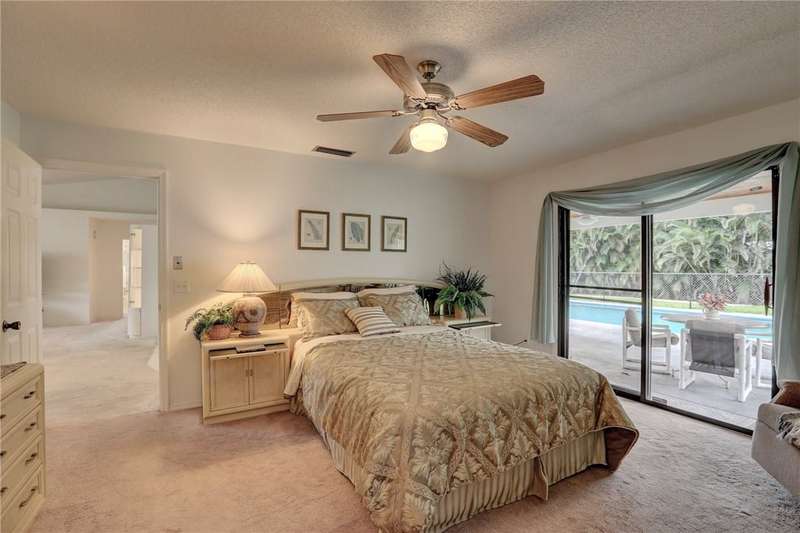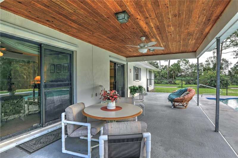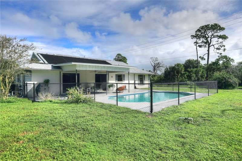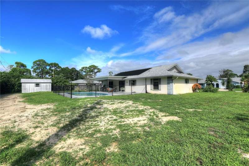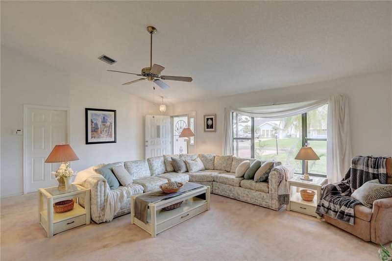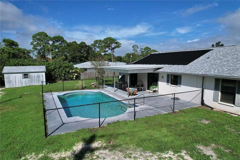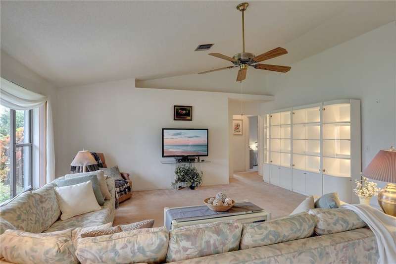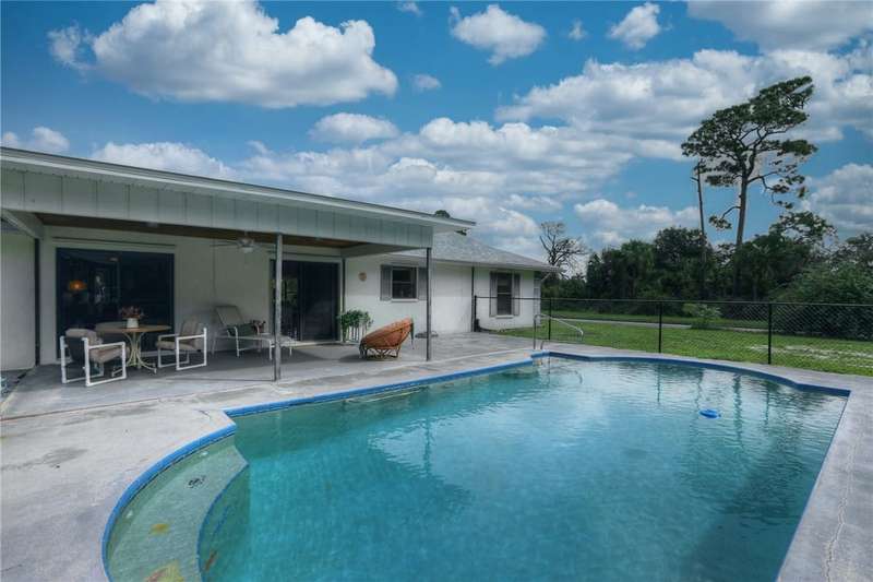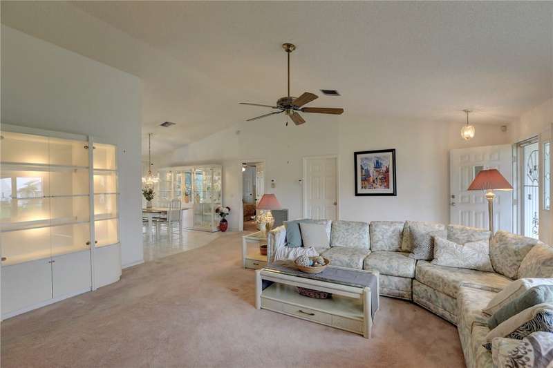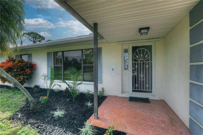 Original-owner home tucked on a quiet corner lot surrounded by lush areca palms, lakes & open green space. Concrete block construction with a 2025 roof, 2023 A/C, new gutters, soffits, skylight & an inground solar-heated pool ready for year-round enjoyment. Sunny living rm w/vaulted ceilings & split bedroom floor plan. Two sets of sliders lead to a covered porch with a wood plank ceiling overlooking the pool & oversized yard. Primary suite w/updated bath, pool access & walk-in closet. Bonus shed with window AC unit makes an ideal workshop. Can even be sold with nearly all furnishings/contents!