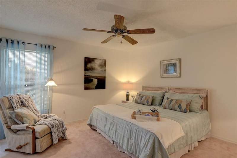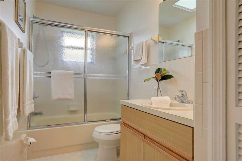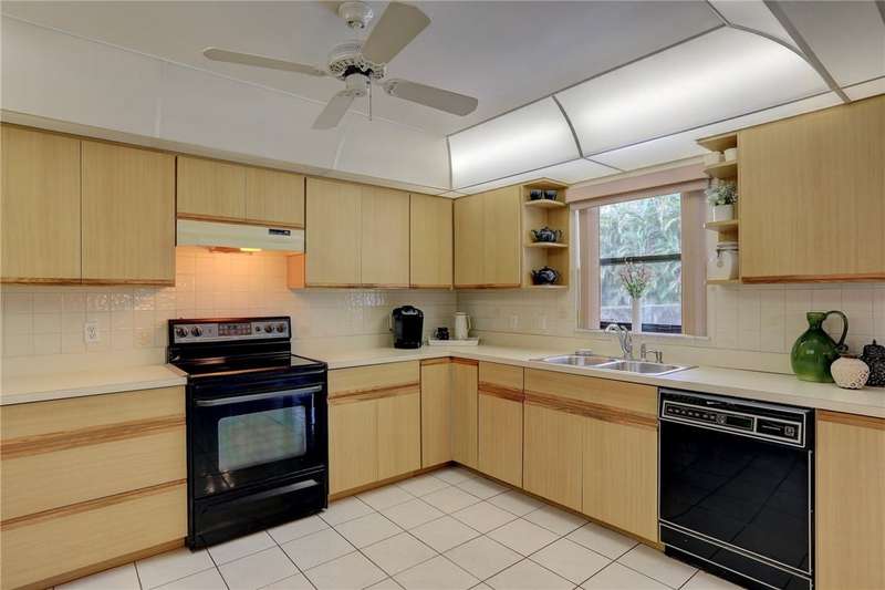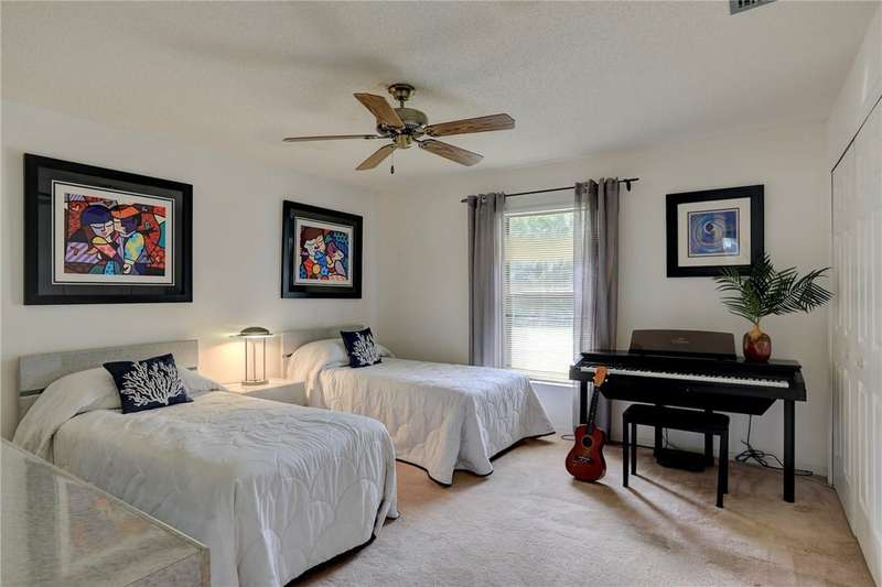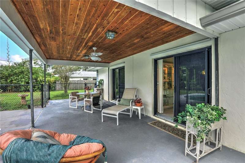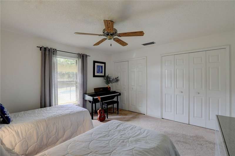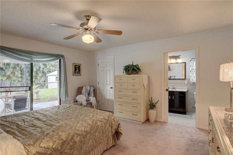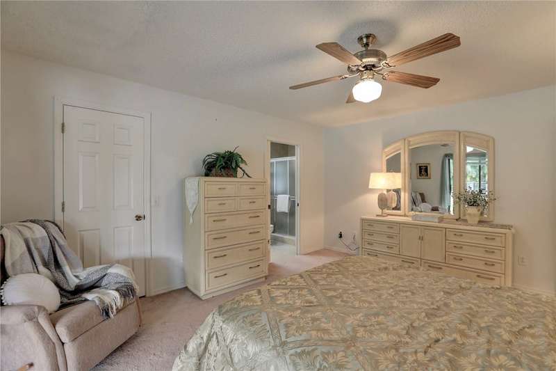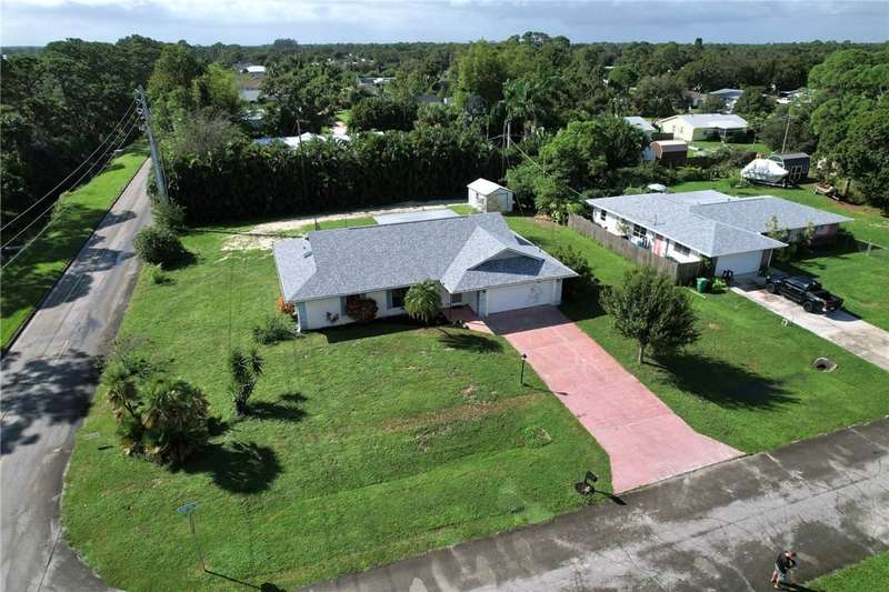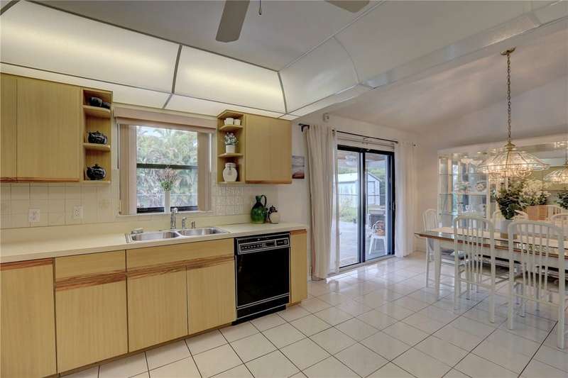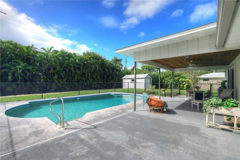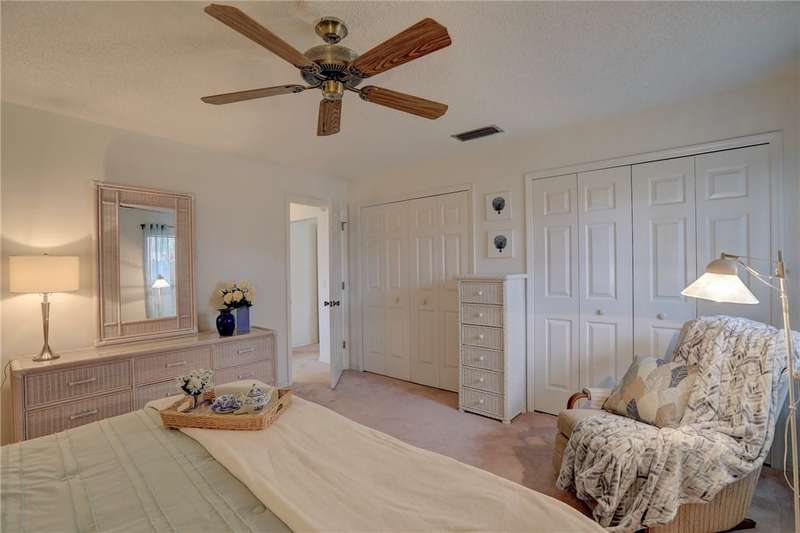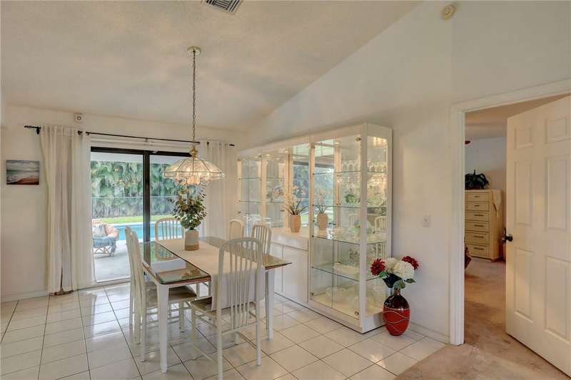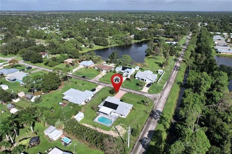 Original-owner home tucked on a quiet corner lot surrounded by lush areca palms, lakes & open green space. Concrete block construction with a 2025 roof, 2023 A/C, new gutters, soffits, skylight & an inground solar-heated pool ready for year-round enjoyment. Sunny living rm w/vaulted ceilings & split bedroom floor plan. Two sets of sliders lead to a covered porch with a wood plank ceiling overlooking the pool & oversized yard. Primary suite w/updated bath, pool access & walk-in closet. Bonus shed with window AC unit makes an ideal workshop. Can even be sold with nearly all furnishings/contents!